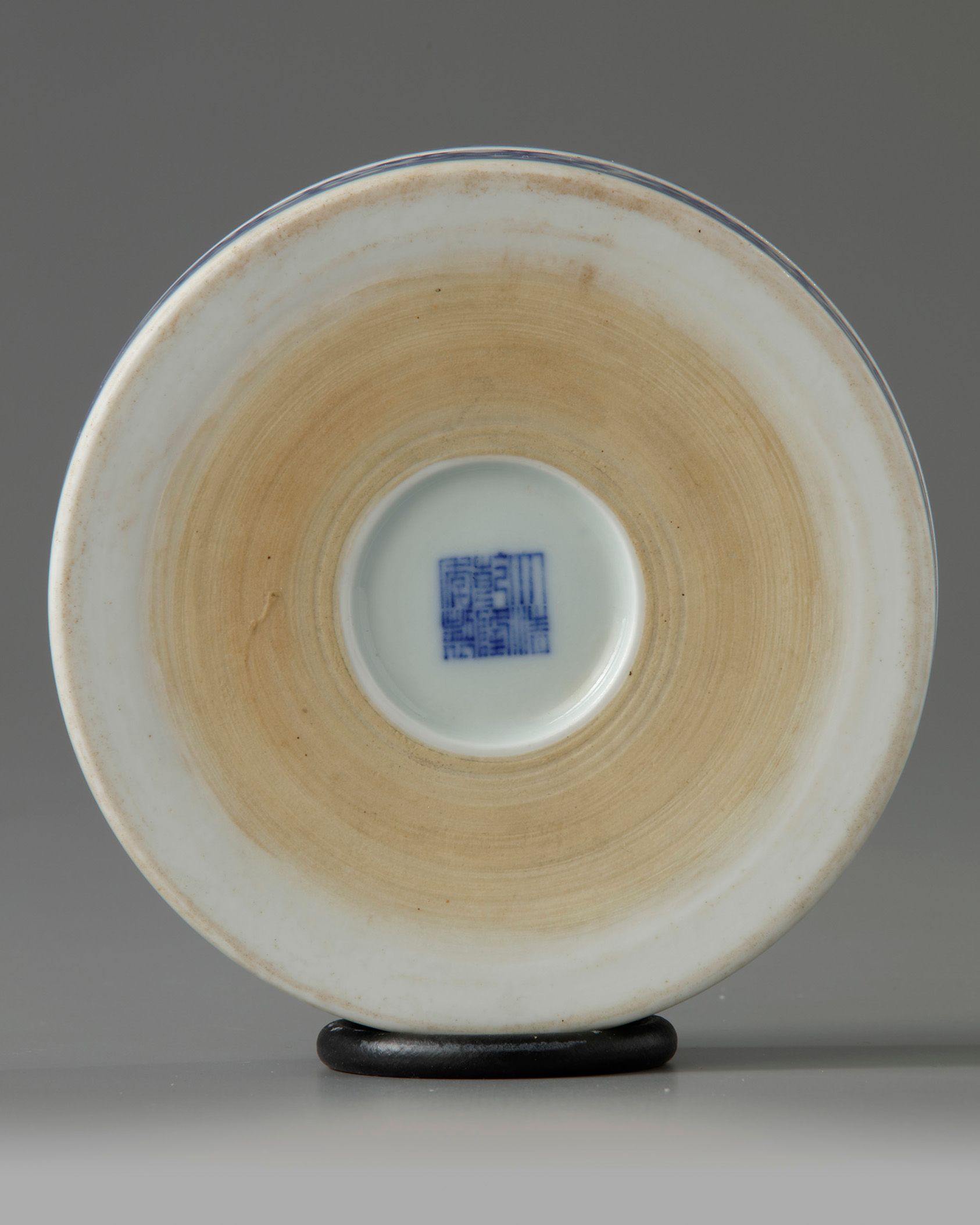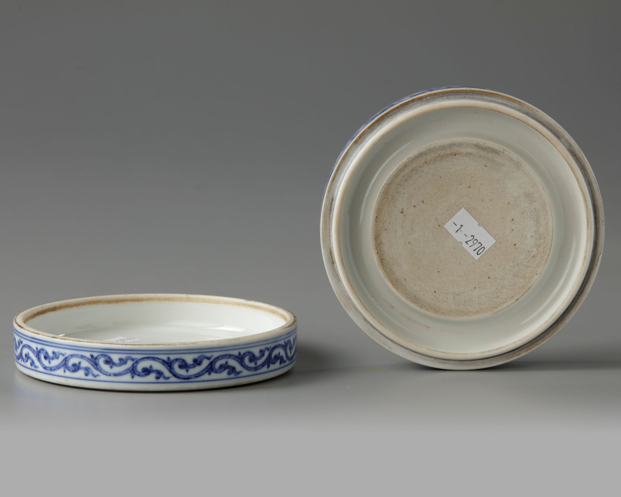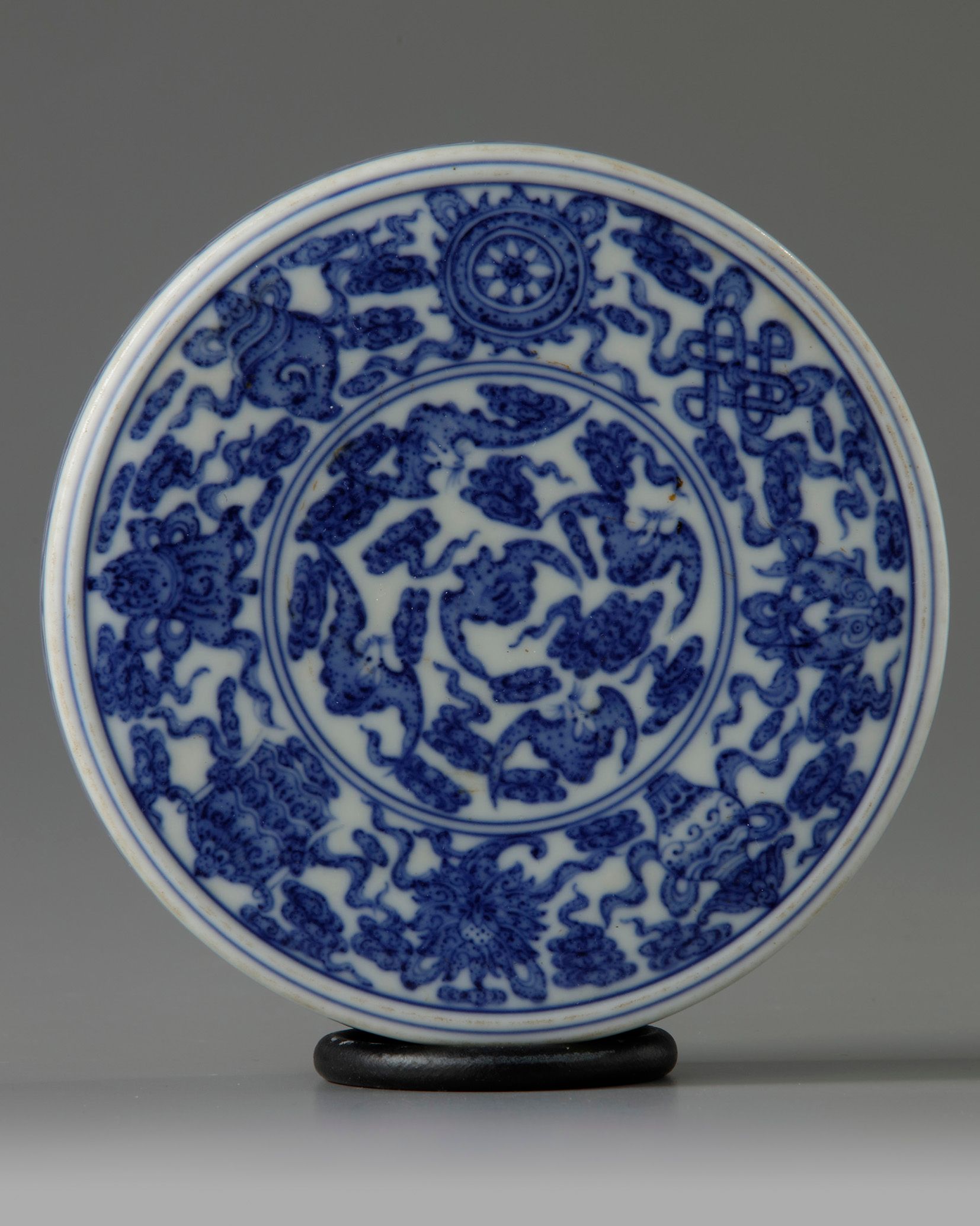 The cover is decorated with a roundel enclosing five bats and clouds, surrounded by the Eight Buddhist Emblems amongst further clouds. The straight sides of the cover are decorated with a foliate scroll. The box base is decorated with scrolling lingzhi and an apocryphal Qianlong mark to the base.