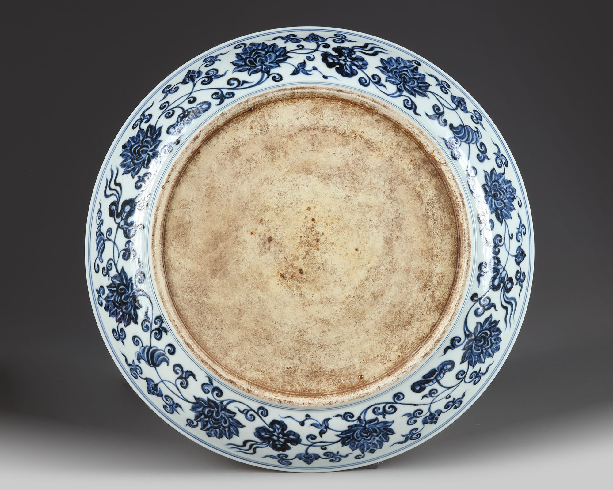 A Chinese porcelain charger, decorated in cobalt blue to the centre and the sides with lotus scrolls amongst foliage. The base is unglazed.