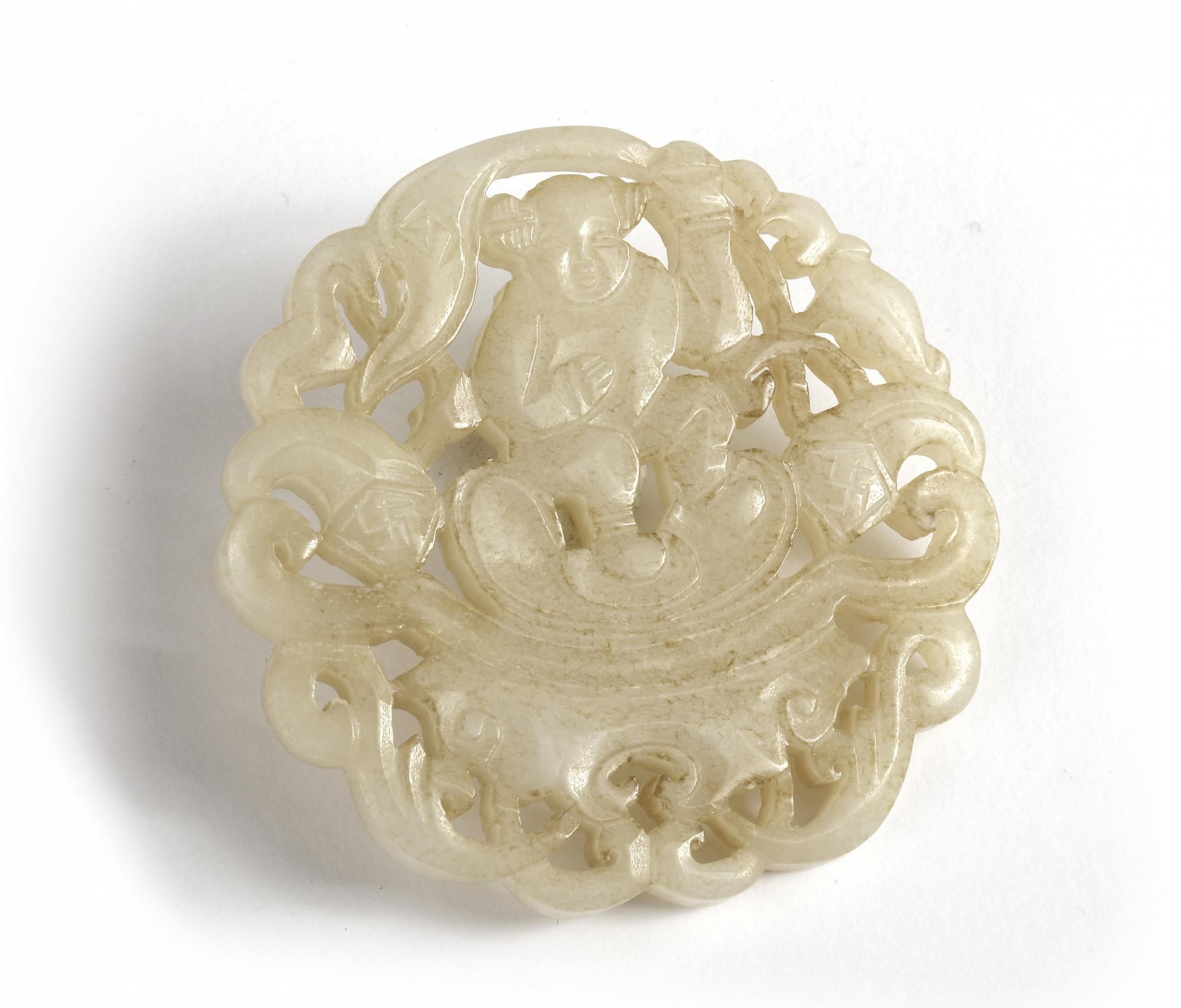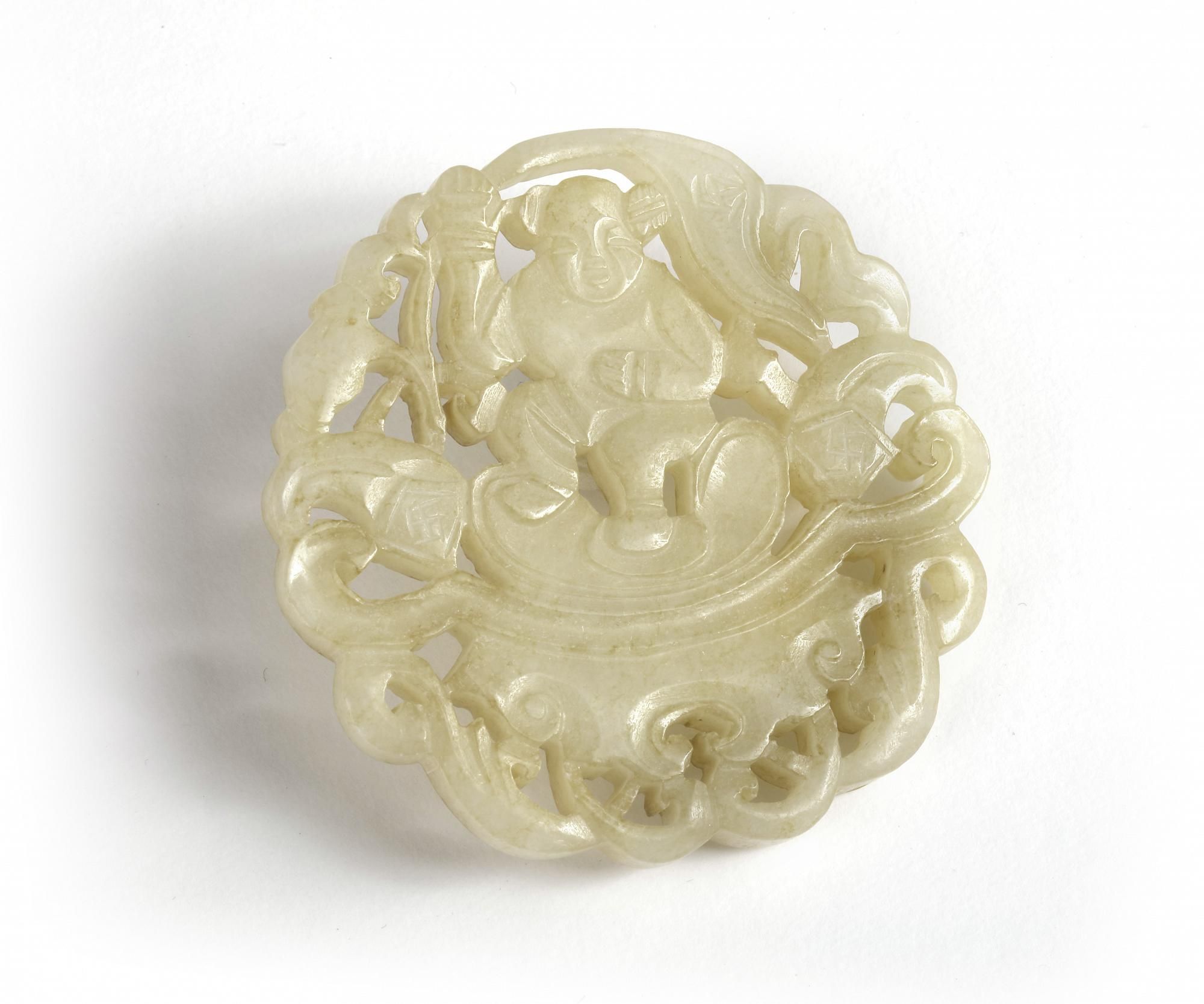 The plaque is carved and pierced with one of the Laughing Twins (Hehe Erxian), smiling and holding one hand up in the air supporting a box, with his feet standing on an ingot, all on an openwork ground.