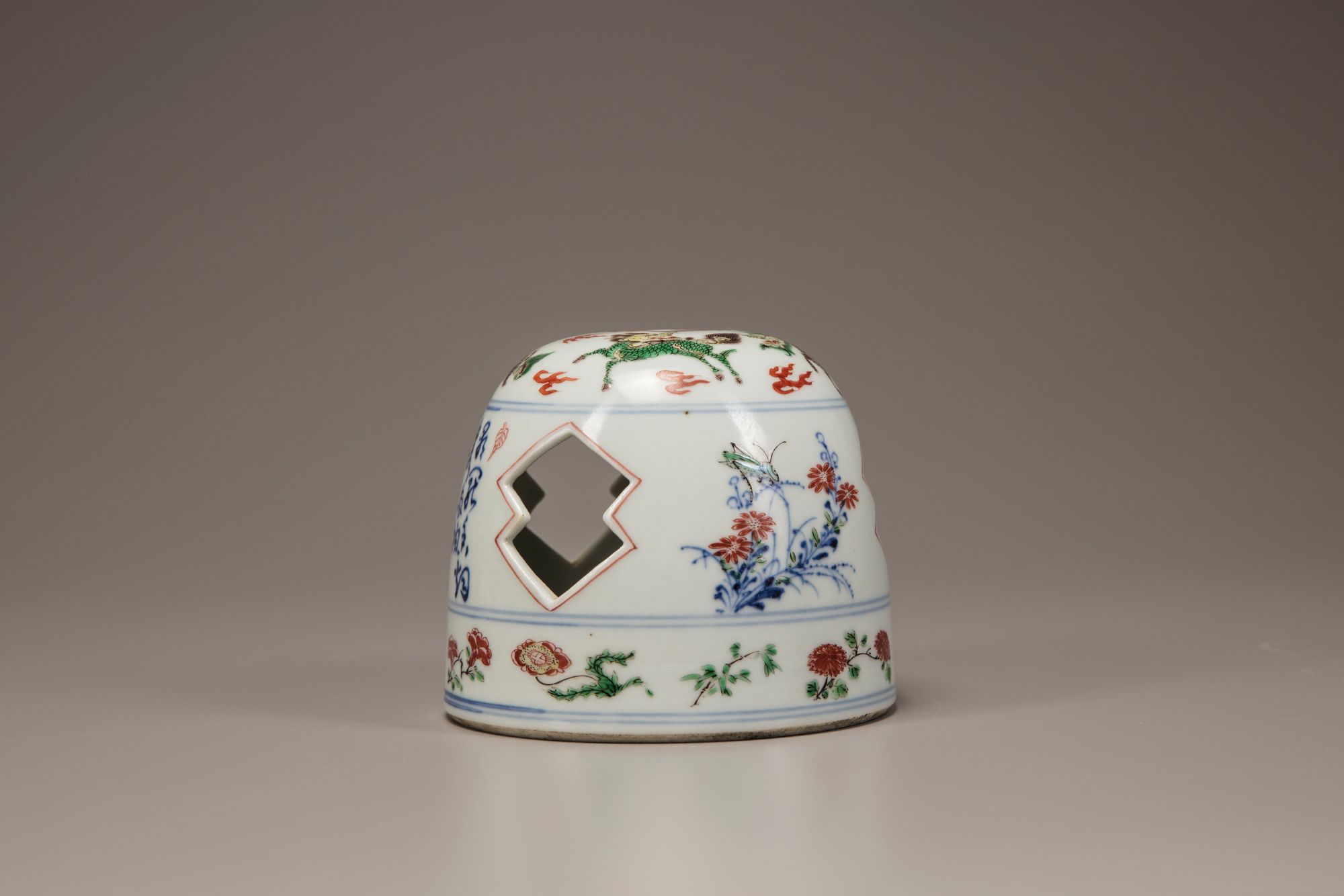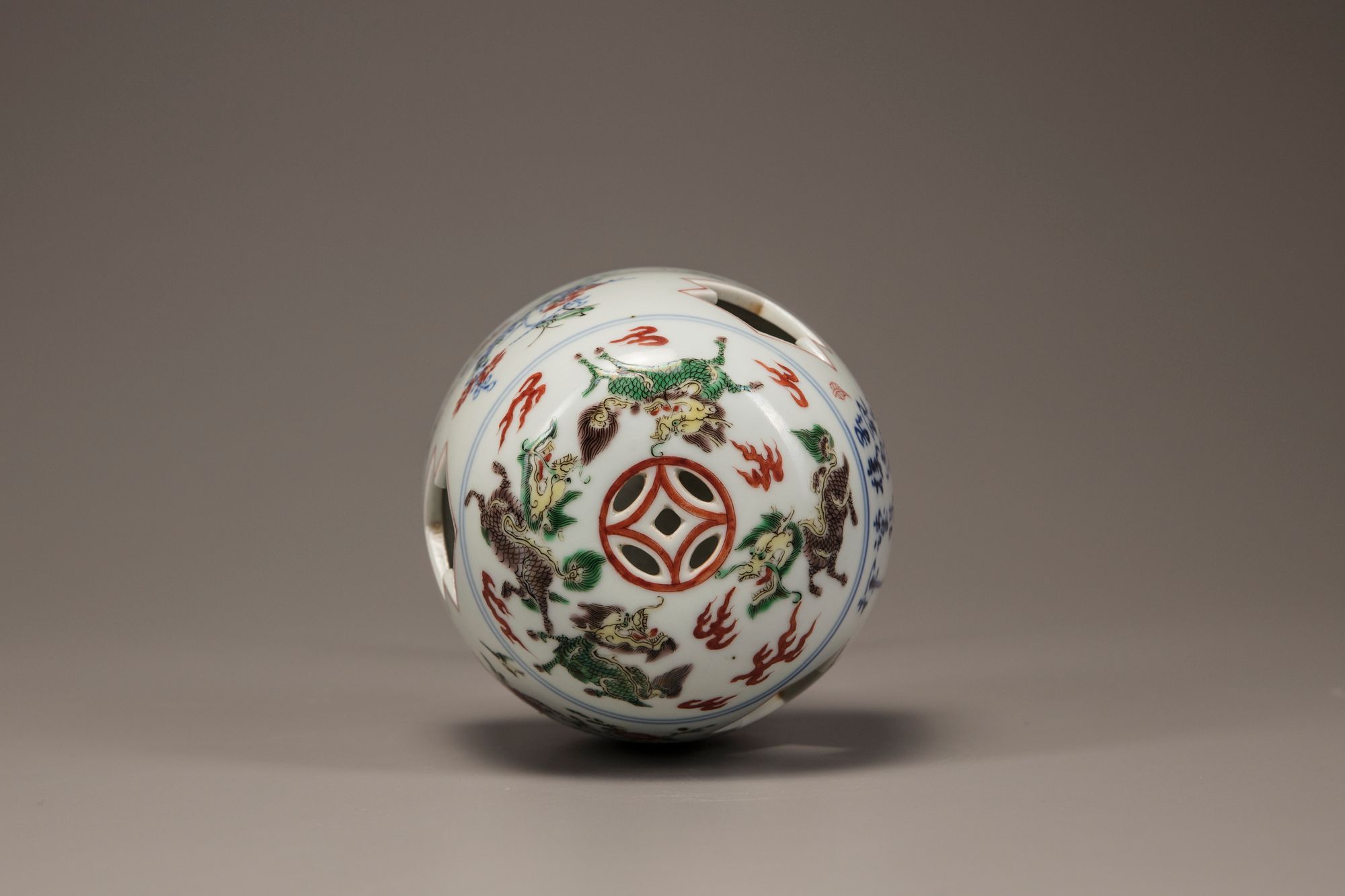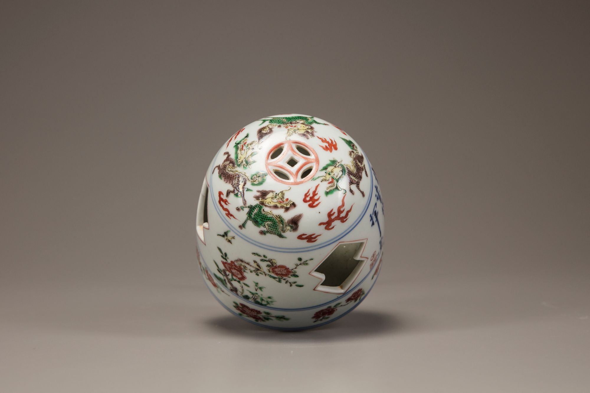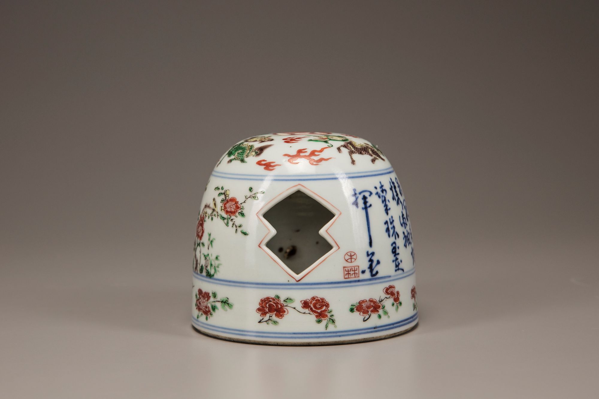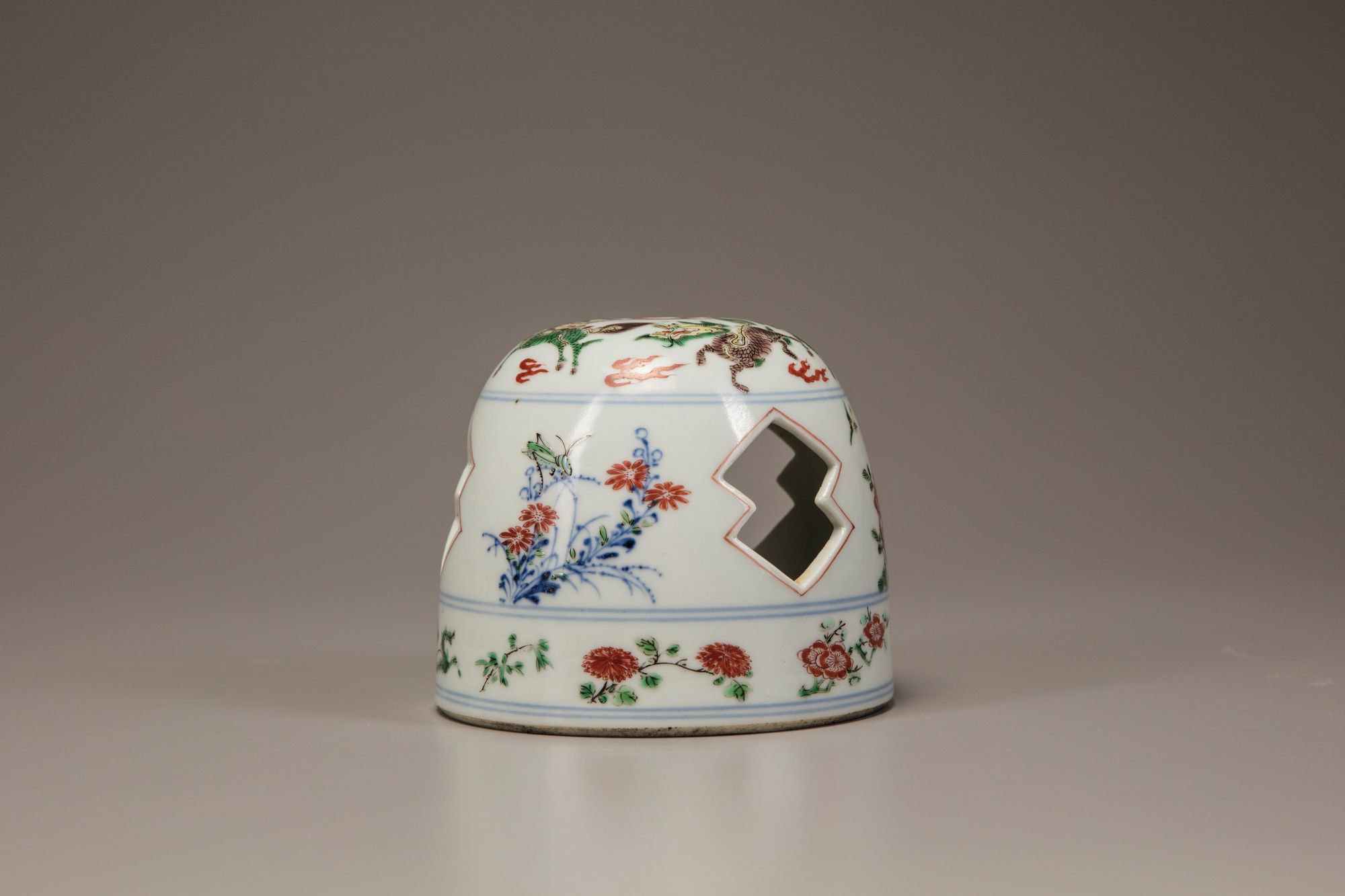 The vessel is decorated to the top with a pierced cash symbol surrounded by qilin amongst fire scrolls. The sides are decorated with double-lozenge-shaped apertures, and is inscribed in underglaze blue with two seal marks. The foot is encircled with a band of peony sprays. The base with an apocryphal Xuande mark.