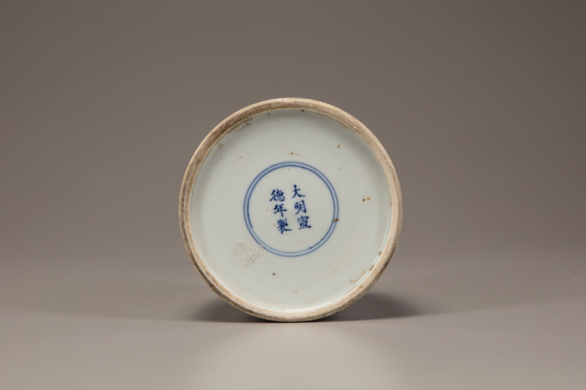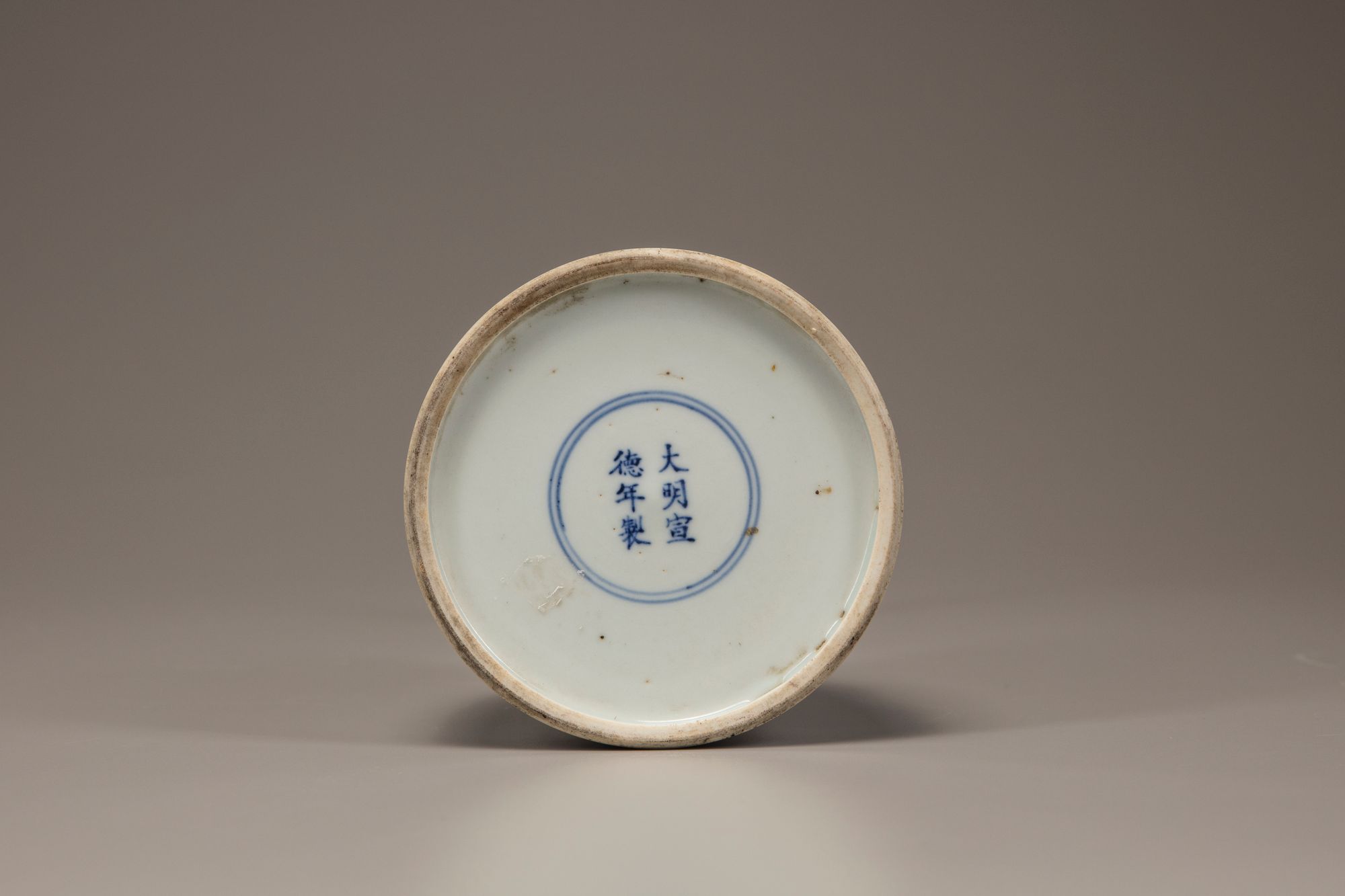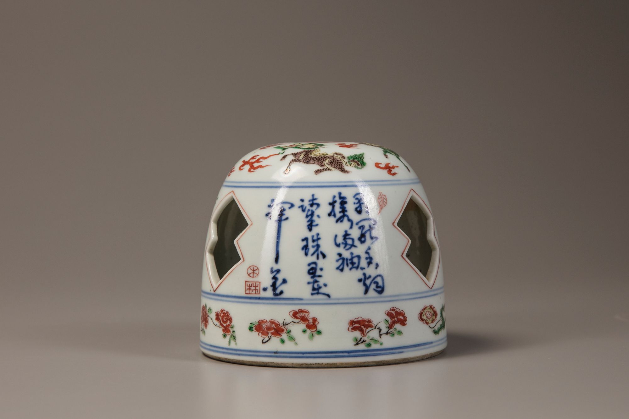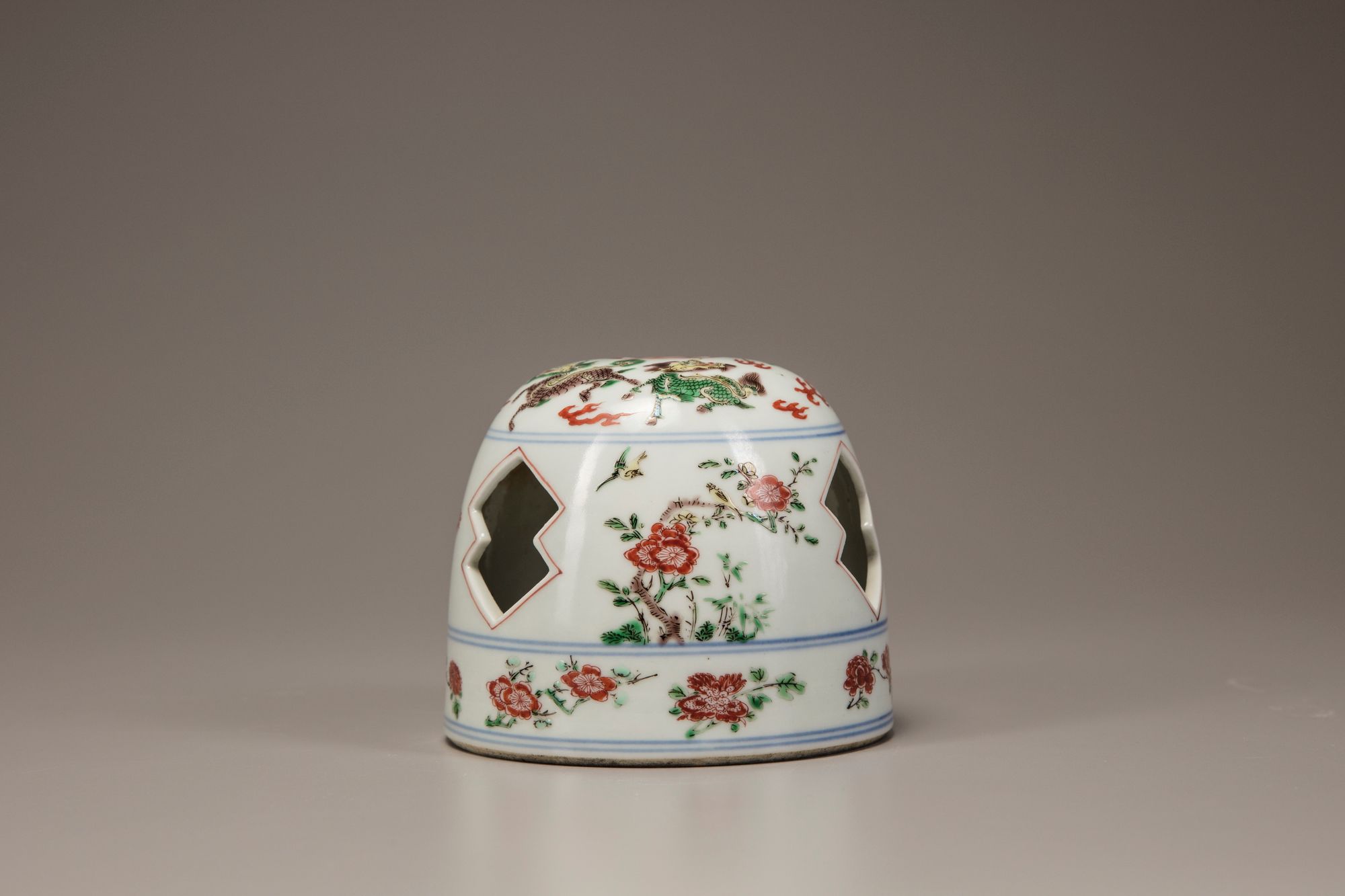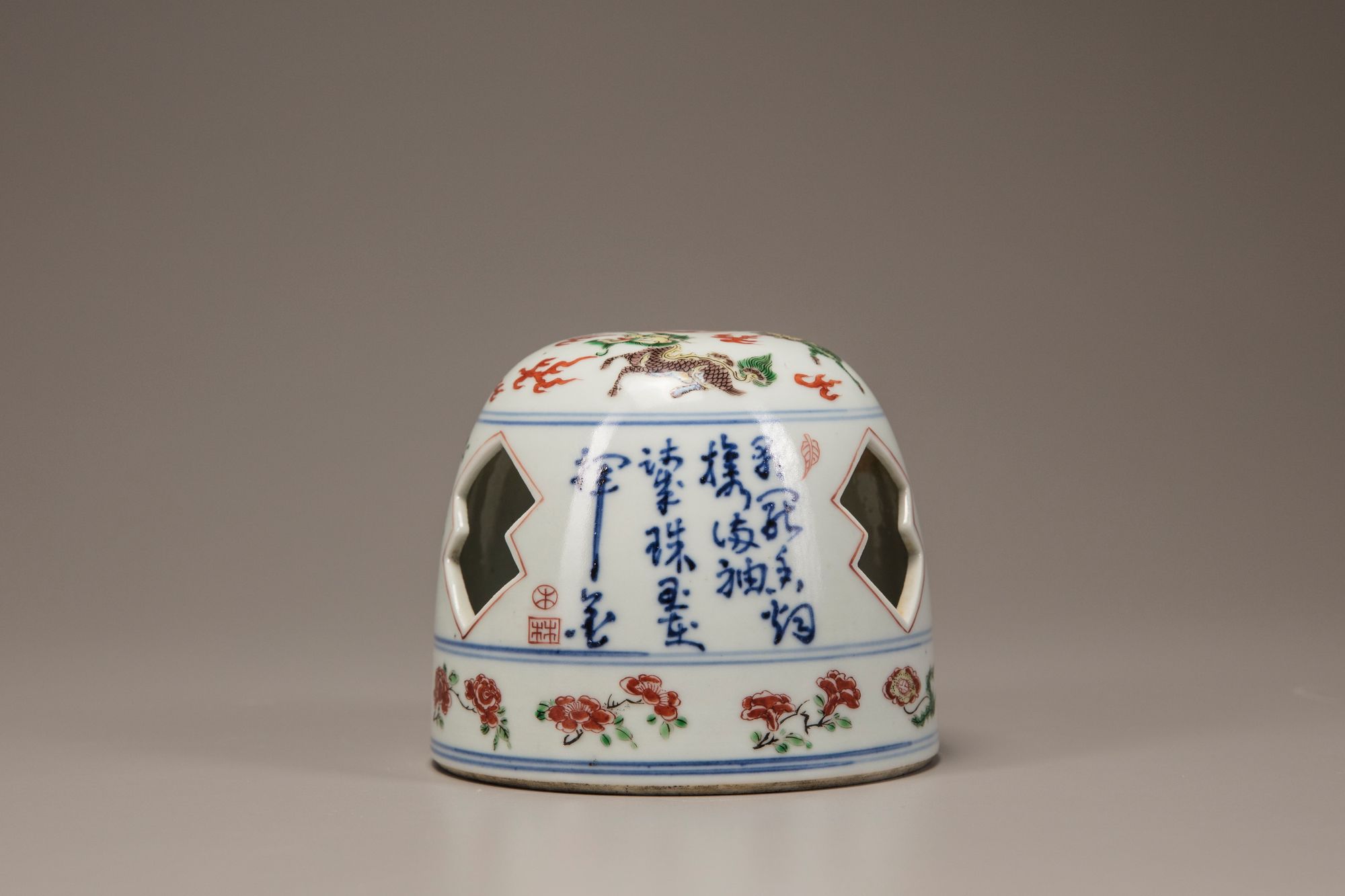 The vessel is decorated to the top with a pierced cash symbol surrounded by qilin amongst fire scrolls. The sides are decorated with double-lozenge-shaped apertures, and is inscribed in underglaze blue with two seal marks. The foot is encircled with a band of peony sprays. The base with an apocryphal Xuande mark.