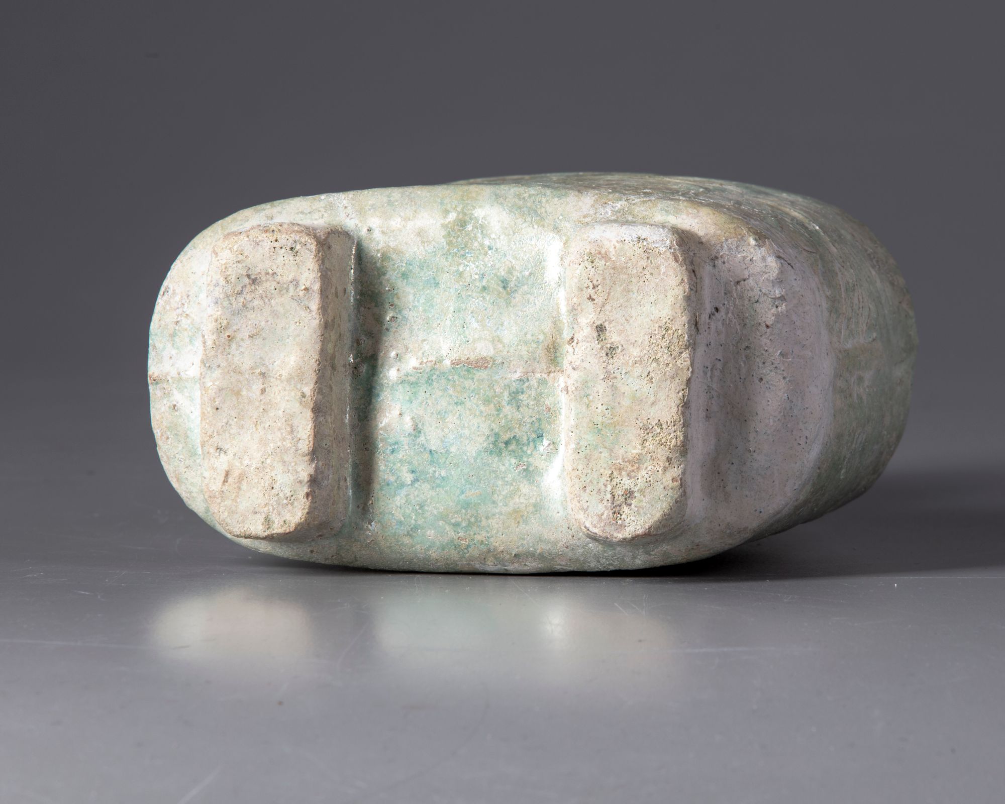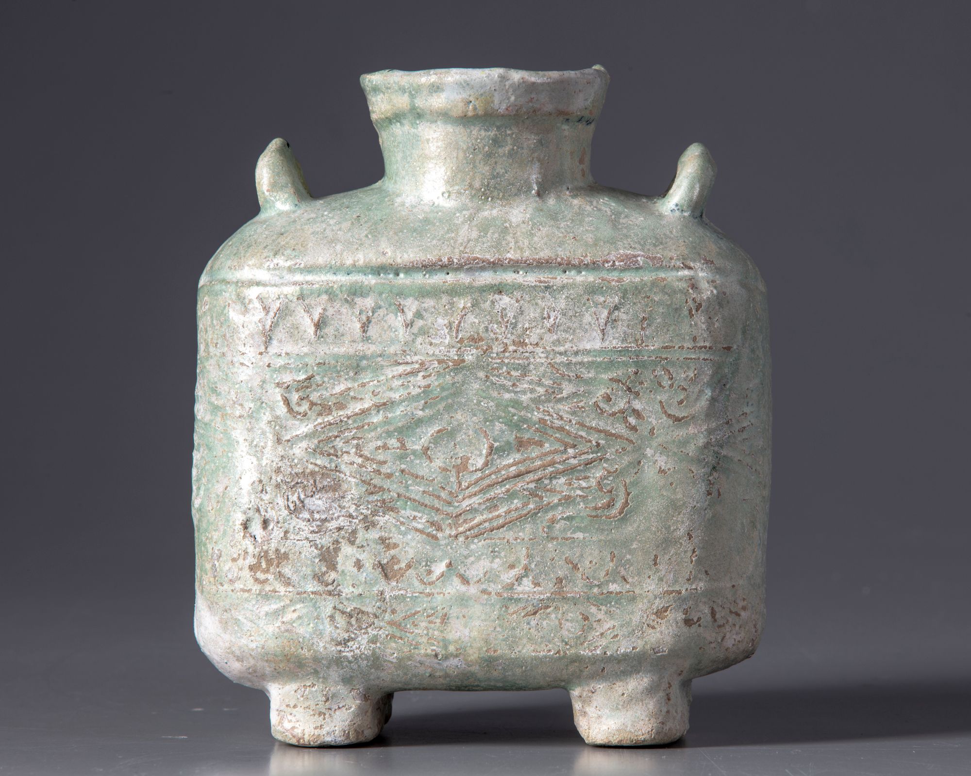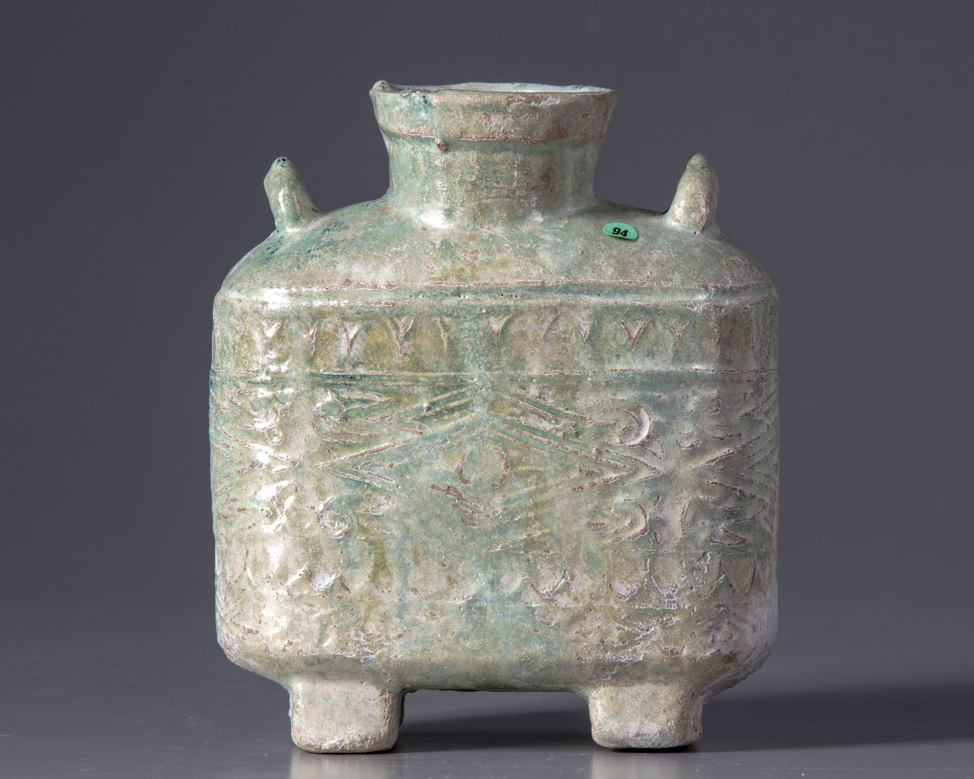 The moulded flask stands on two splayed feet with short neck and two loop handles to the shoulder, decorated in low-relief with geometric shapes and covered with a silvery iridescent green lead glaze.