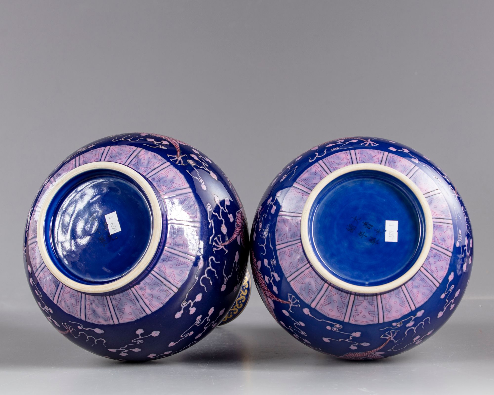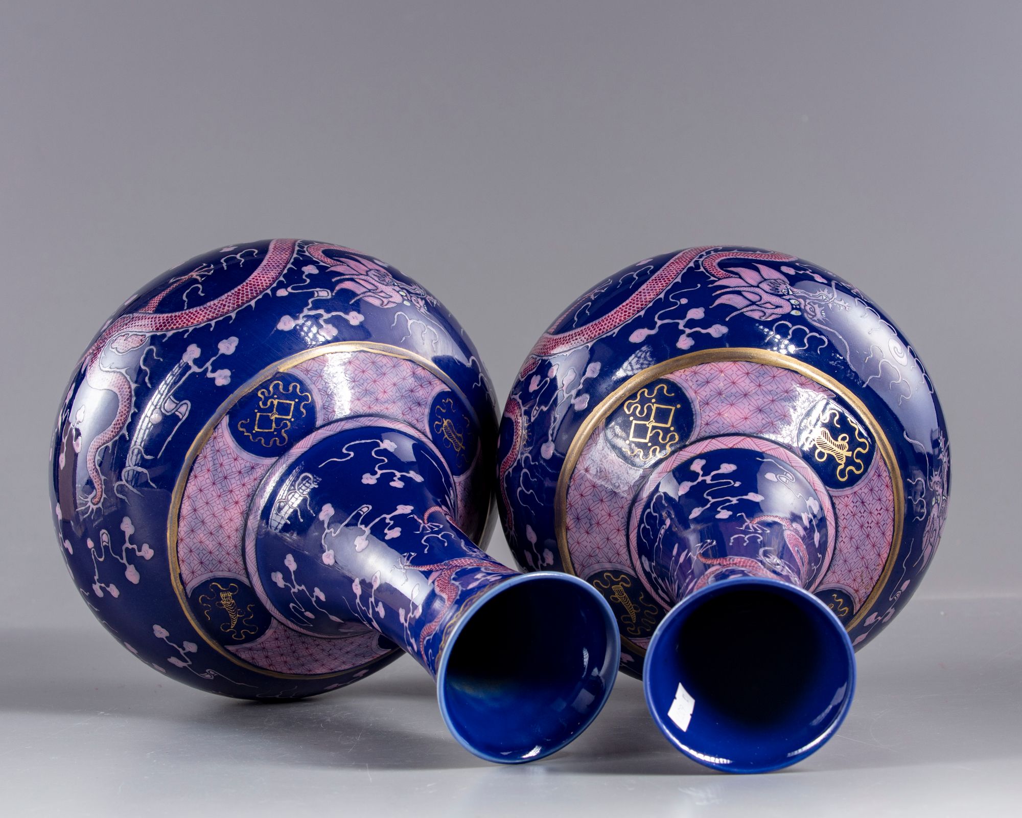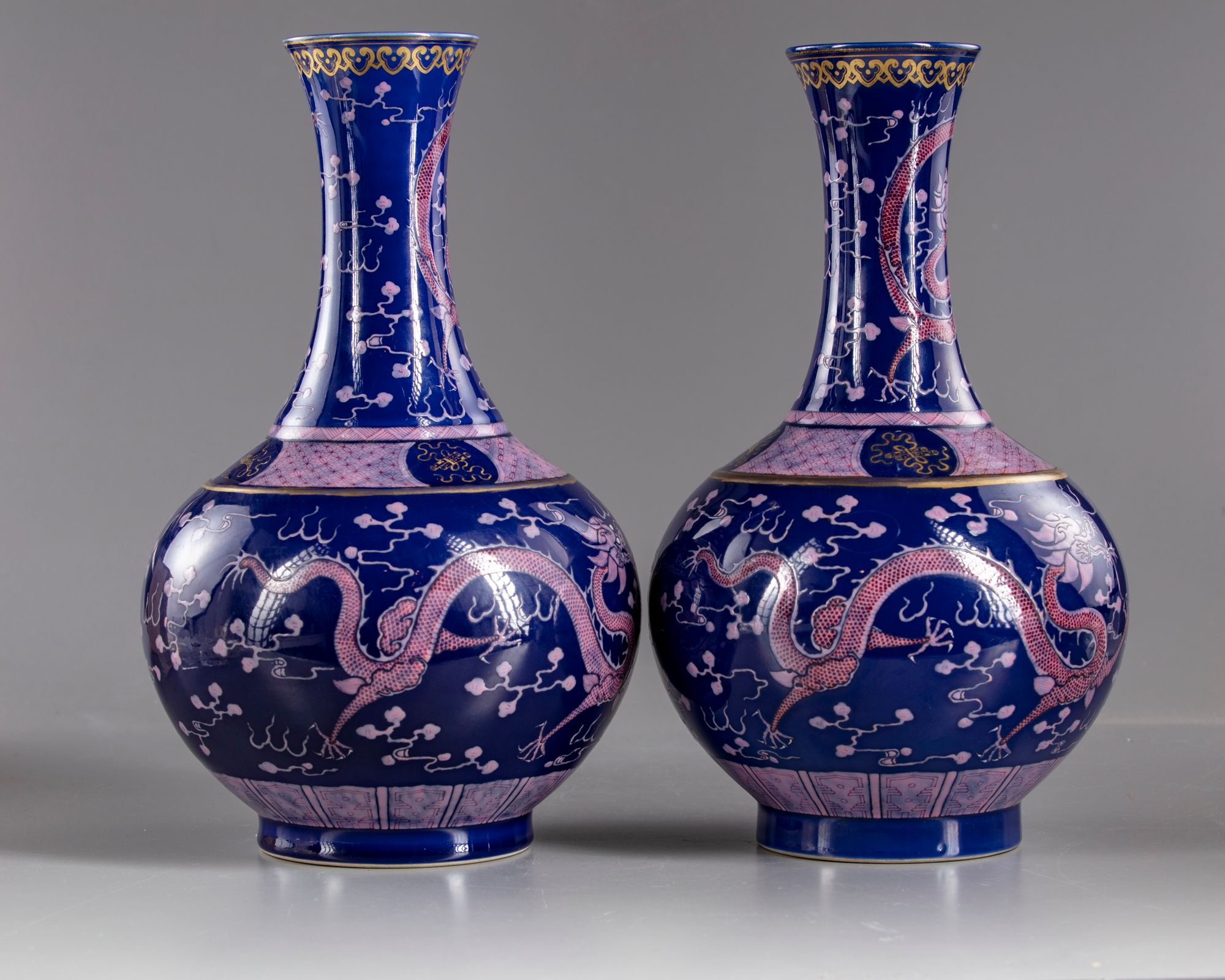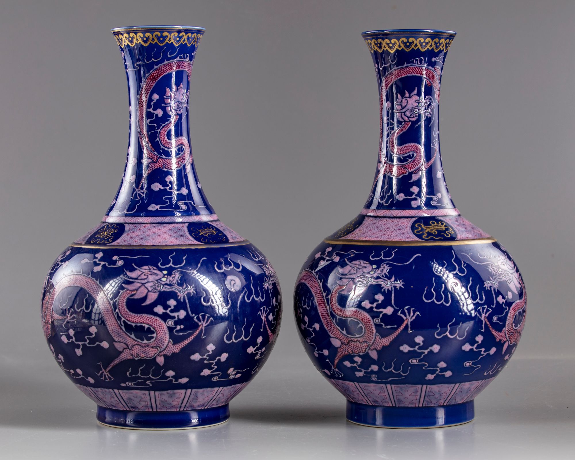 Two Chinese porcelain vases, each decorated with two confronting dragons chasing a flaming pearl amongst clouds above a petal lappet border. The shoulders stylised with a diaper band with panels enclosing Daoist emblems on a flower ground, The neck further painted with a dragon chasing amongst clouds below a band of ruyi heads. The bottom with a Chinese Guangxu six character mark.