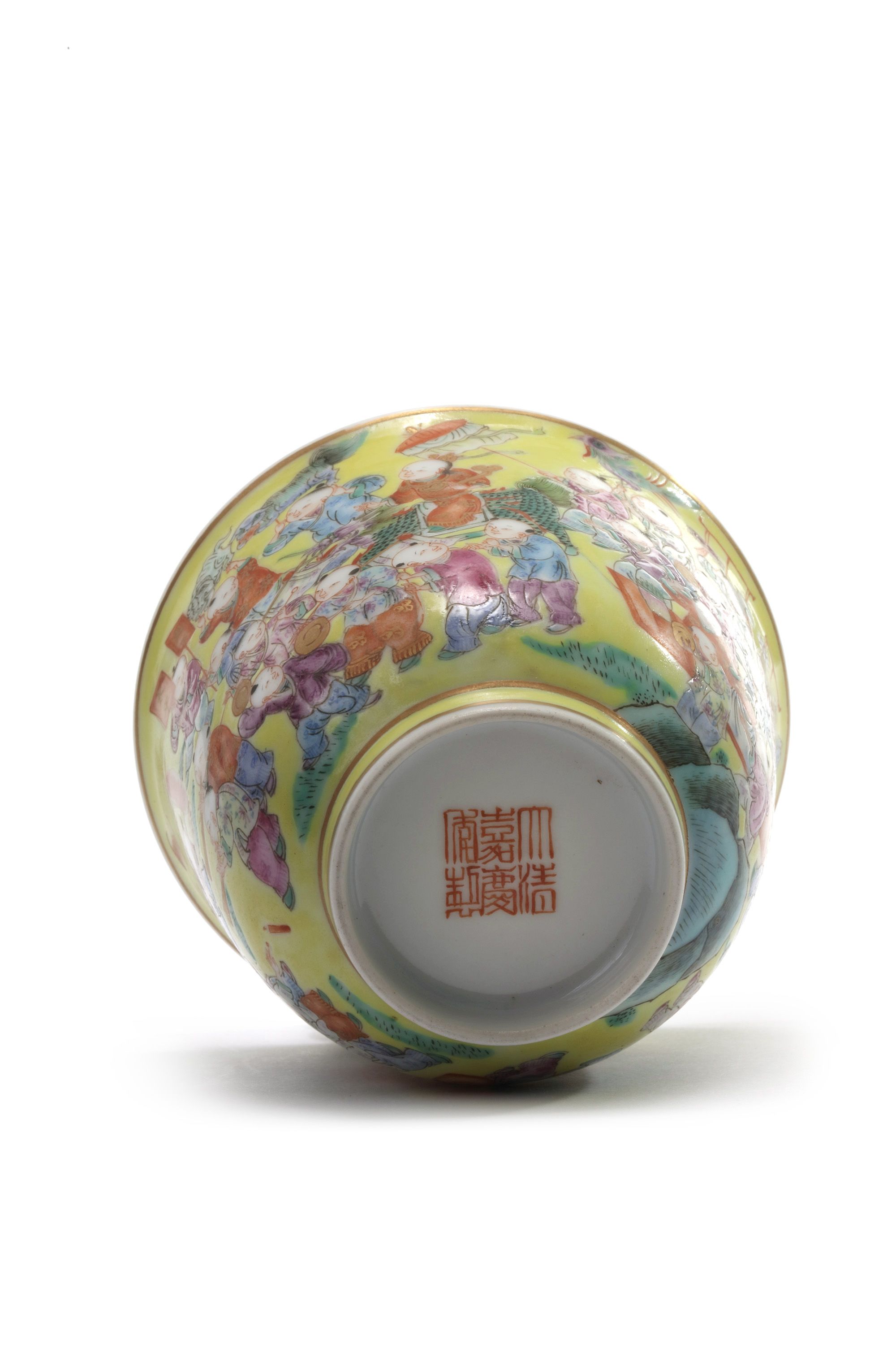 The cup is delicately decorated and gilt with a multitude of boys in a procession, holding lanterns, playing instruments, and one riding a qilin. All reserved on a lemon-yellow ground. The base with an apocryphal Jiaqing mark.