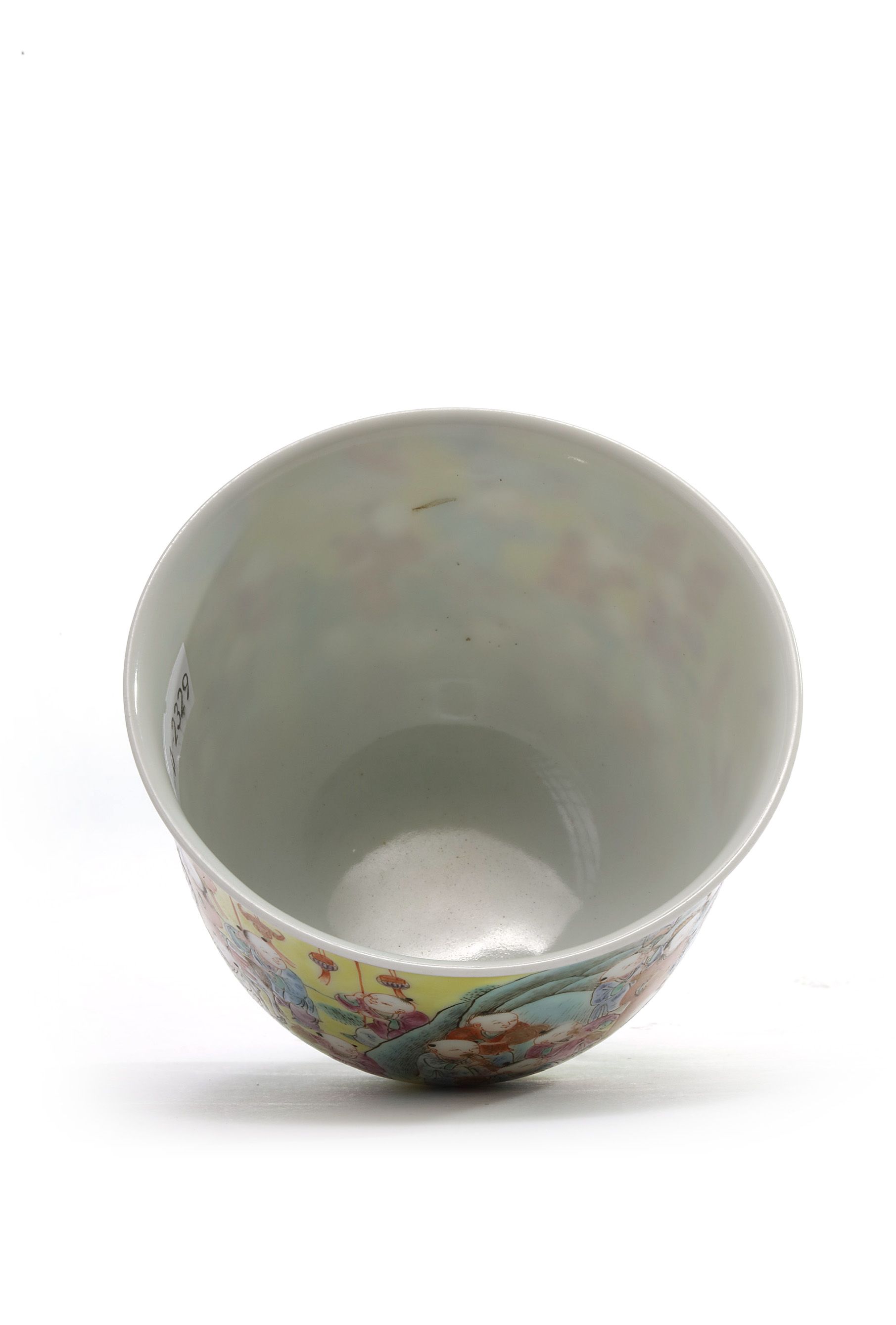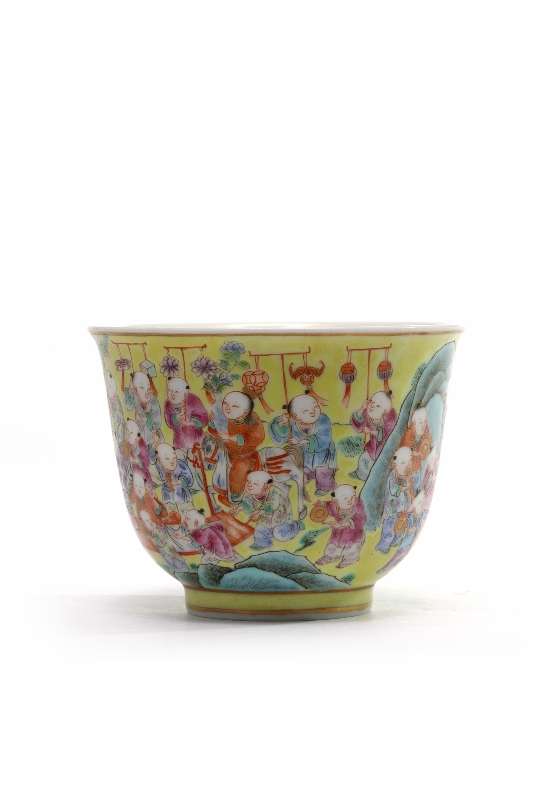 A Chinese yellow-ground famille rose 'hundred boys' cup