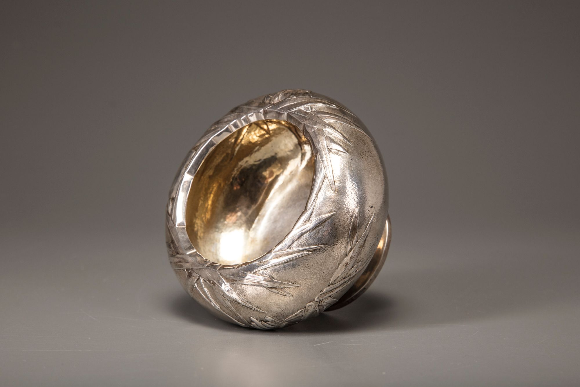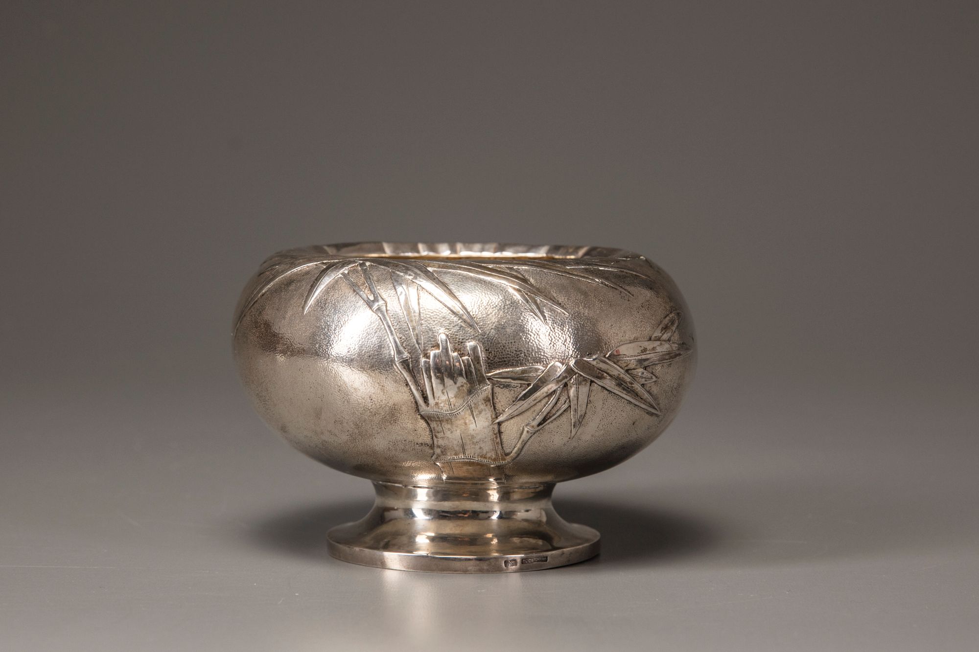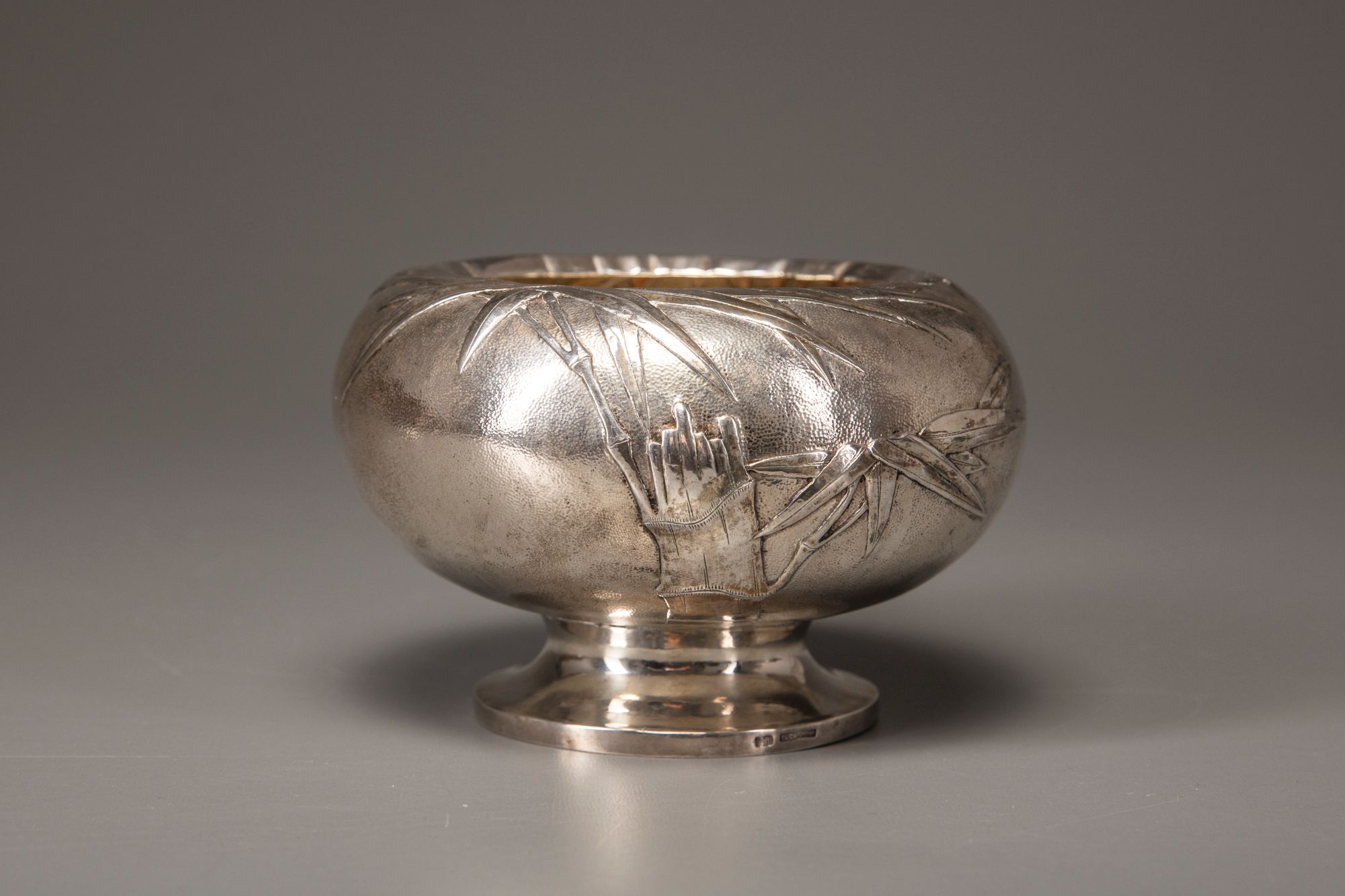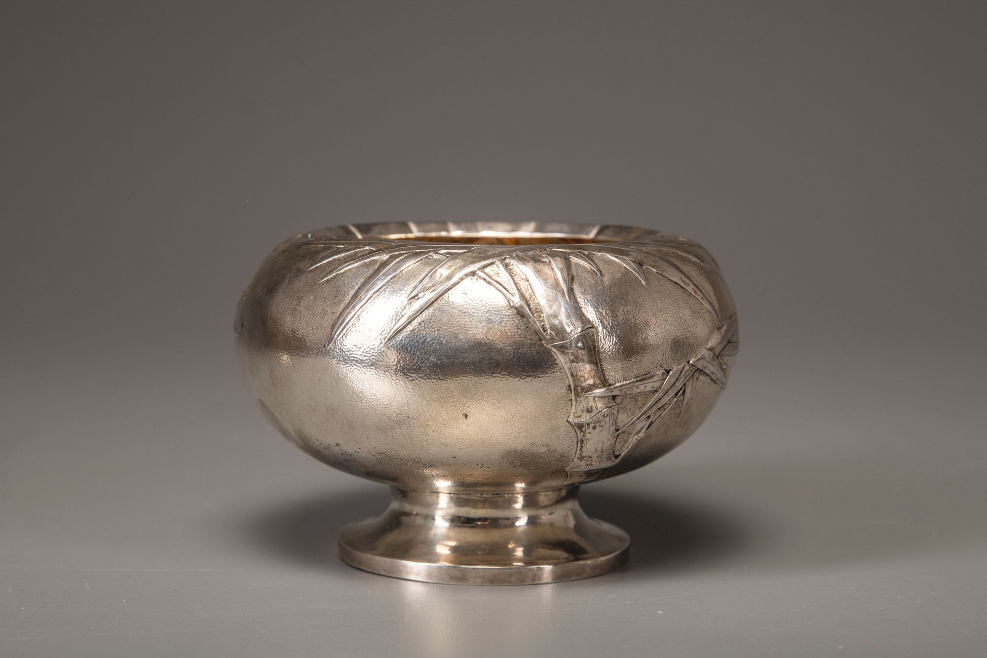The globular bowl stands on a high foot and is decorated in low relief with a sun-shaped cartouche beneath two sprigs of bamboo, all on a textured ground. The base is marked 'TUCK CHANG’ and artisan's mark 'De yi'.