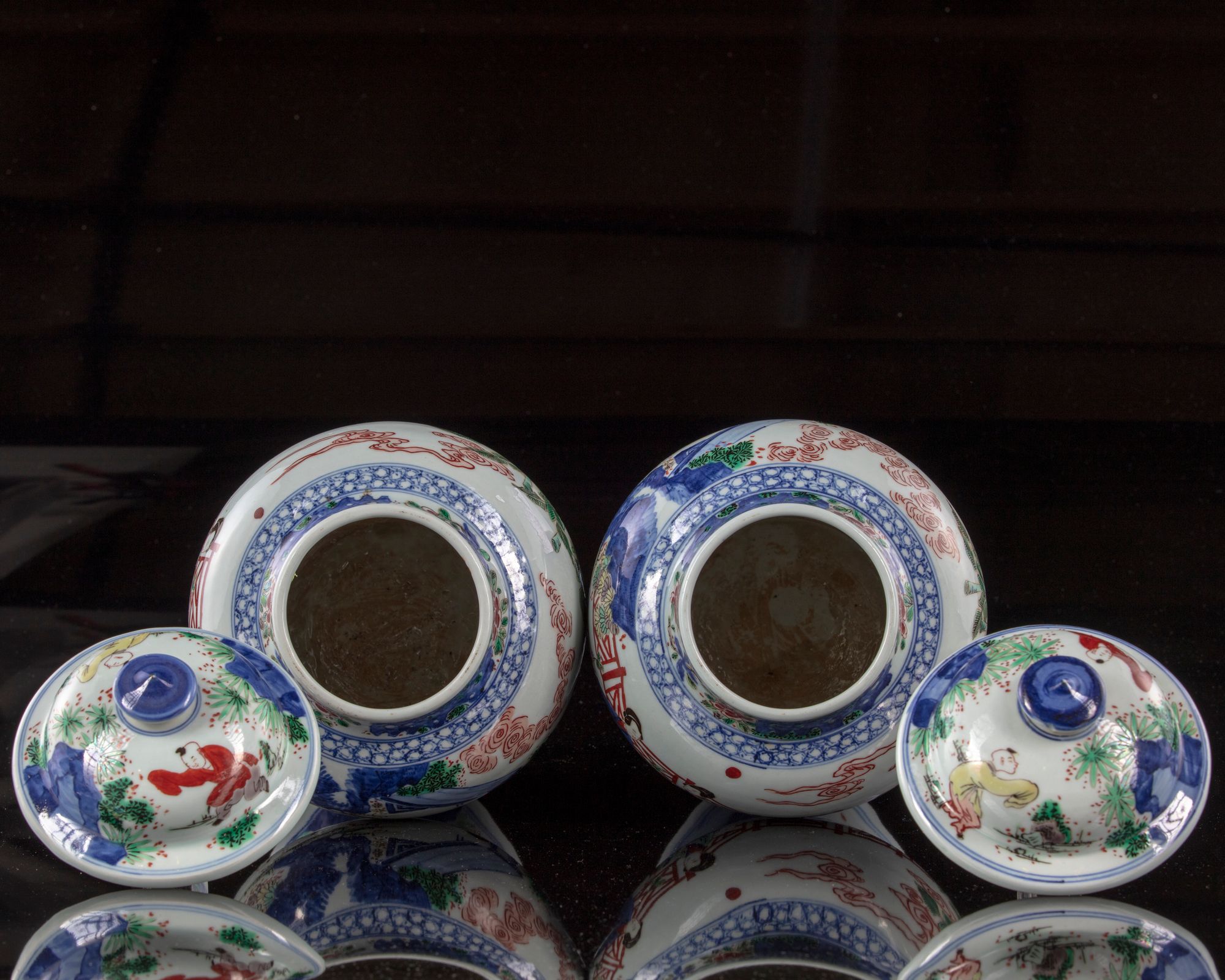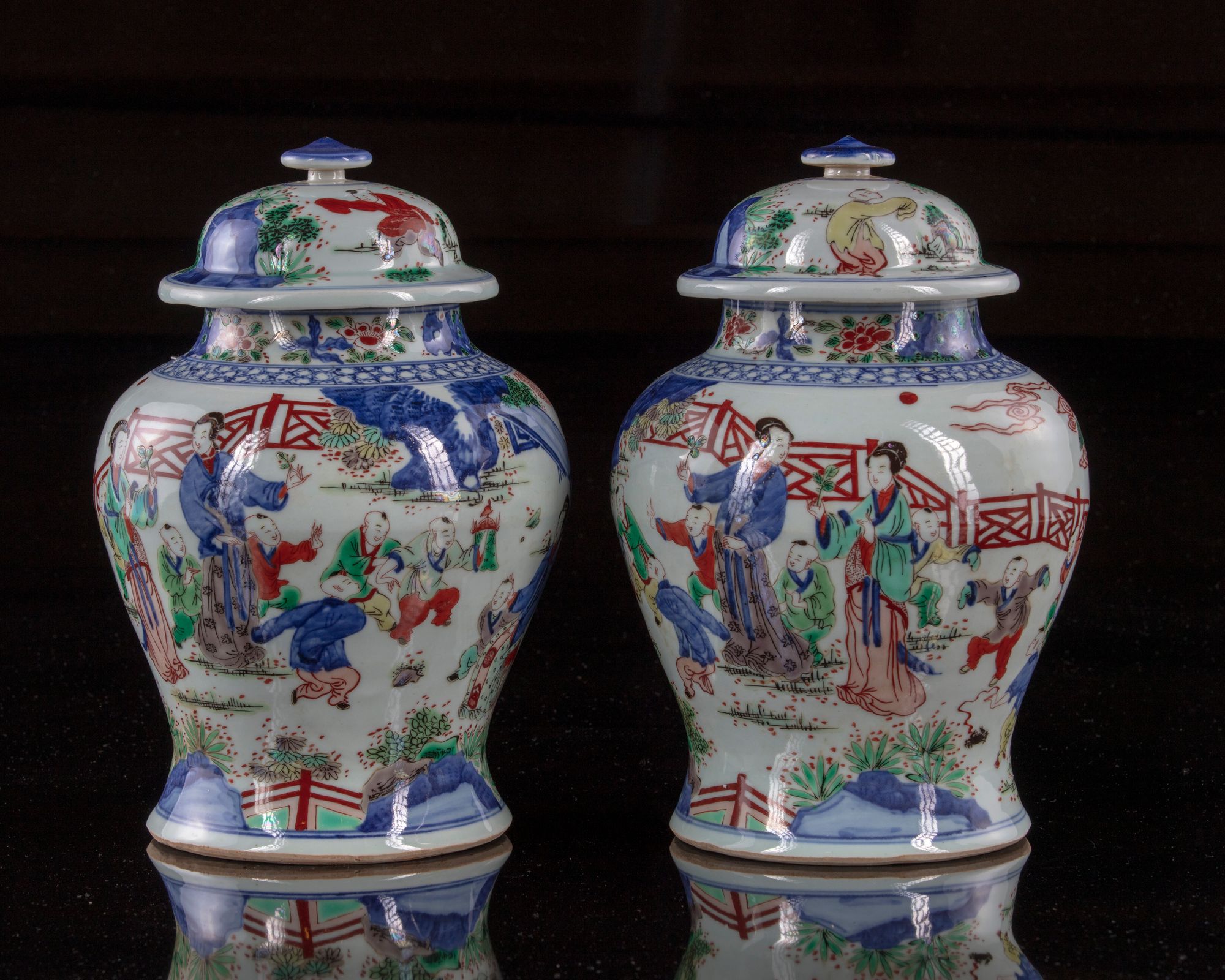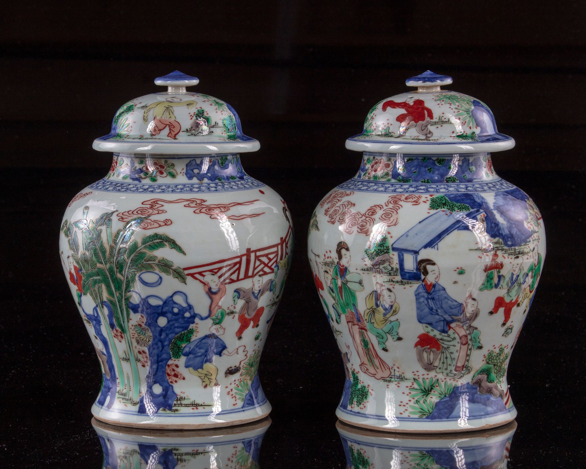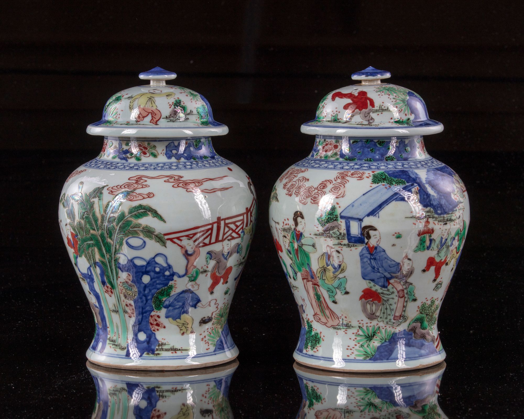 Each vase is decorated with ladies and boys at leisure in a garden setting. The cover is decorated with further boys, and is surmounted by a lotus bud finial.