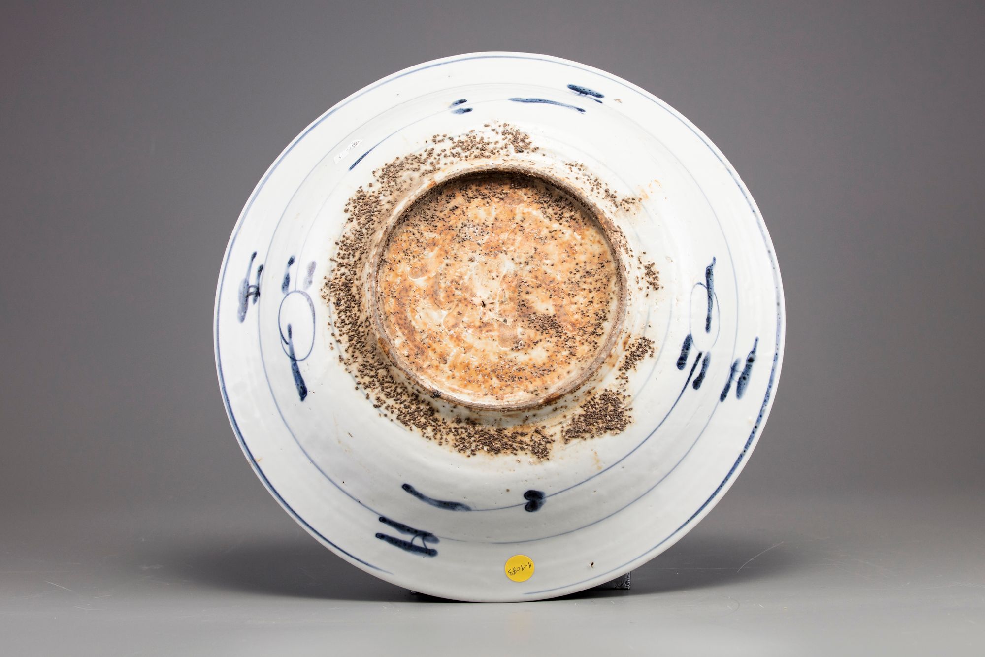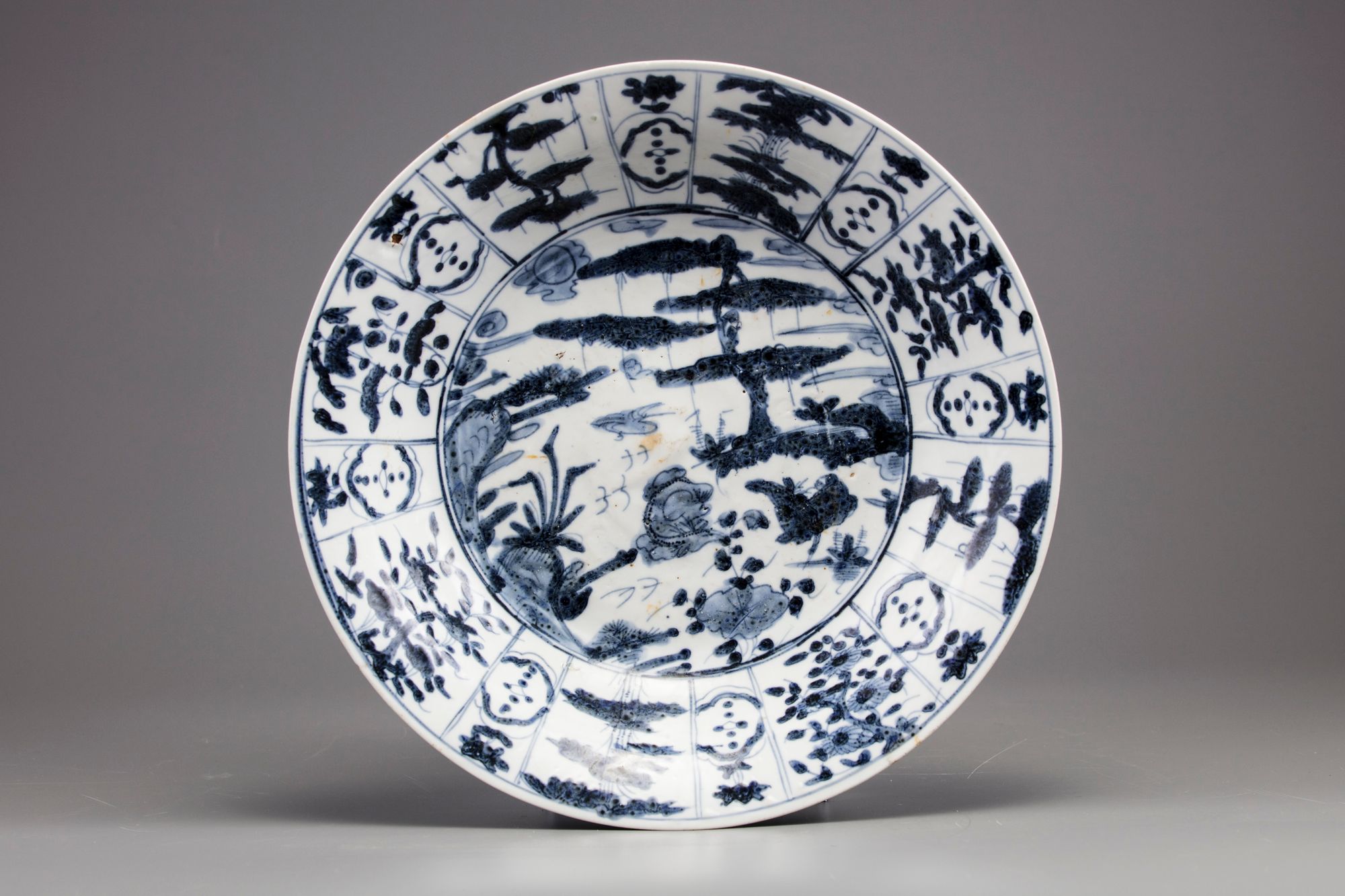 The interior of the dish is decorated with two deer under pine, with a bird in flight. The scene is surrounded by a border of flowers, trees and patterned panels. The reverse with stylised decoration.