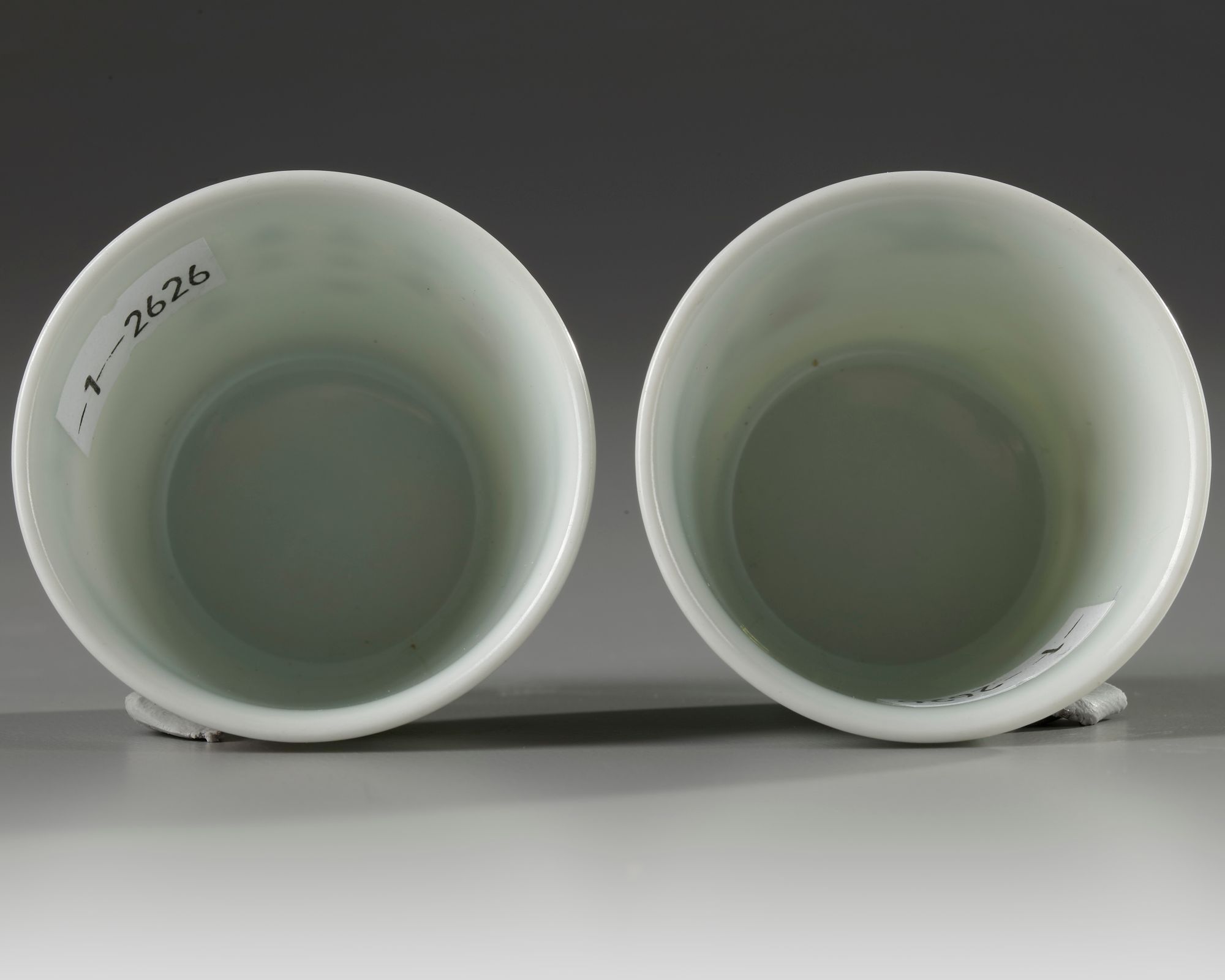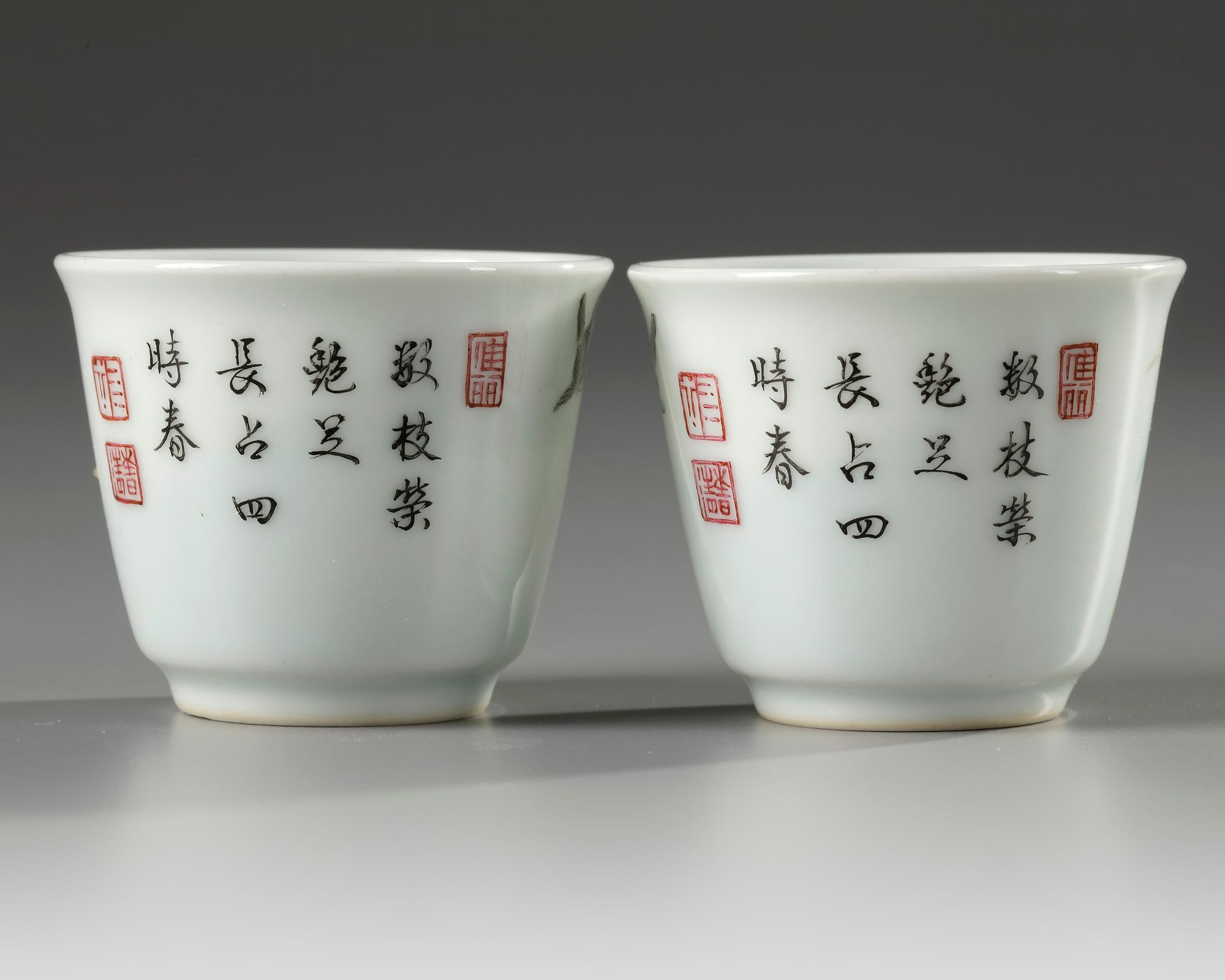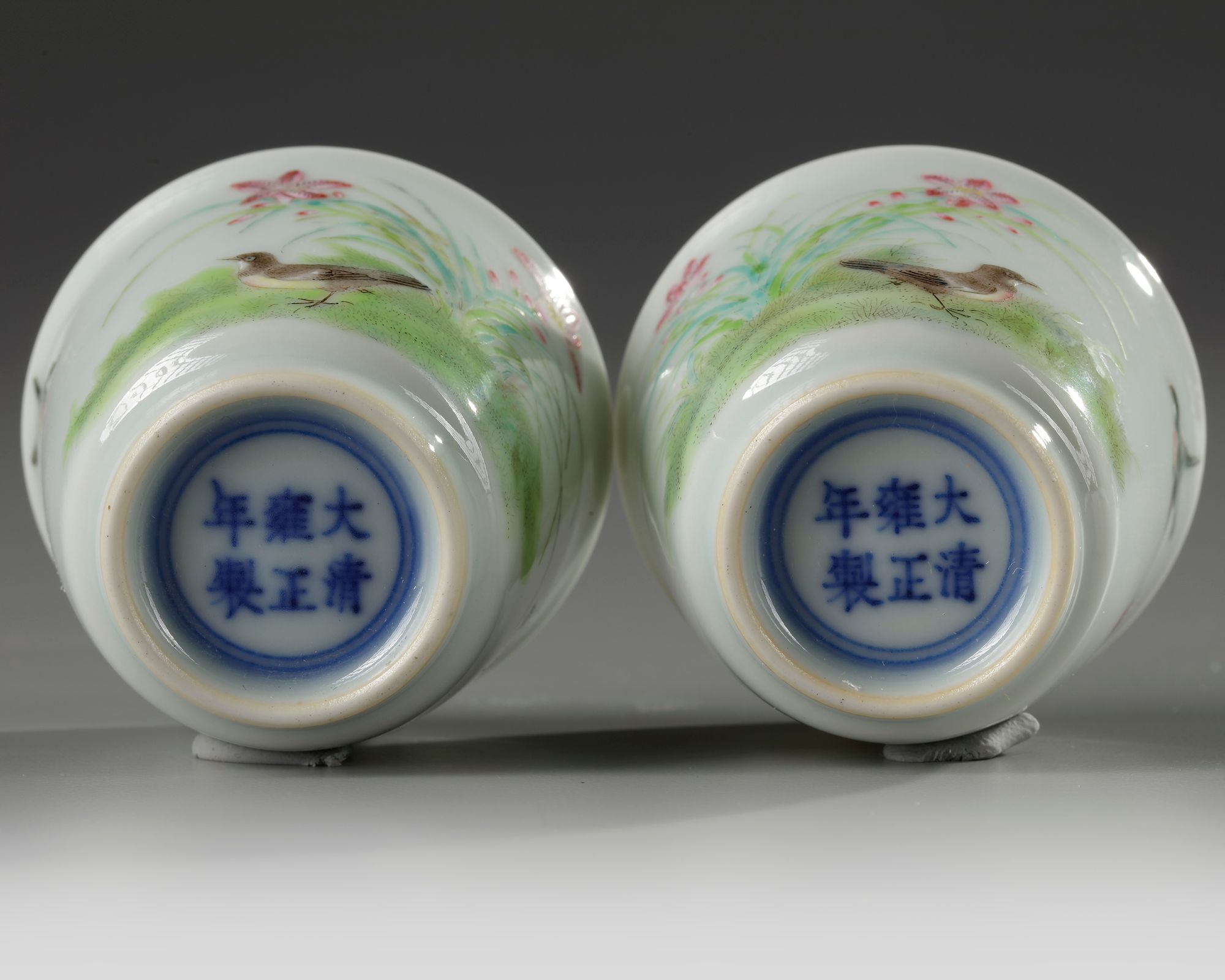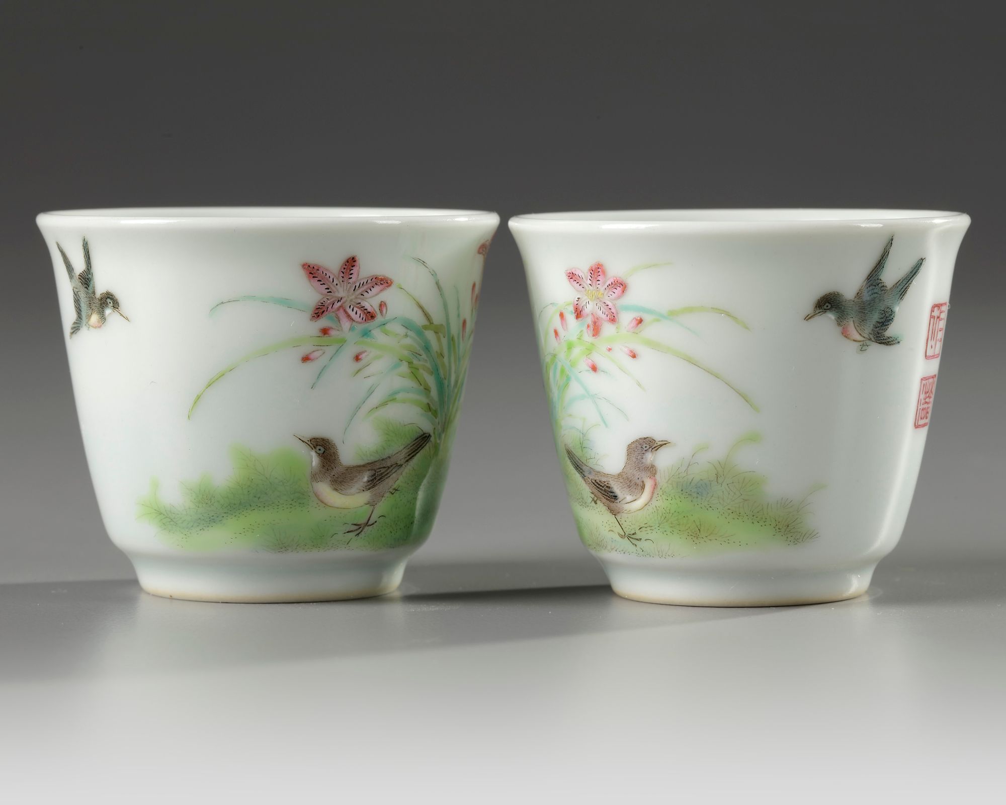 Each cup is decorated with a pair of birds amongst pink lilies, the reverse is decorated with a poetic inscription and three seals in iron red. Each base with an apocryphal Yongzheng mark.