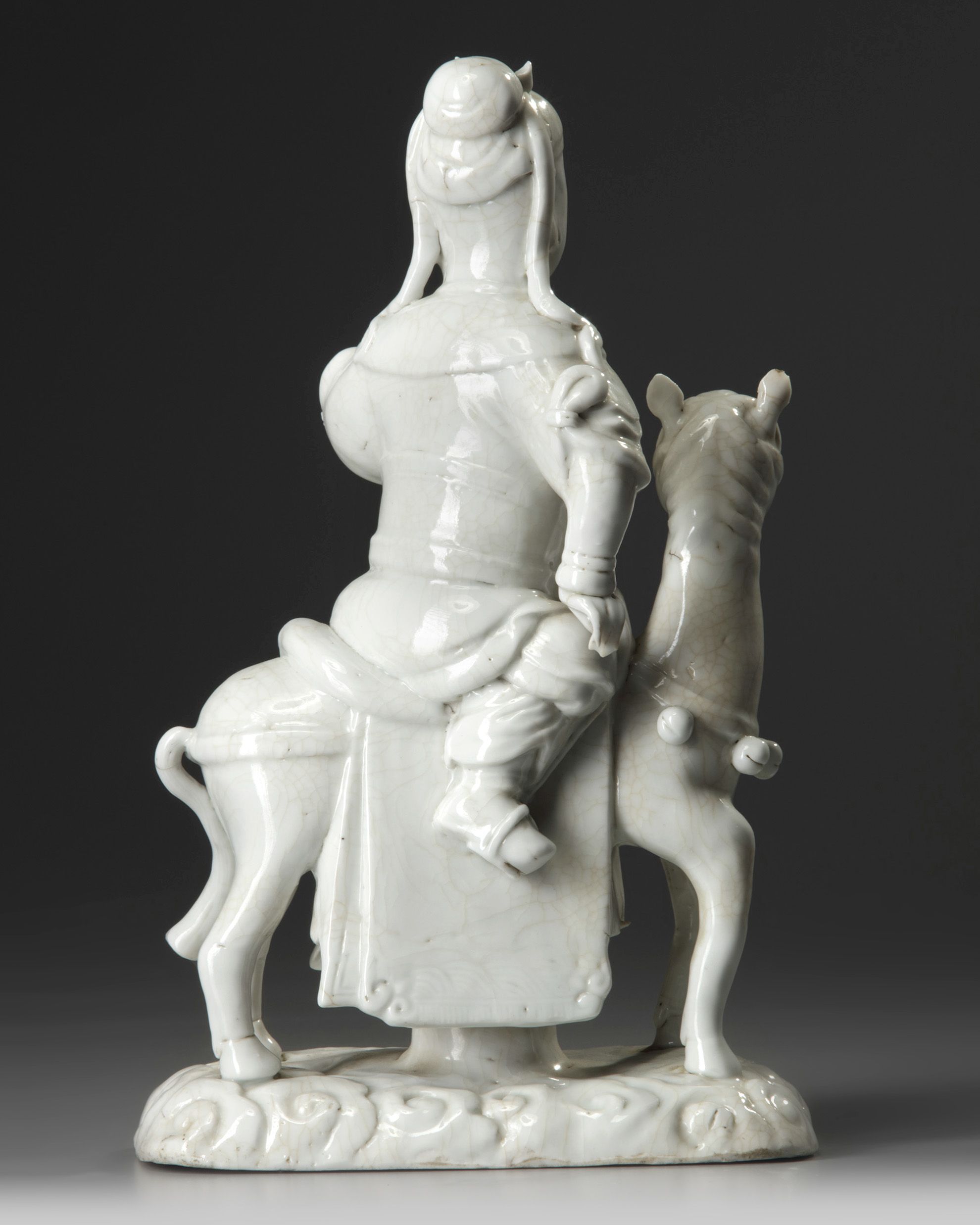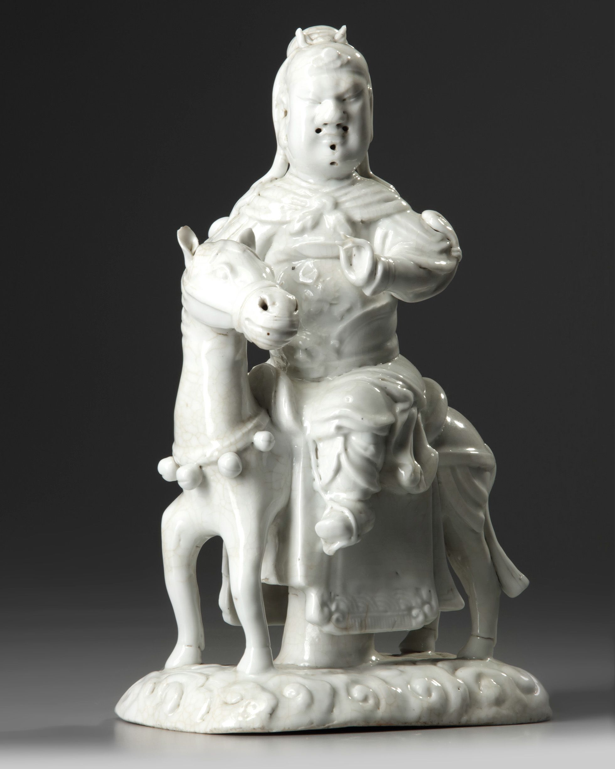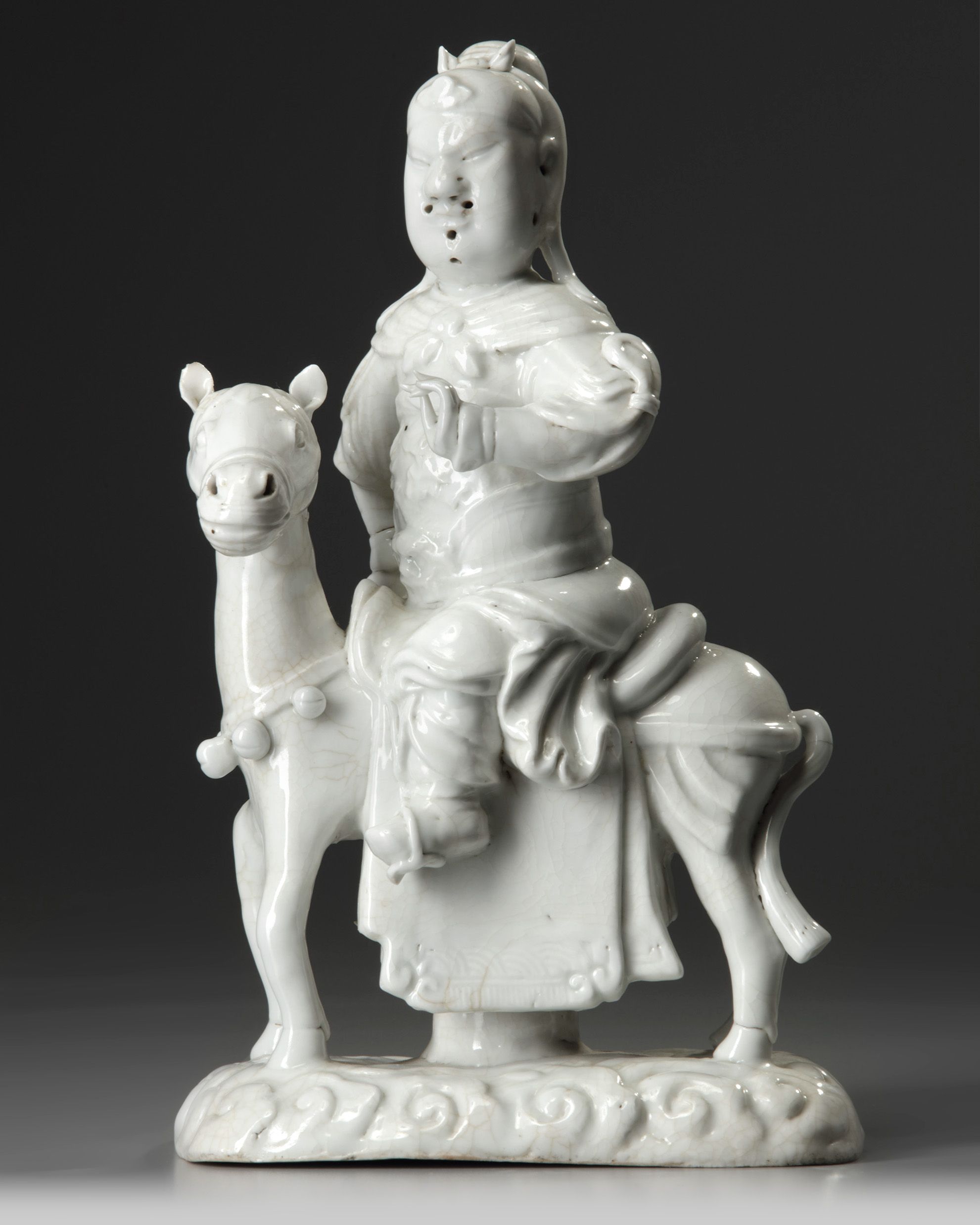 A Chinese Dehua white-glazed figure of Guandi on a horse