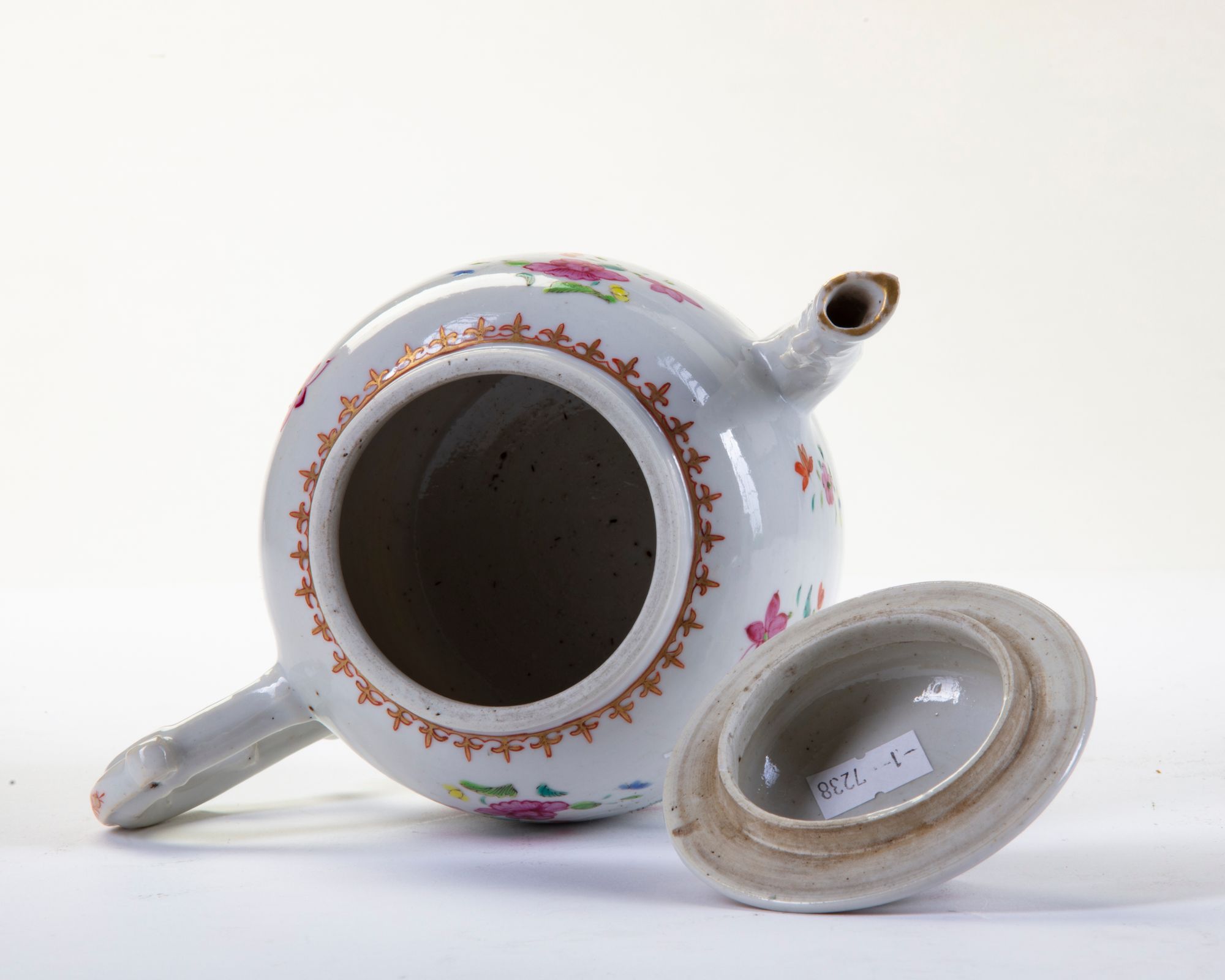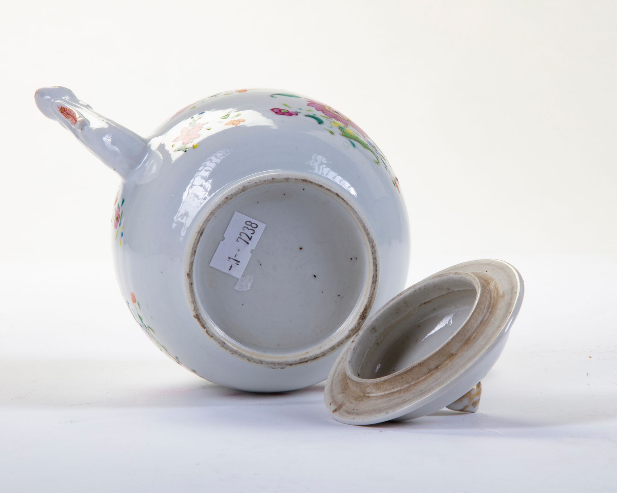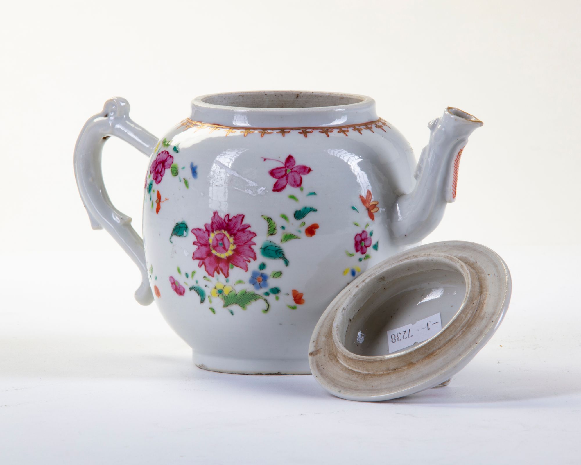 Decorated with flower motifs, furthermore gilding to tip of the spout, the shoulder, the rim and the finial on the cover. 13 cm. high, 20 cm. wide.