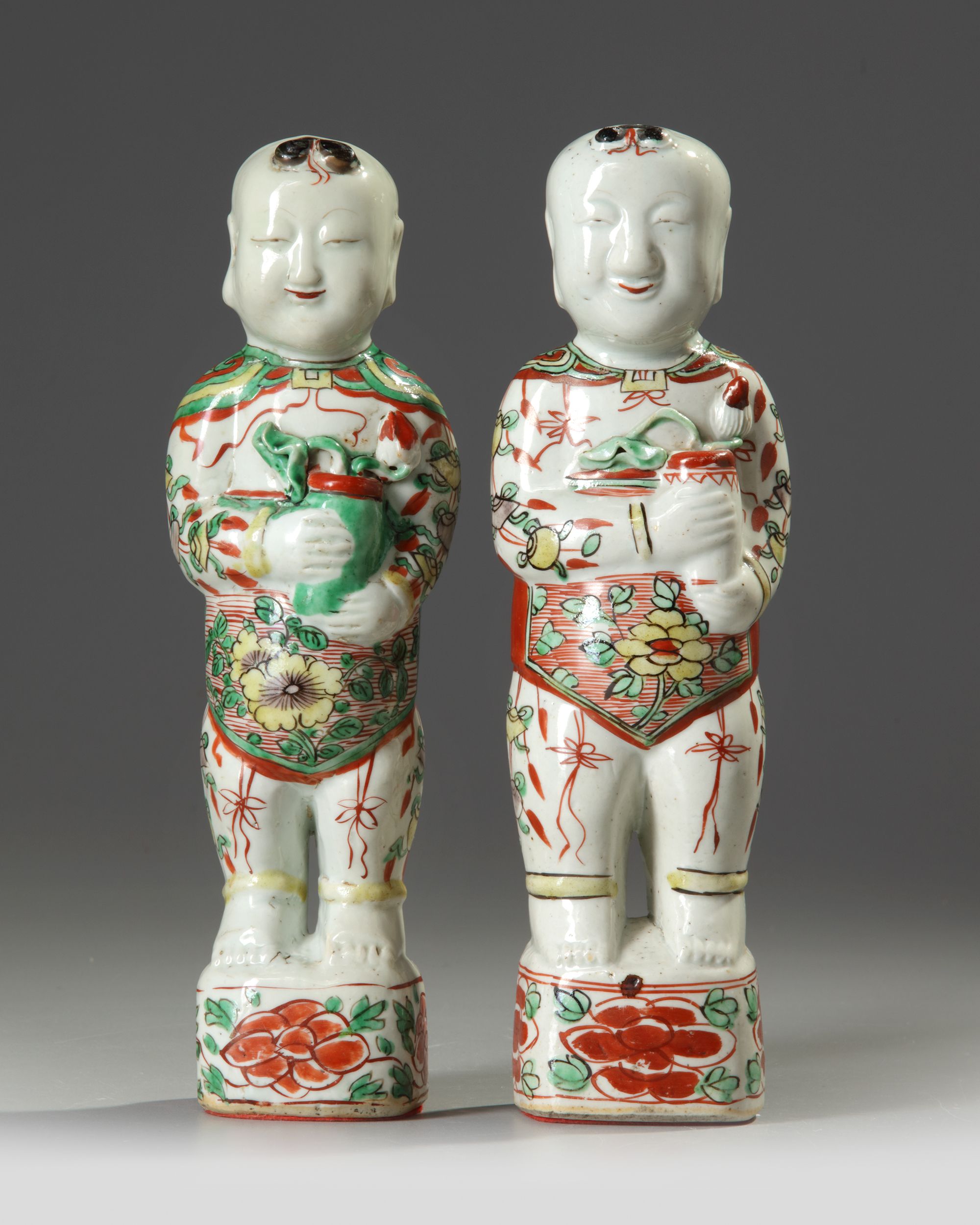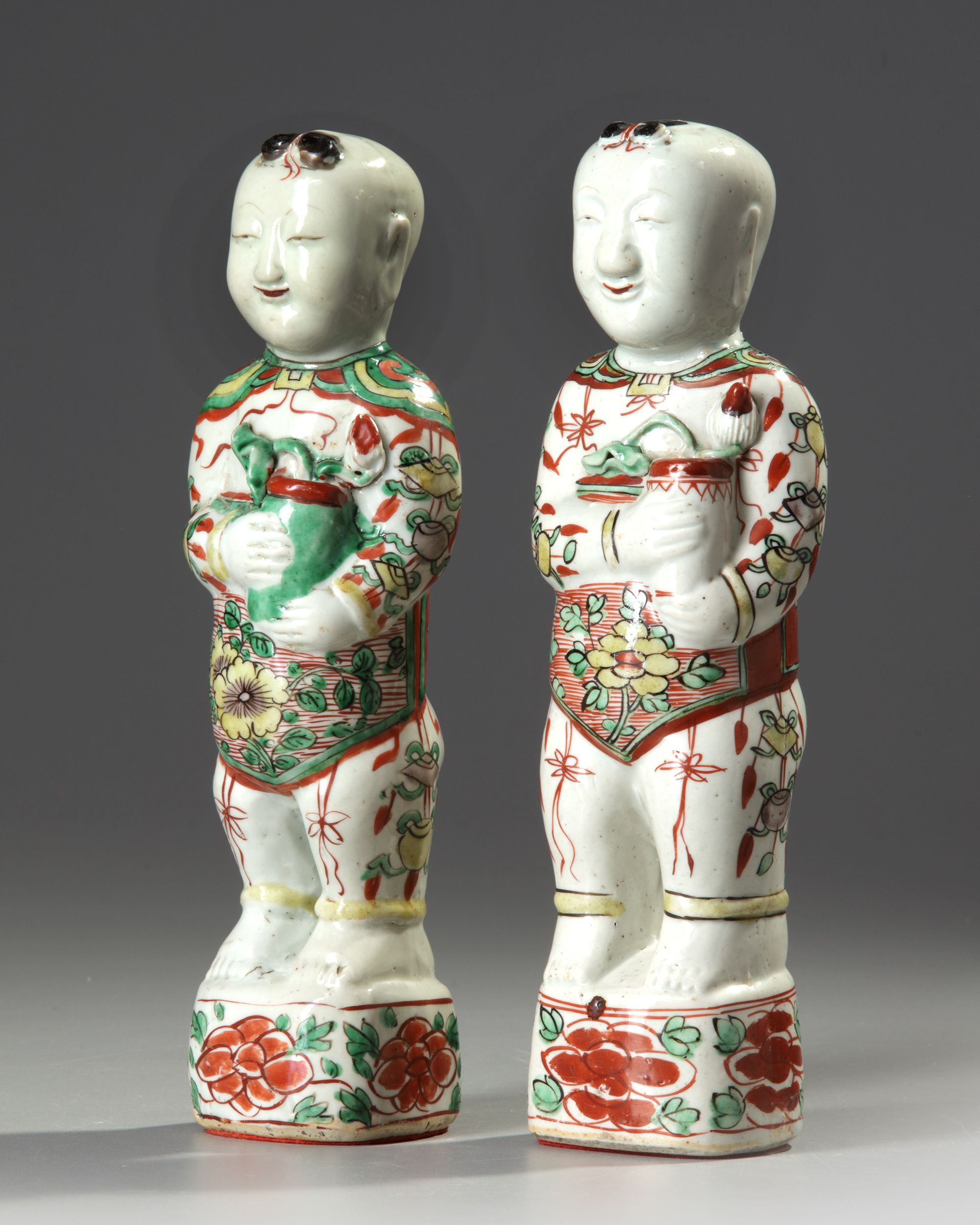 Each holding a vase of lotus to their opposite sides, wearing floral robes and standing on square pedestals enameled with flowers. 28 cm.