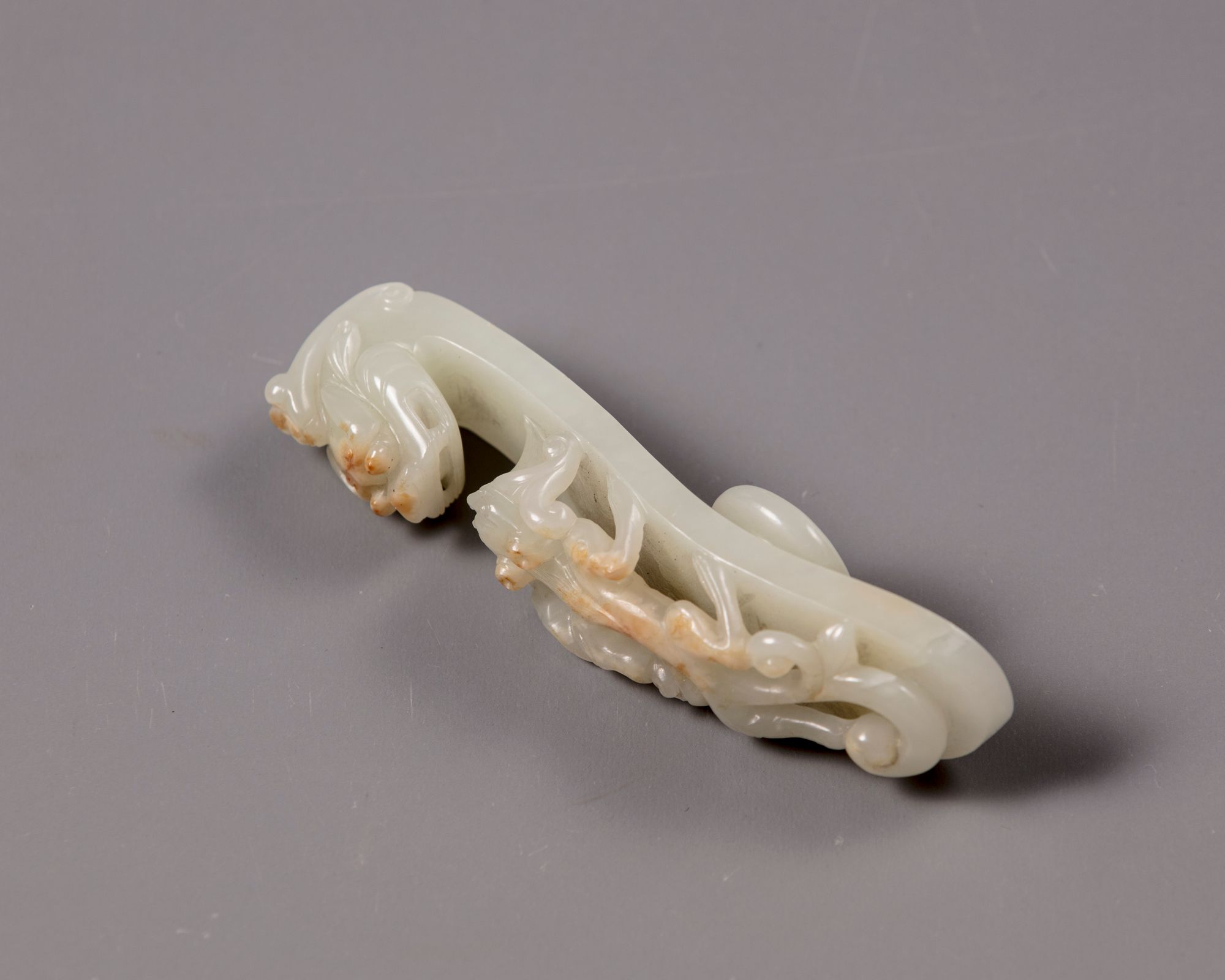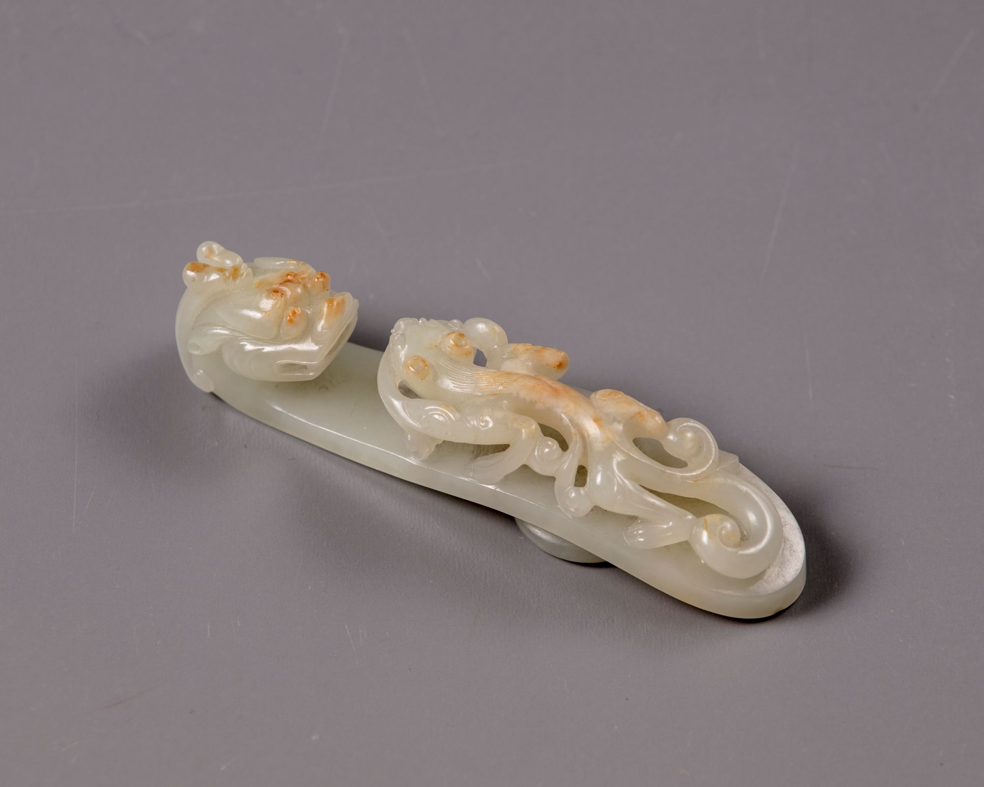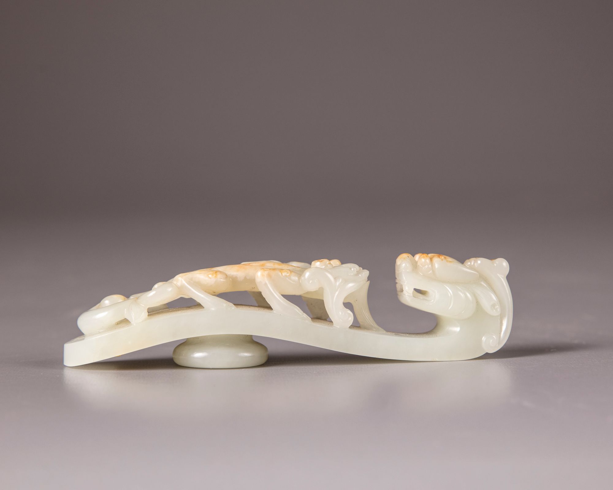 The belt hook is finely carved to the top in openwork and undercut with a chilong grasping a lingzhi fungus crawling towards the dragon head hook, with a circular stud on the reverse. The stone of very pale greenish-white color with a few fine splashes of russet to the upper surface.