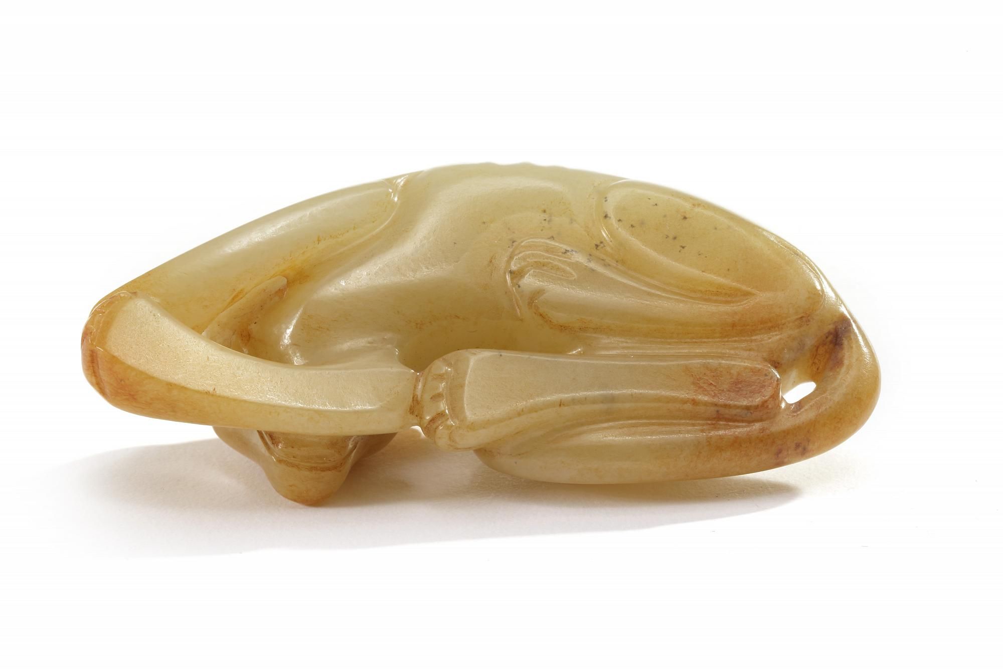 The dog is carved recumbent with its tail flicked over its haunches, legs tucked under, and front paws in front of it.