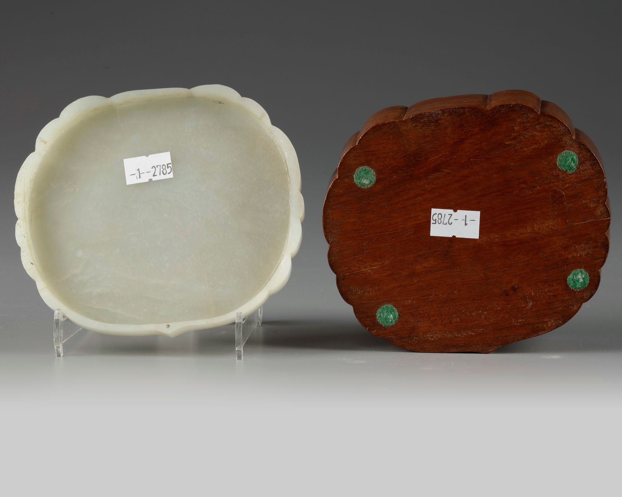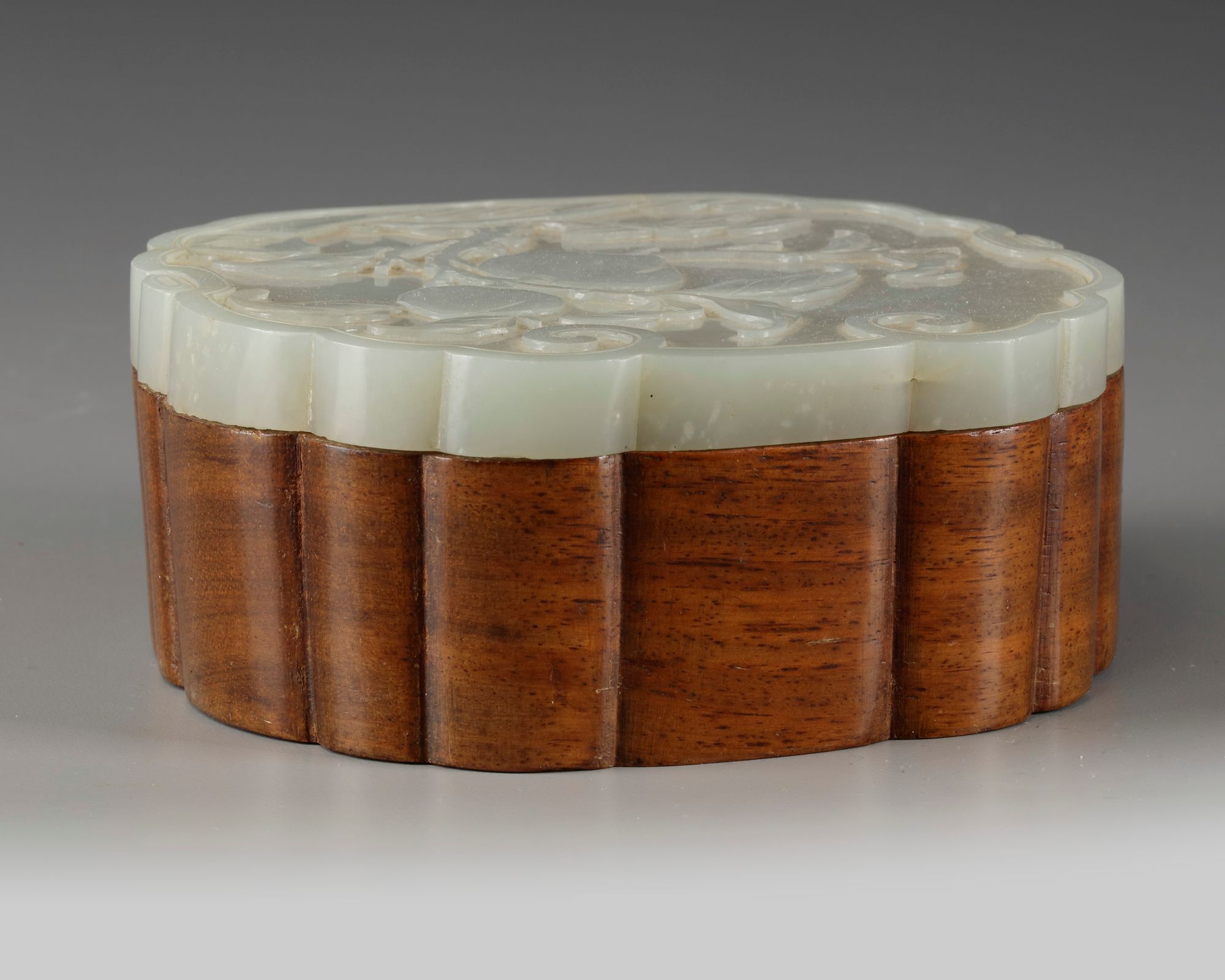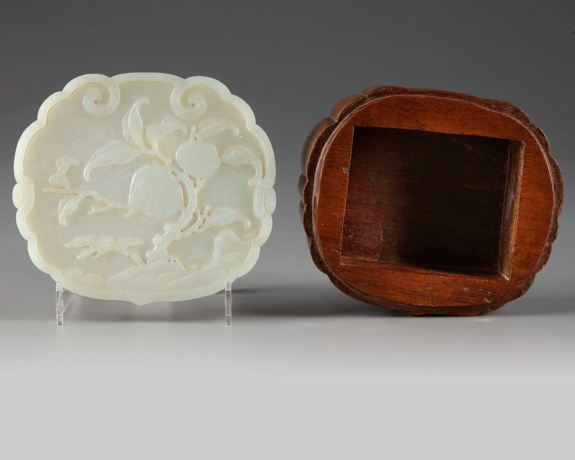 The plaque is carved in the shape of a ruyi-head, the upper surface is decorated in relief with a leafy tree bearing to peaches beside a bamboo spray and rocks, all enclosed within a conforming ruyi-shaped border. The box is also of ruyi-form with a square-section hollow to the interior.