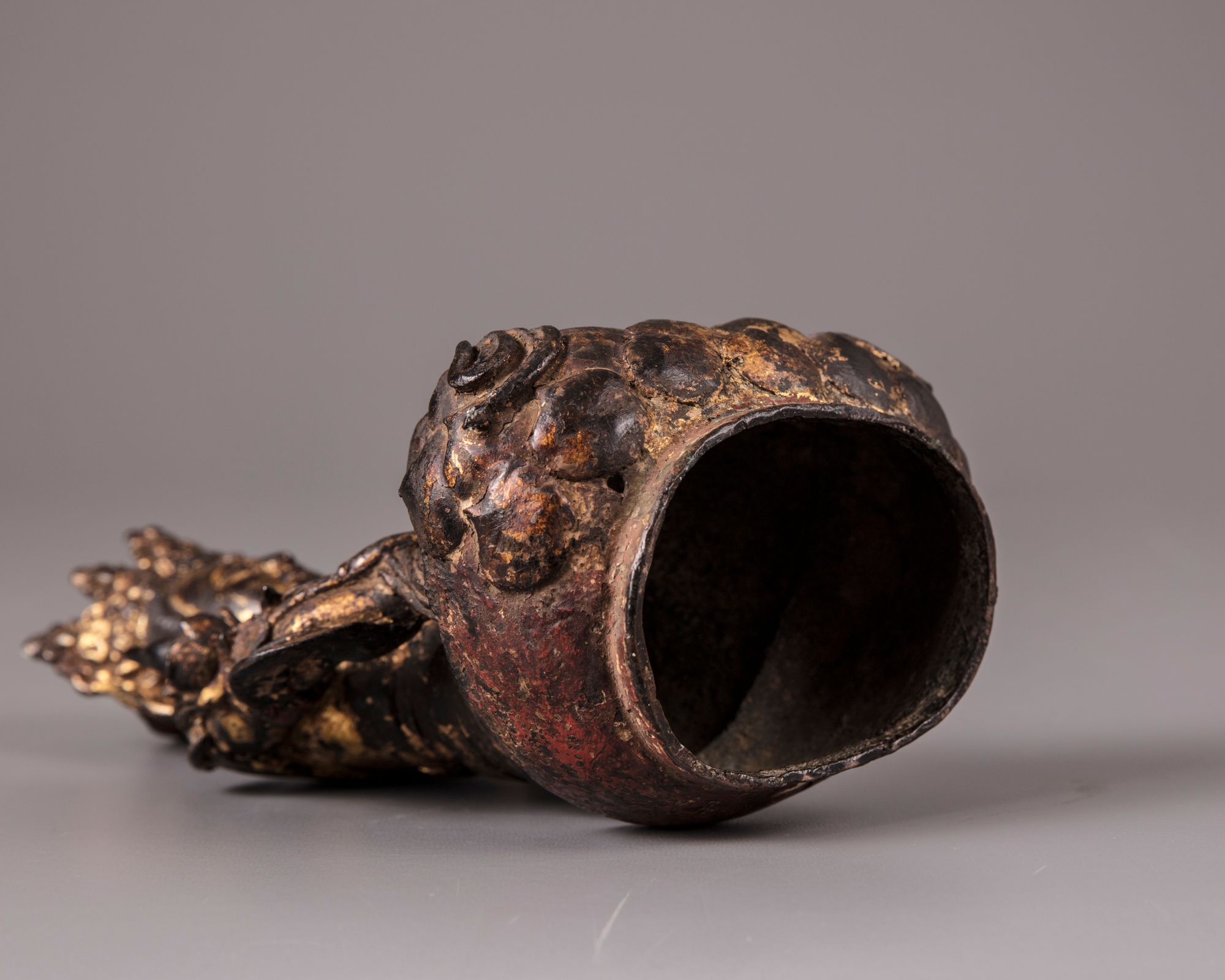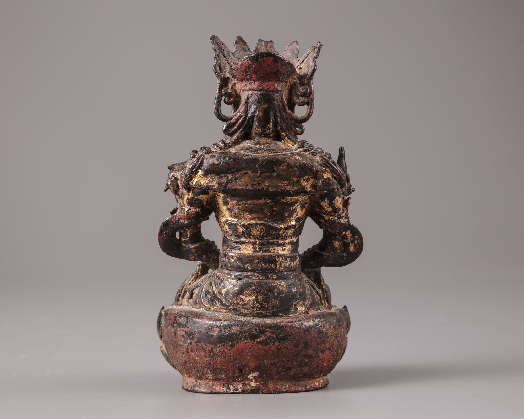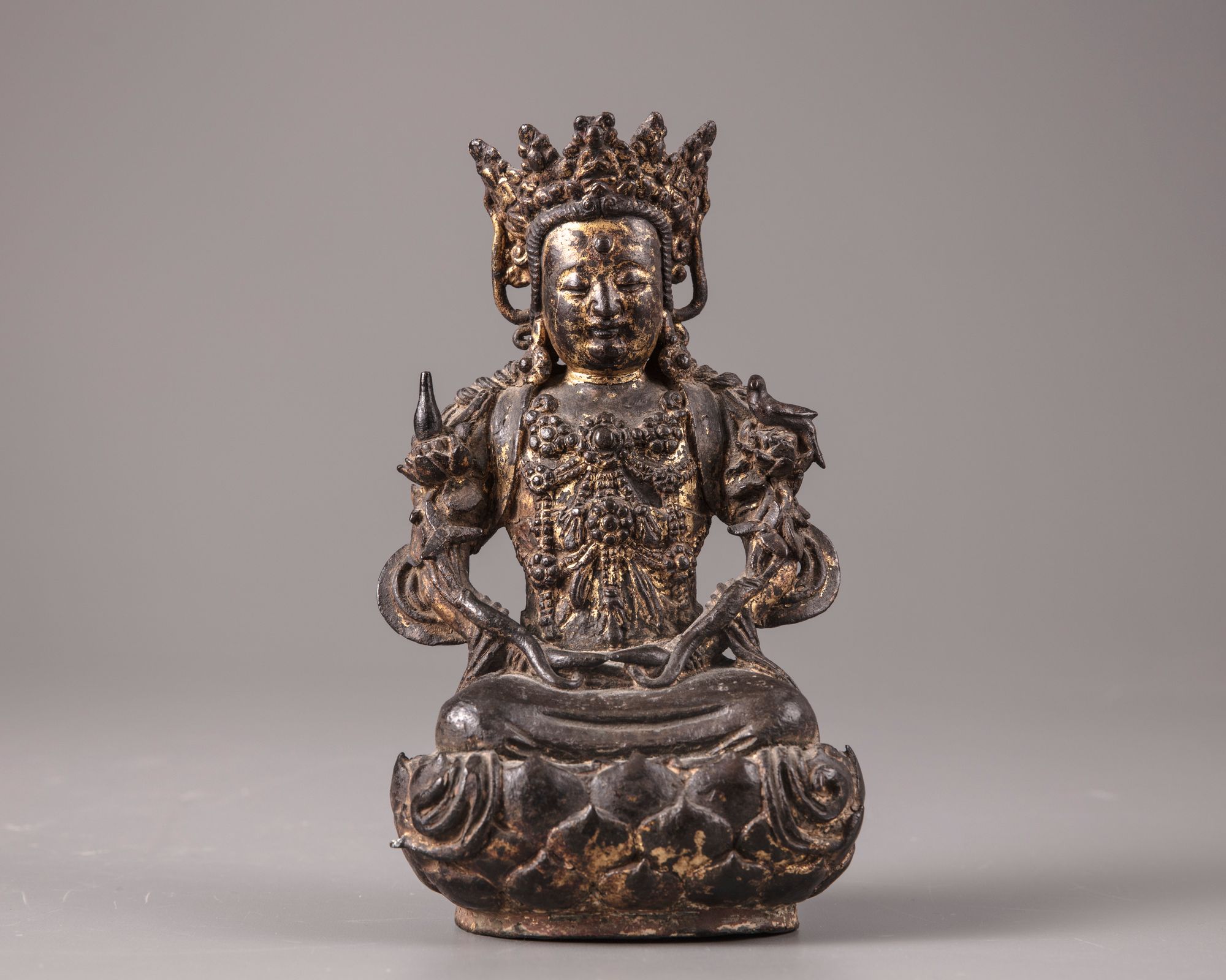 The deity is cast seated in Dhyana-Mudra on a lotus stand wearing jewels and long robe decorated with flowers at the hem.