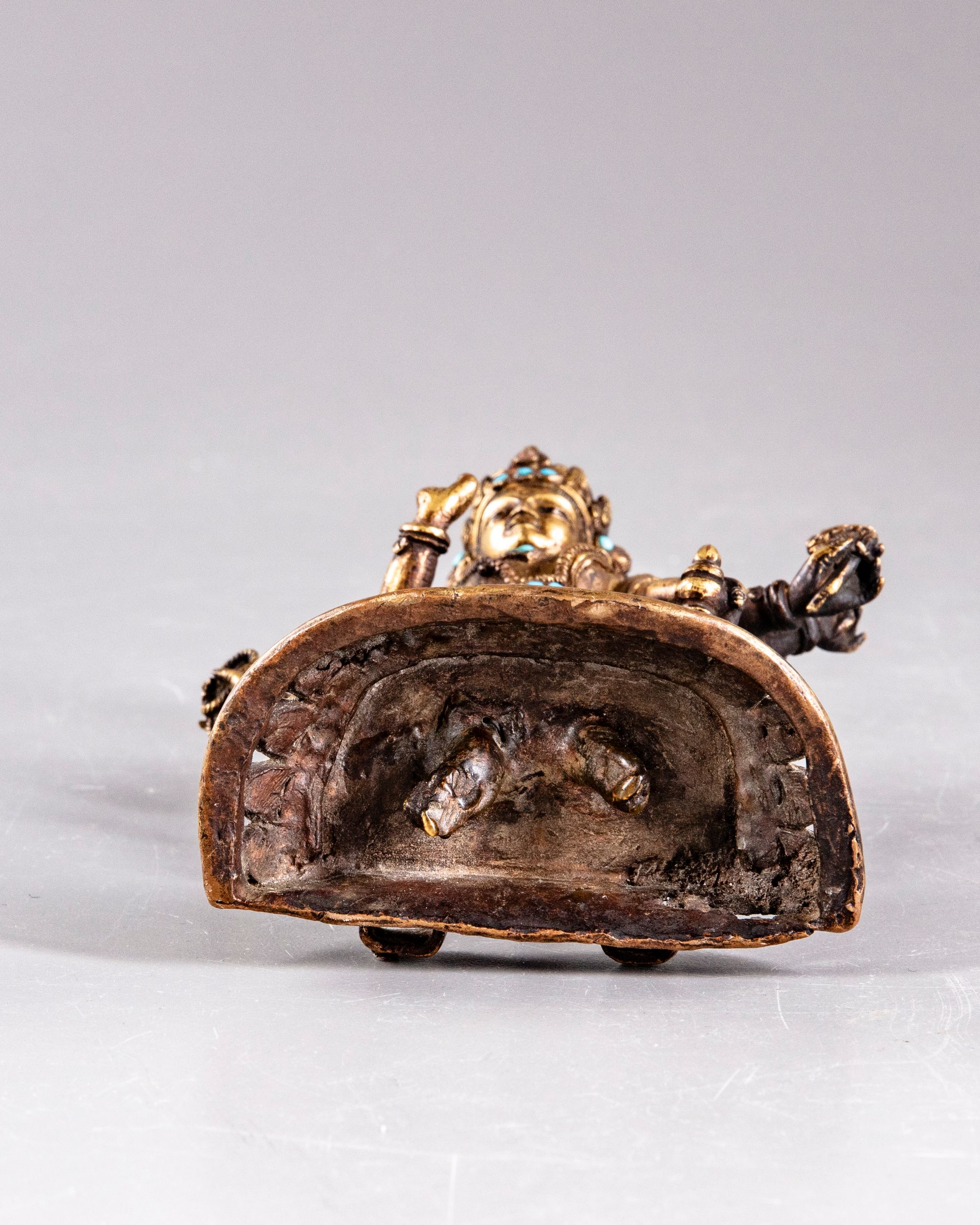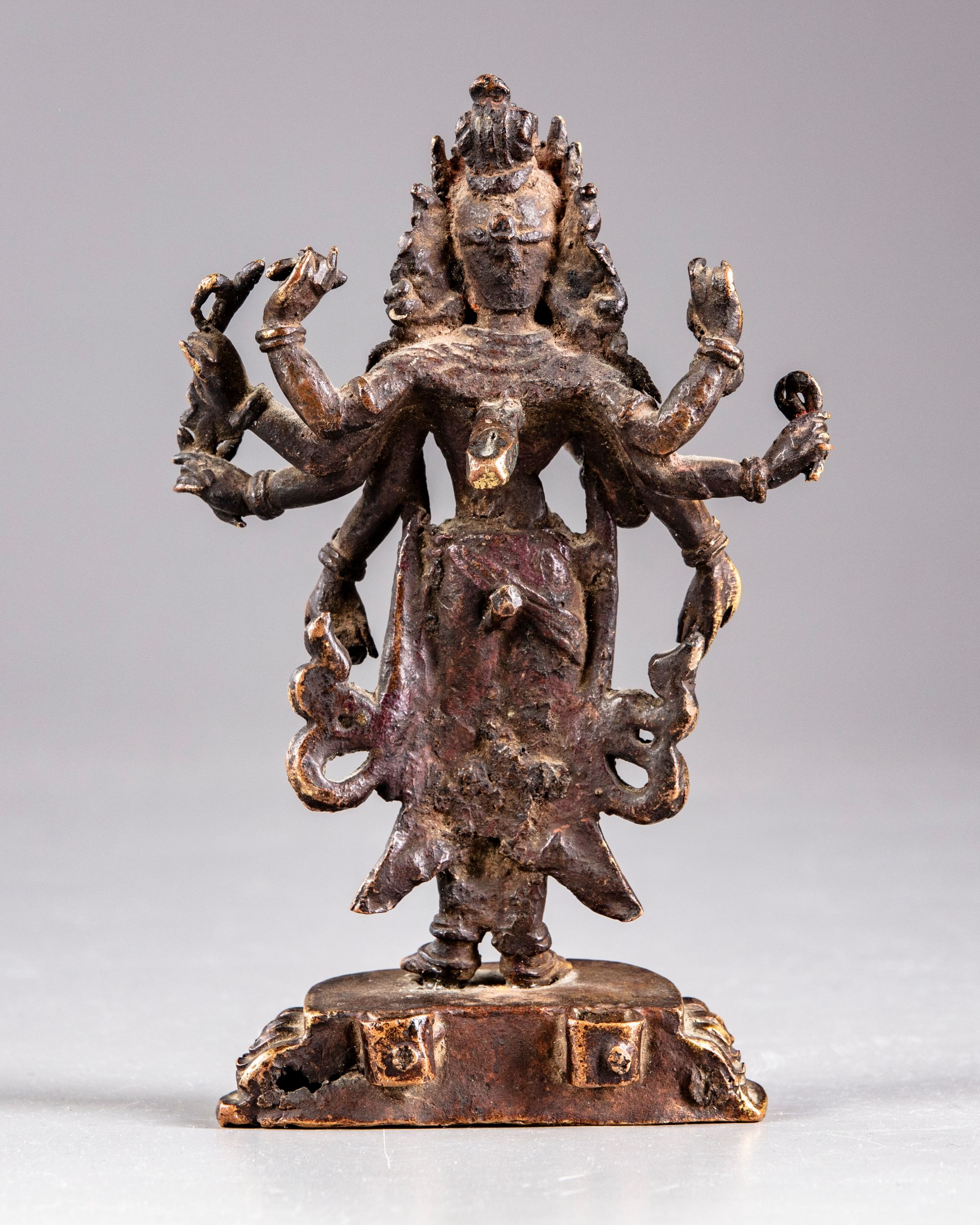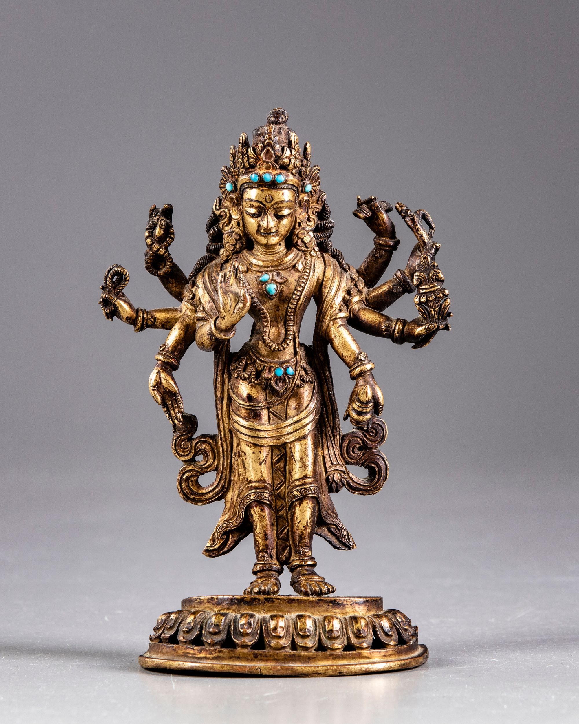 A Sino-tibetan eight-armed figure moulded standing on a lotus stand, two hands in vitarkamudra while the other six arms holding precious objects, the face with a serene expression centered by urna and surmounted by a lotus-bed tiara, the hair in a tall chignon. inset with turquoise gem-stones