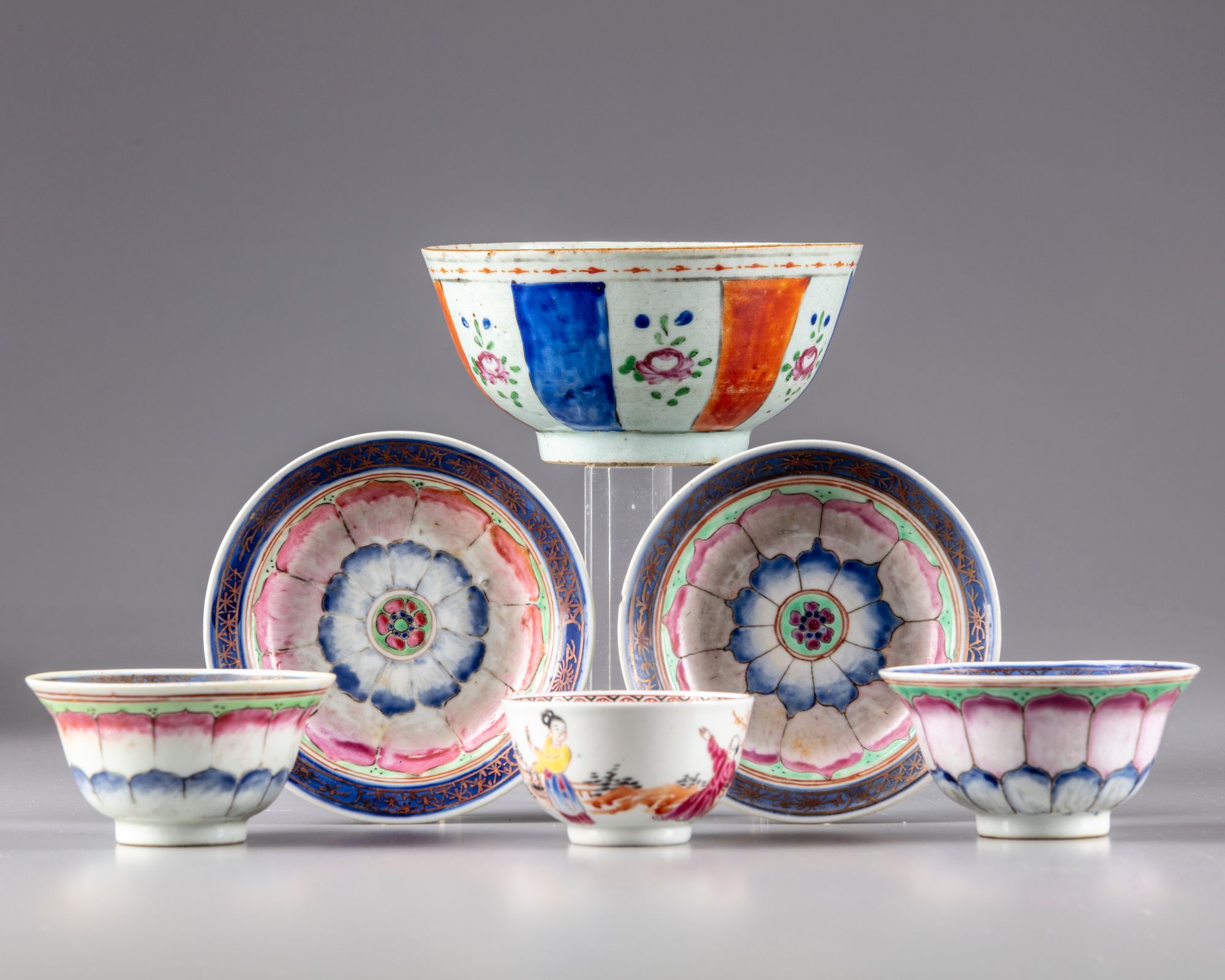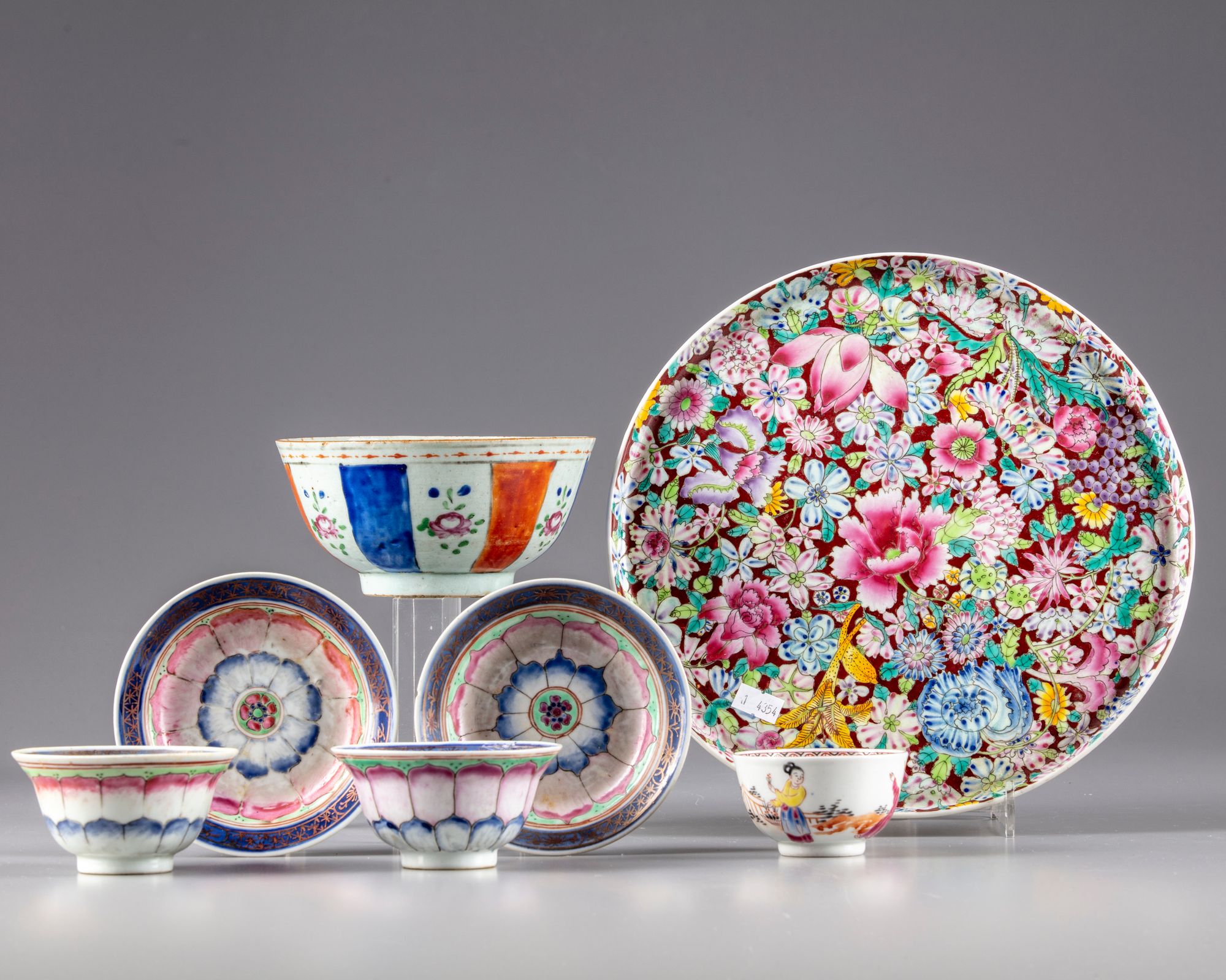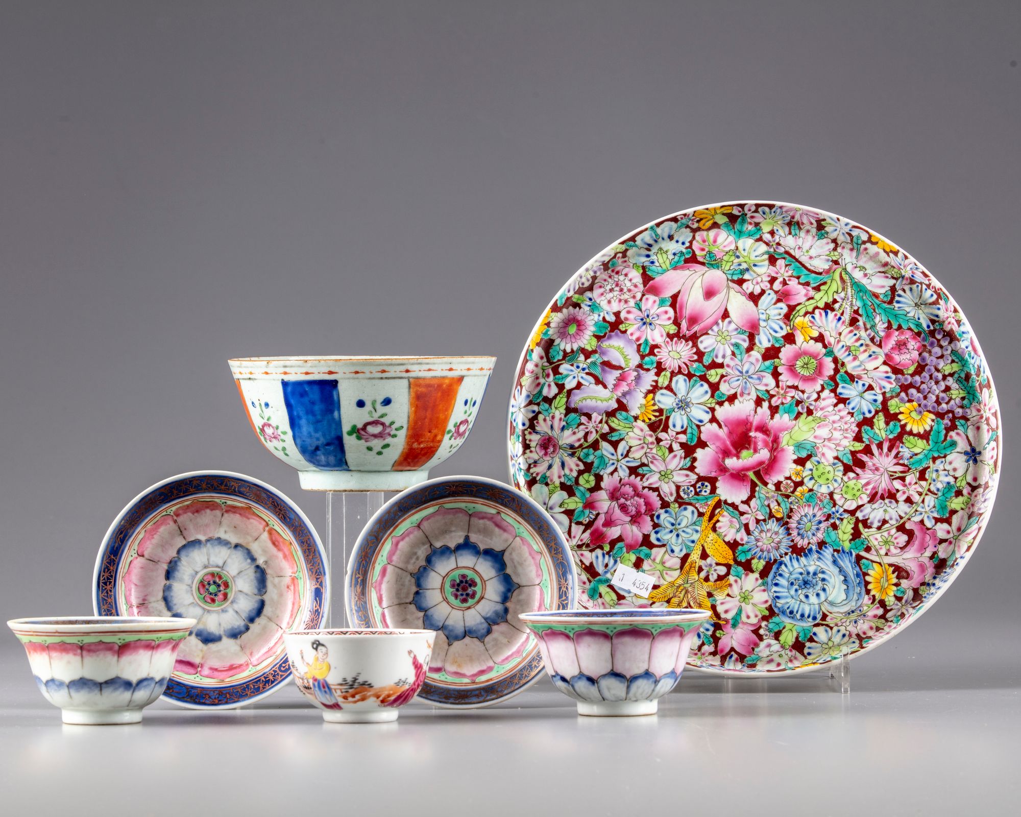 The dish is decorated with a mulititude of flowers like chrysanthemums, peonies and moon flowers, 26cm. The bowl decorated with flowers 14 cm Diameter, The two cups and saucers decorated with lappet borders A small cup decorated with seated figure and a lady