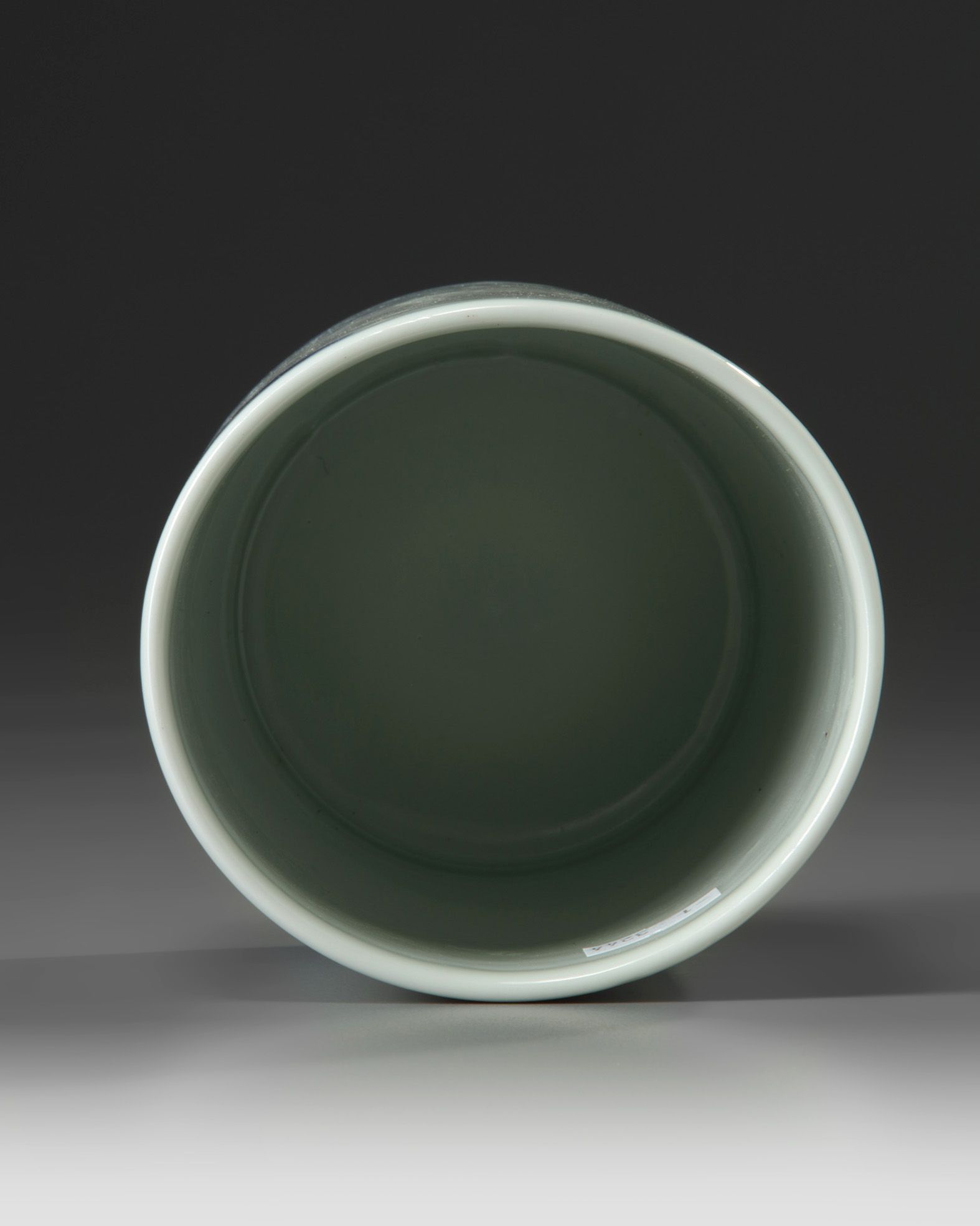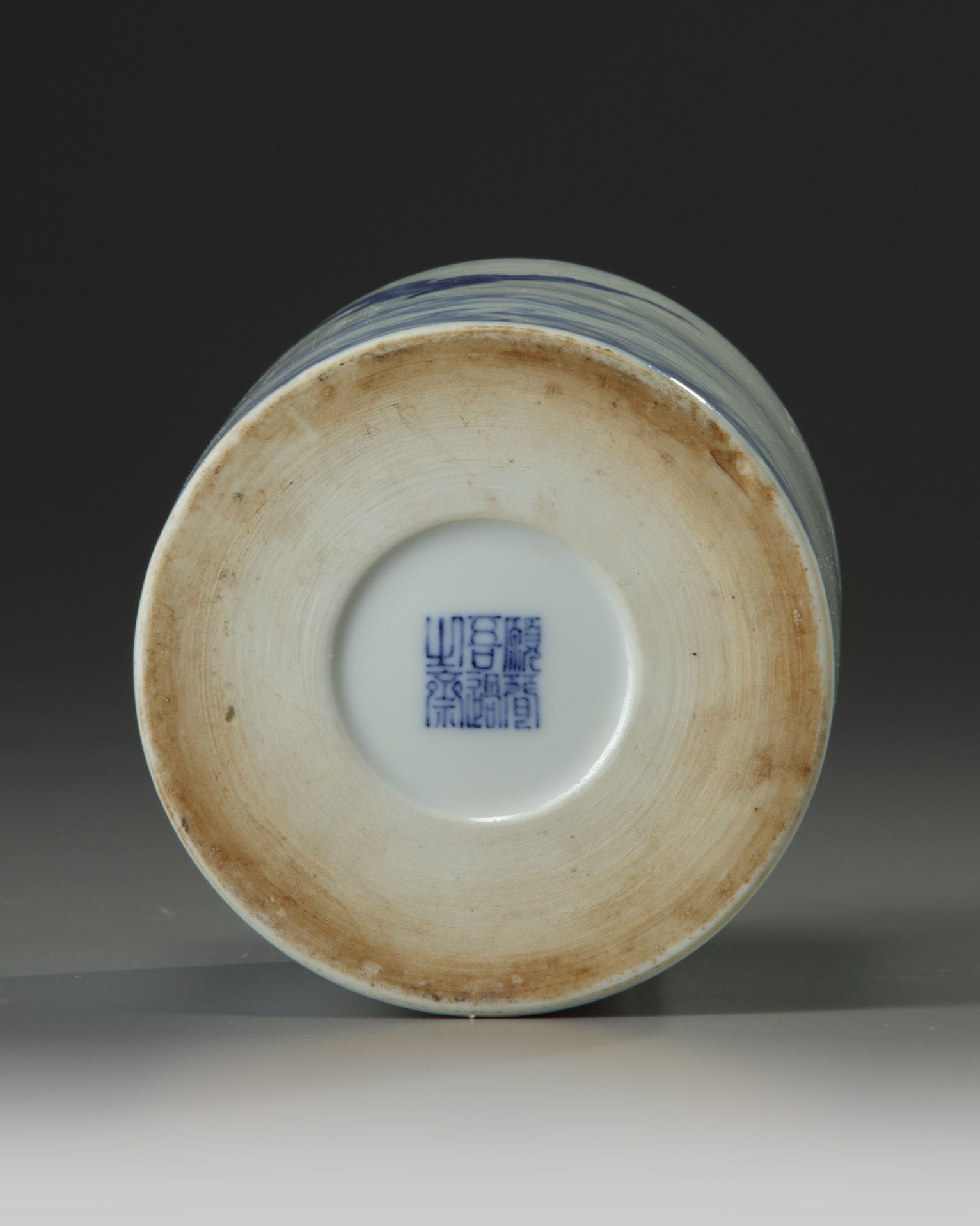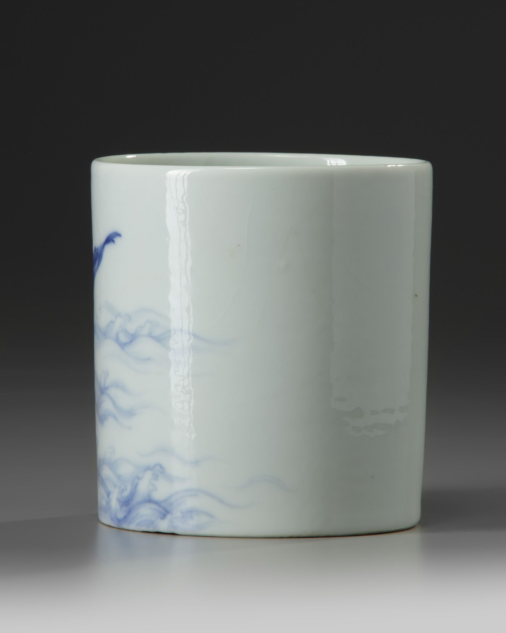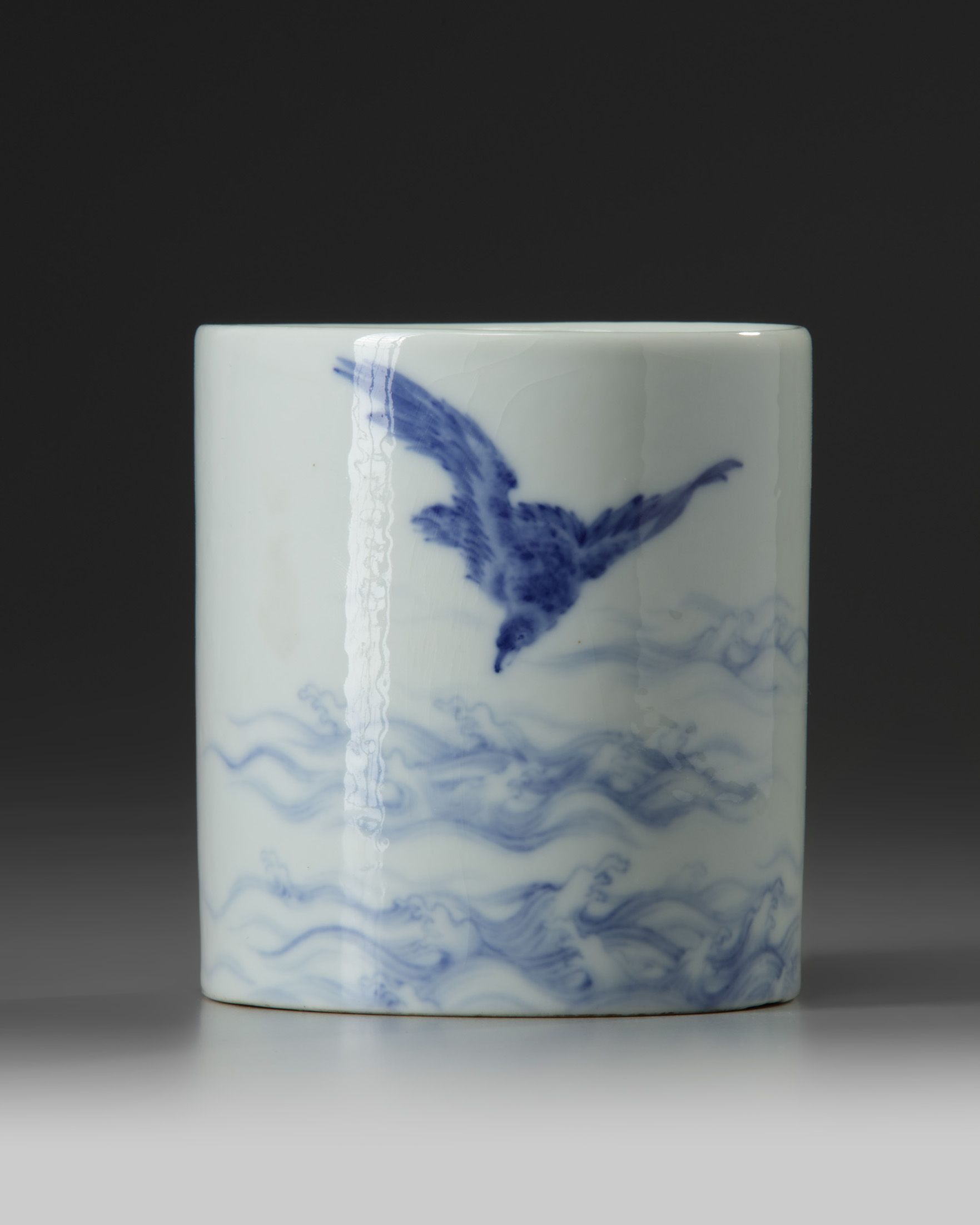 One side of the brush pot is delicately decorated in various soft shades of underglaze blue with a bird in flight above tumultuous waves. The base is marked 'Yuan wen wu guo zhi zhai' (the studio name of Wang Bu) in underglaze blue.