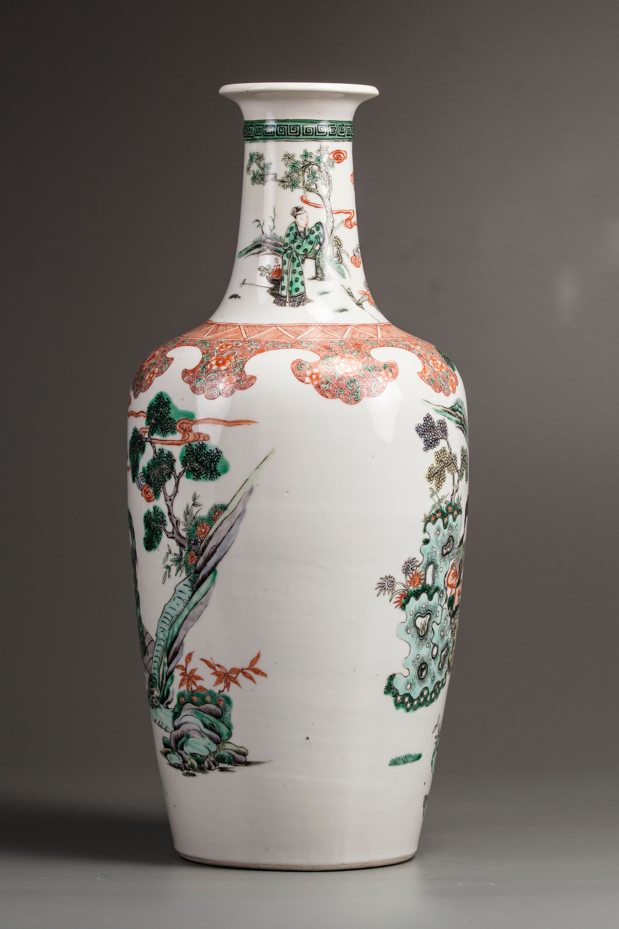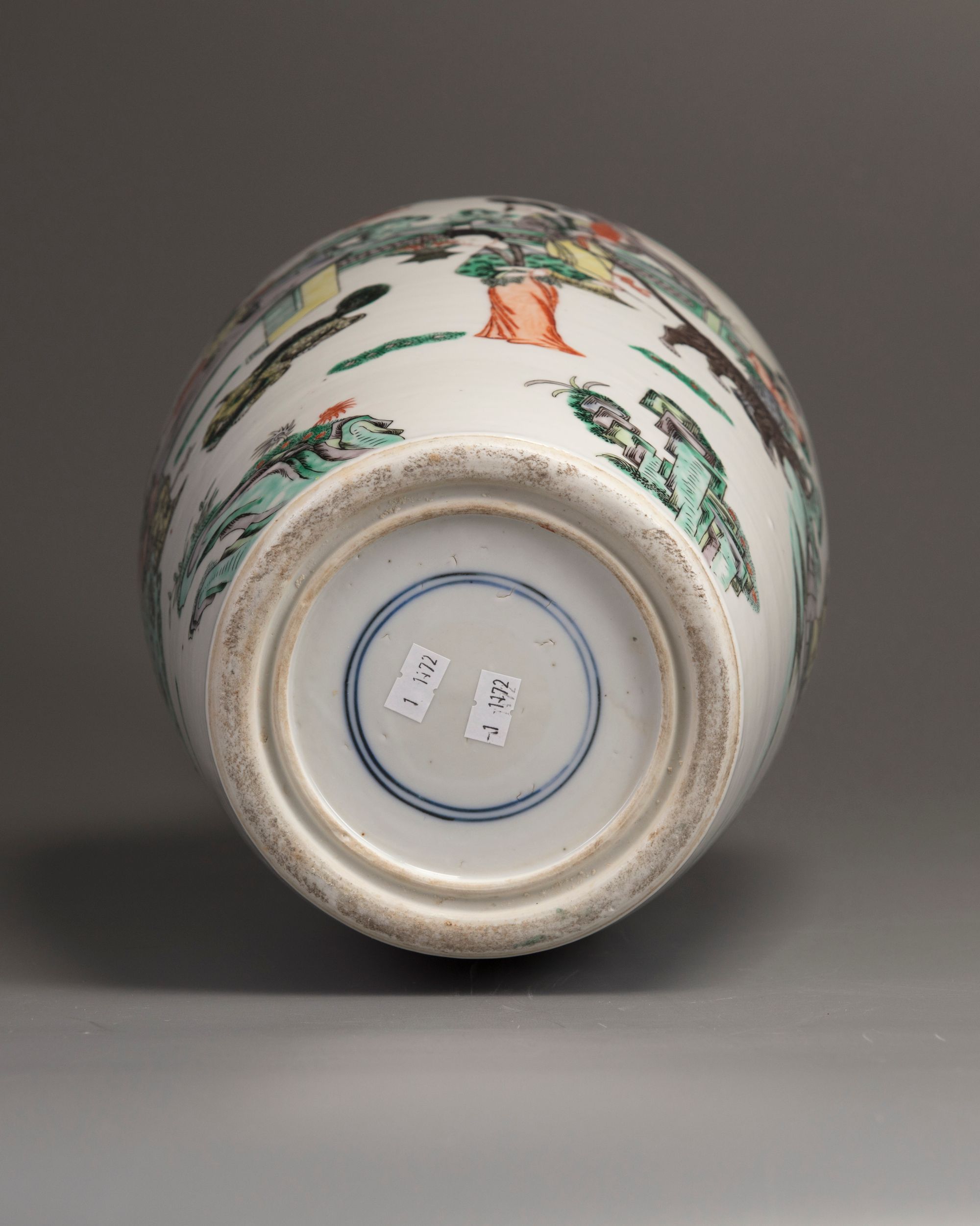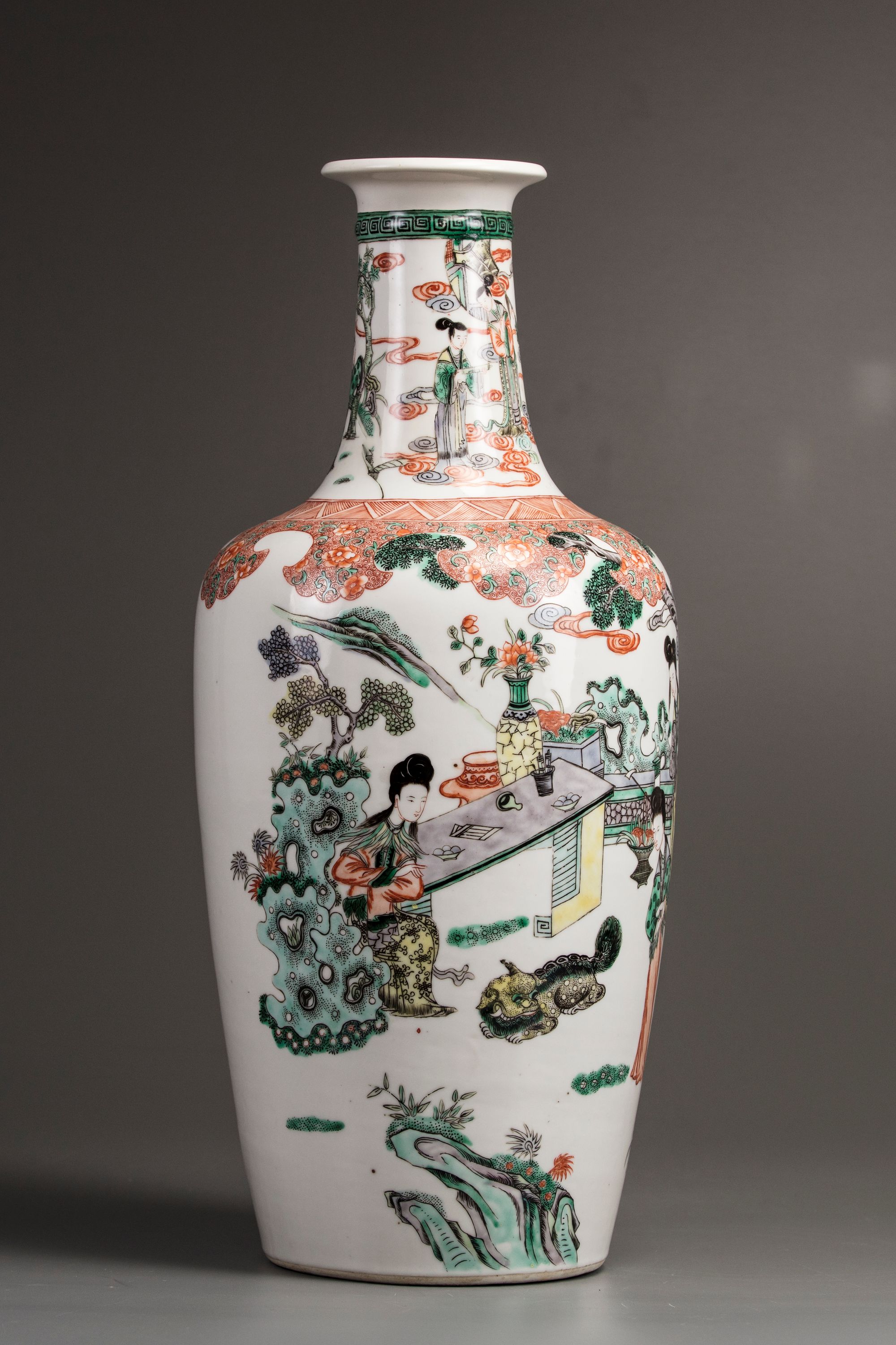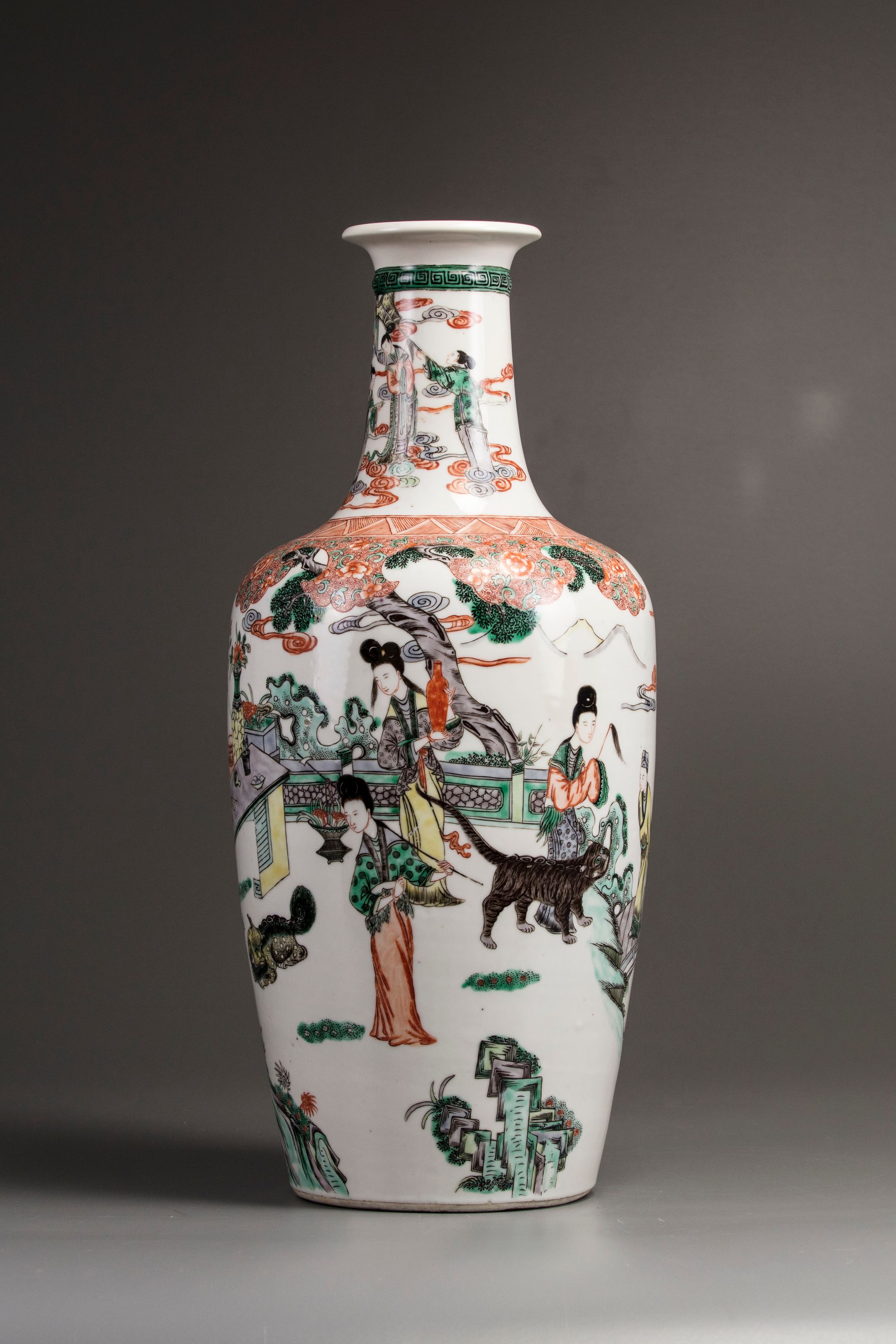 The vase is decorated with a continuous scene of lady Immortals and attendants at leisure in a fenced garden amongst Buddhist lions, rocks, and cloud scrolls, all with a shaped lappet band to the shoulder. The base with a double-foot and an underglaze blue double circle.