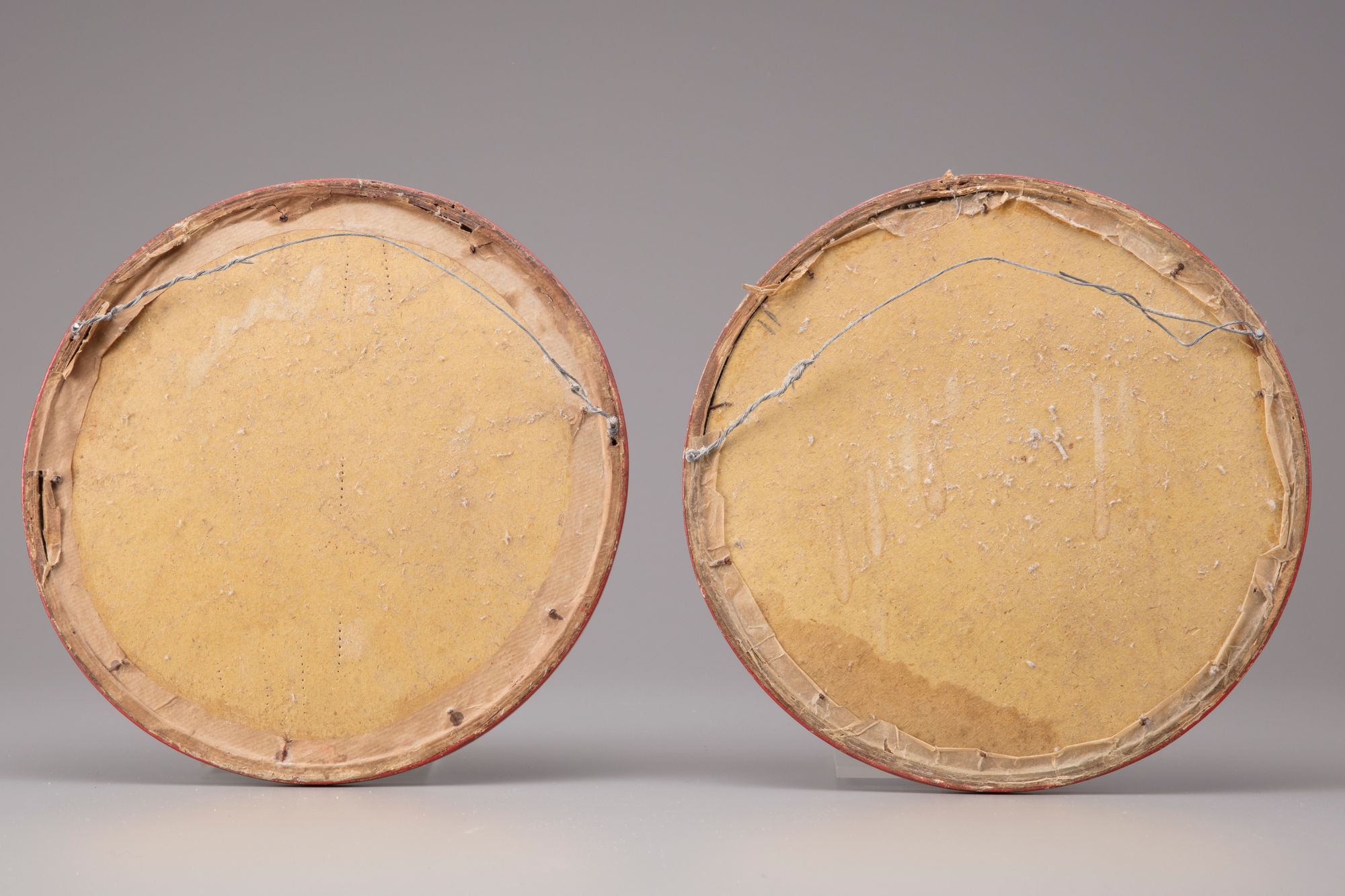 Each roundel is decorated with an embroidered applique design depicting figures amongst flowers, birds and scrolls, all on a cream ground.