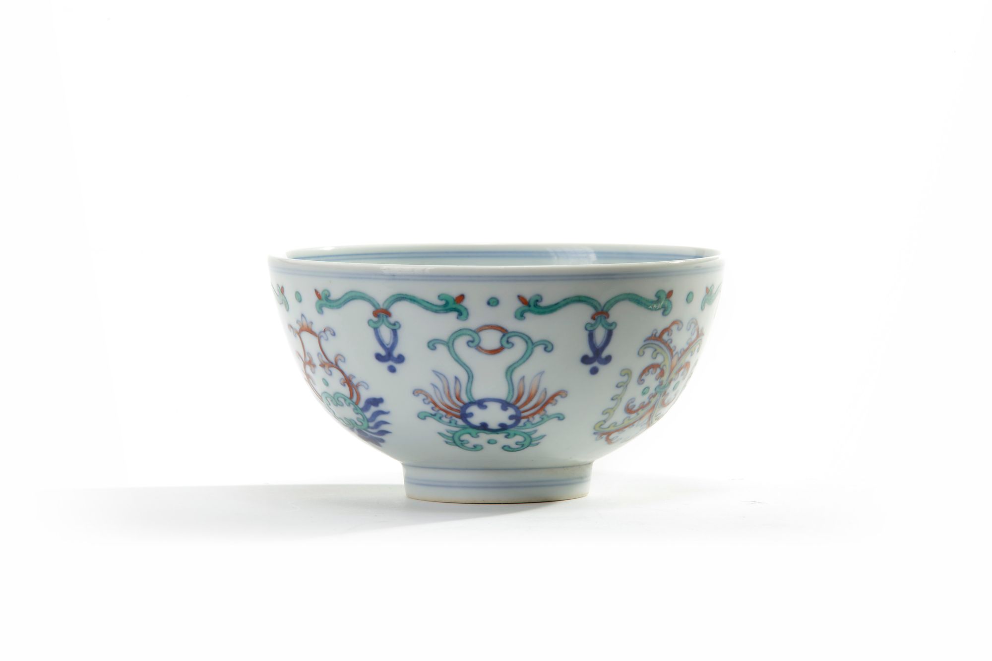 The bowl is decorated to the interior with a roundel stylised crenellated flower scrolls, the exterior similarly decorated. The base with an apocryphal Yongzheng mark.