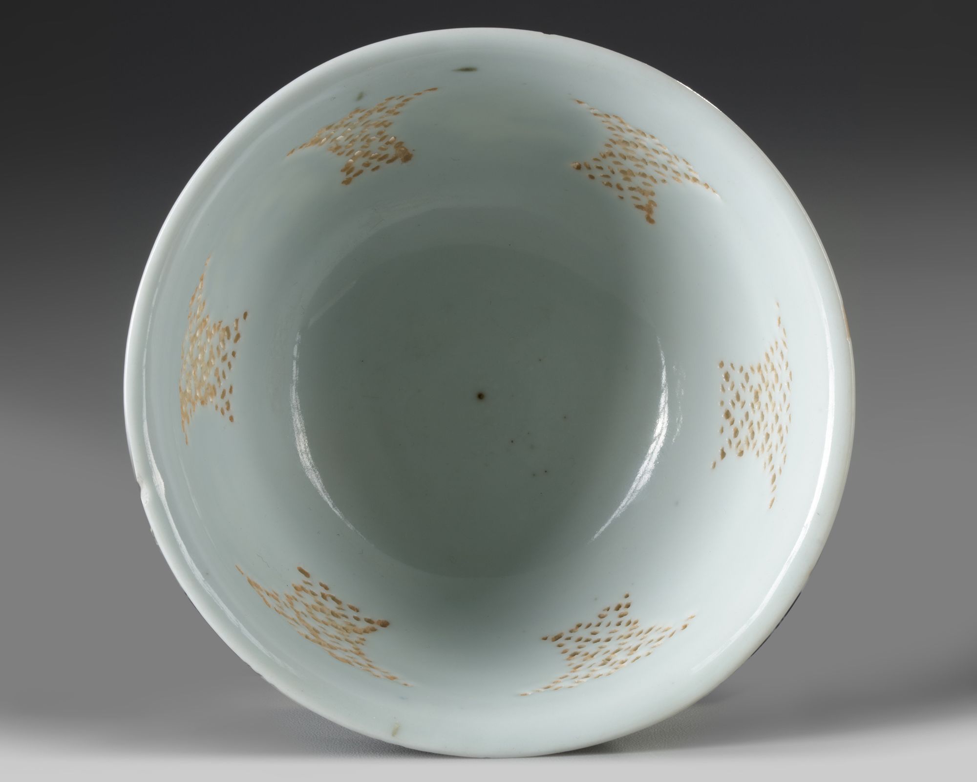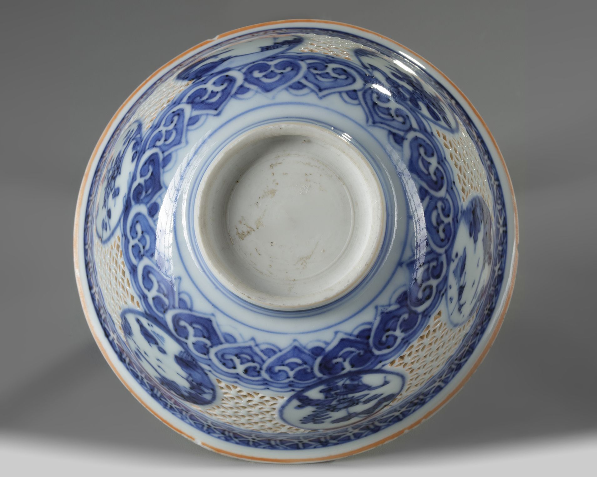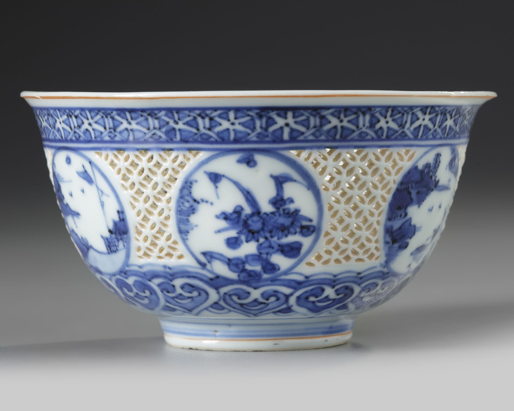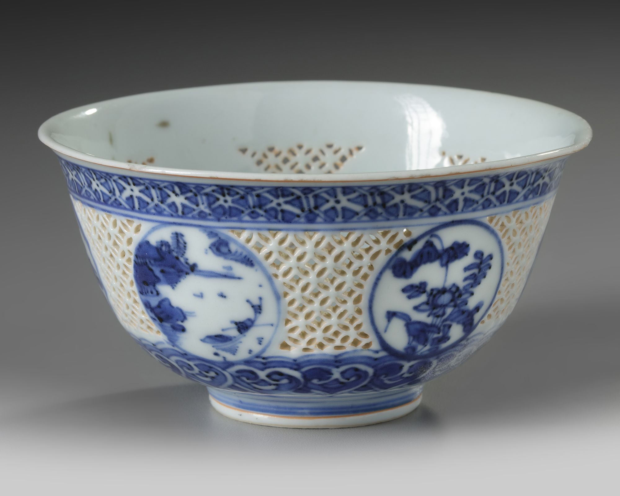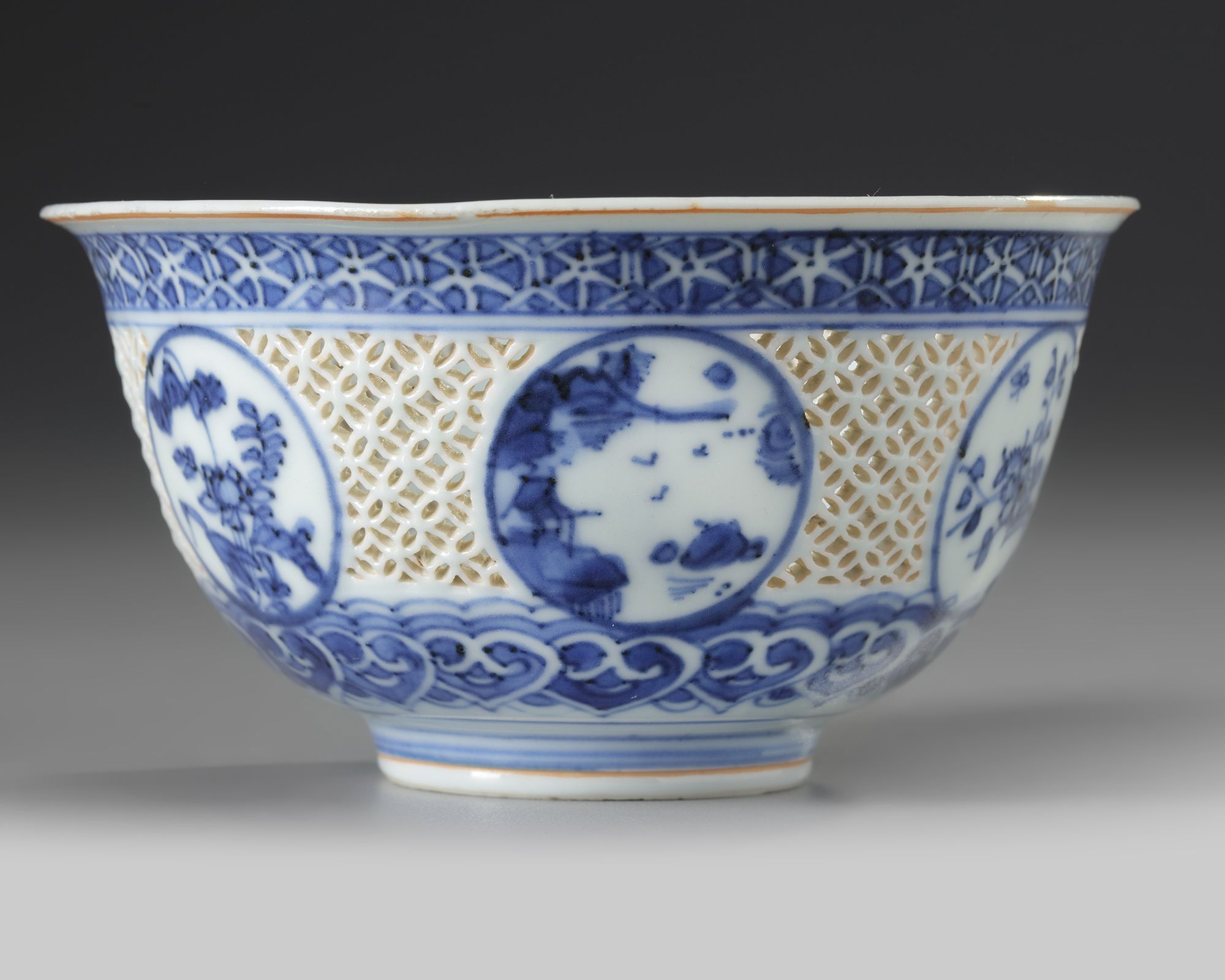 The bowl is decorated to the body with six roundels enclosing alternating landscape scenes and flowers, all interspersed with a delicately pierced pattern. The rim and foot are decorated with a honeycomb and and a ruyi-head band.