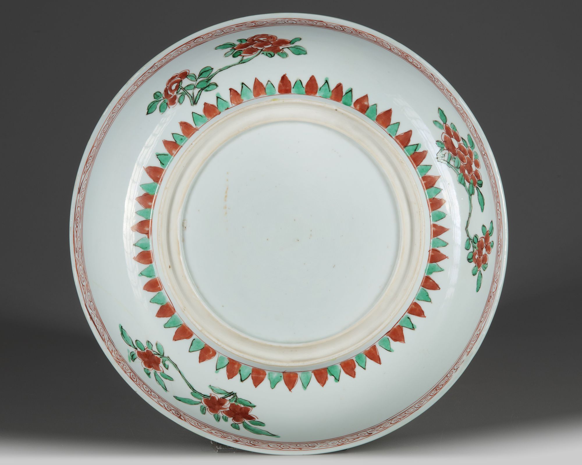 The centre of the charger is decorated with large flowers on a densely patterened ground, surrounded by a band of ruyi heads. The rim is decorated with a band of further flowers. The reverse is decorated with flower sprays surrounding a channelled footring. Provenance: Private British collection