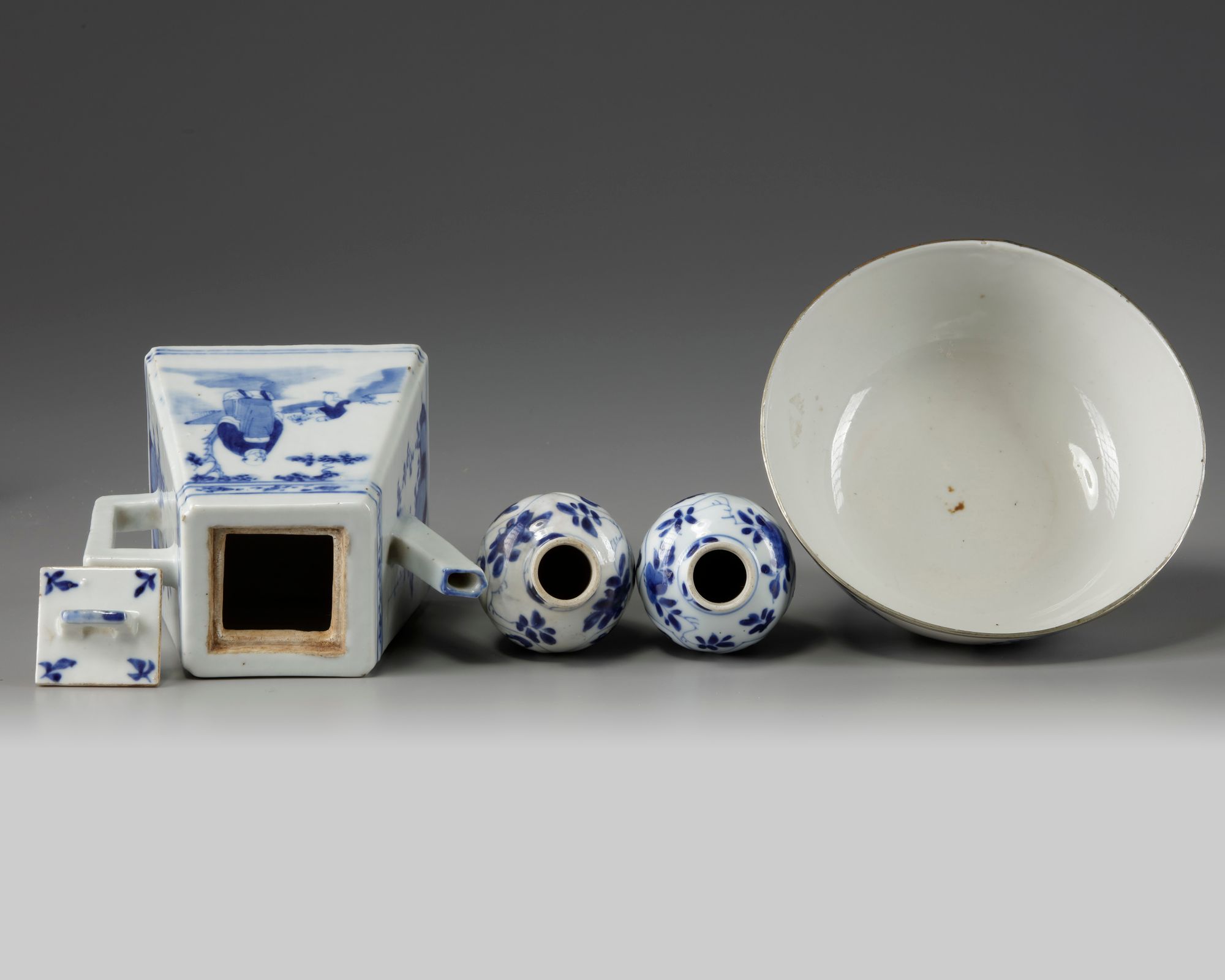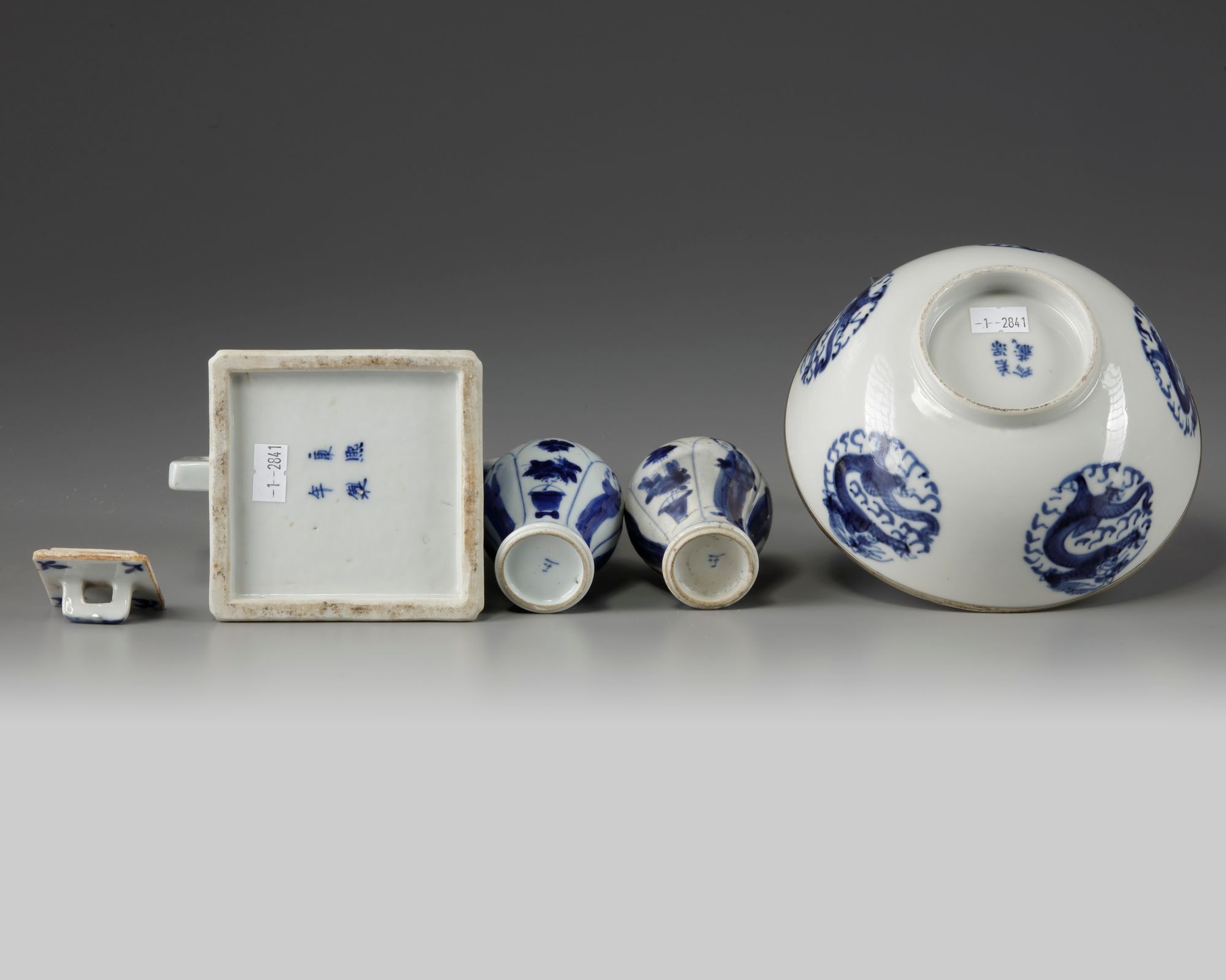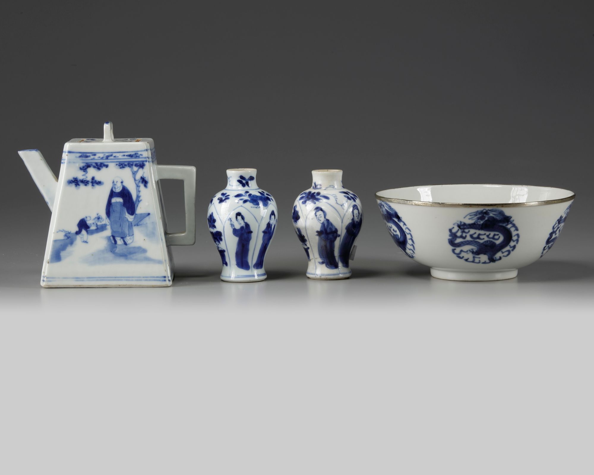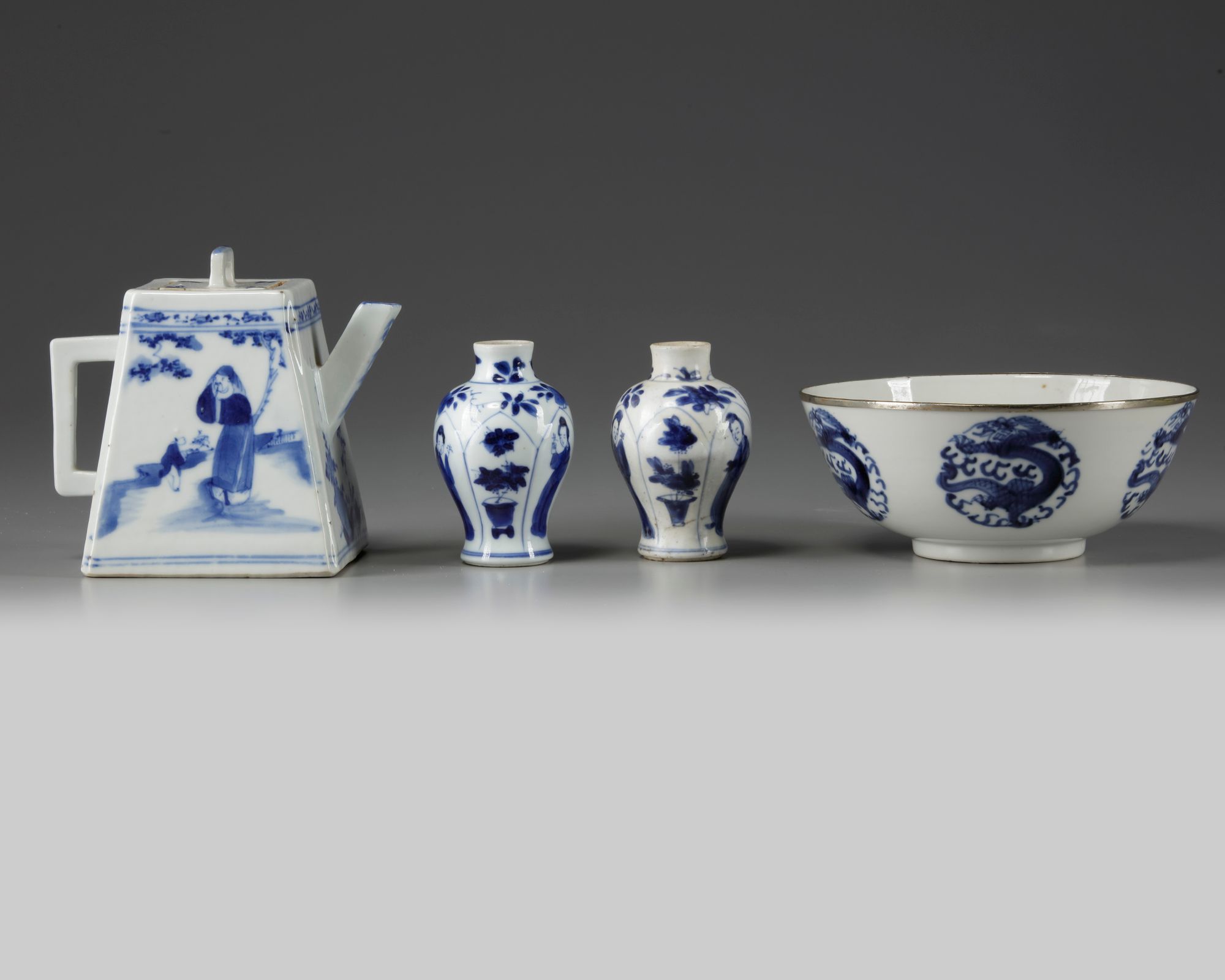 The group comprises: two small moulded vases, each decorated with raised petal-shaped panels enclosing ladies, the bases with 'yu' (jade) marks; a blue and white trapezoidal teapot decorated with scholars and flowers; and a blue and white 'dragon roundel' bowl, the base with a four-character mark in underglaze blue.