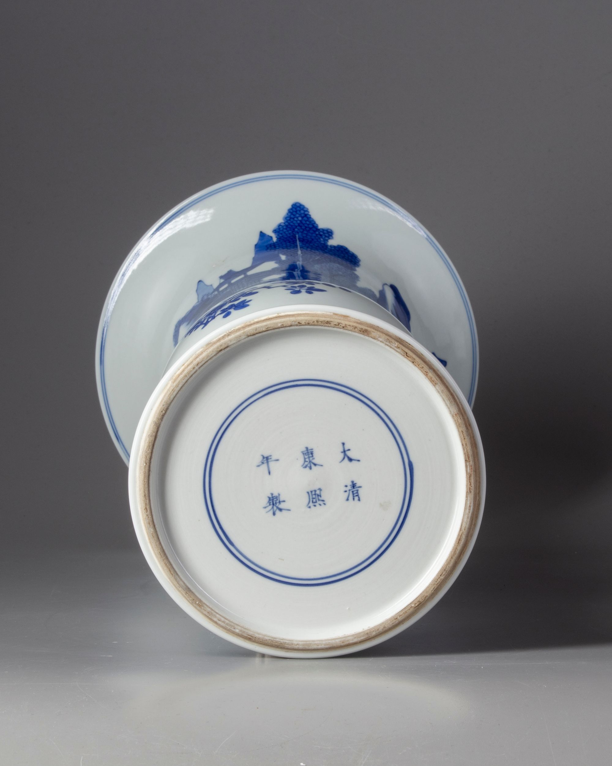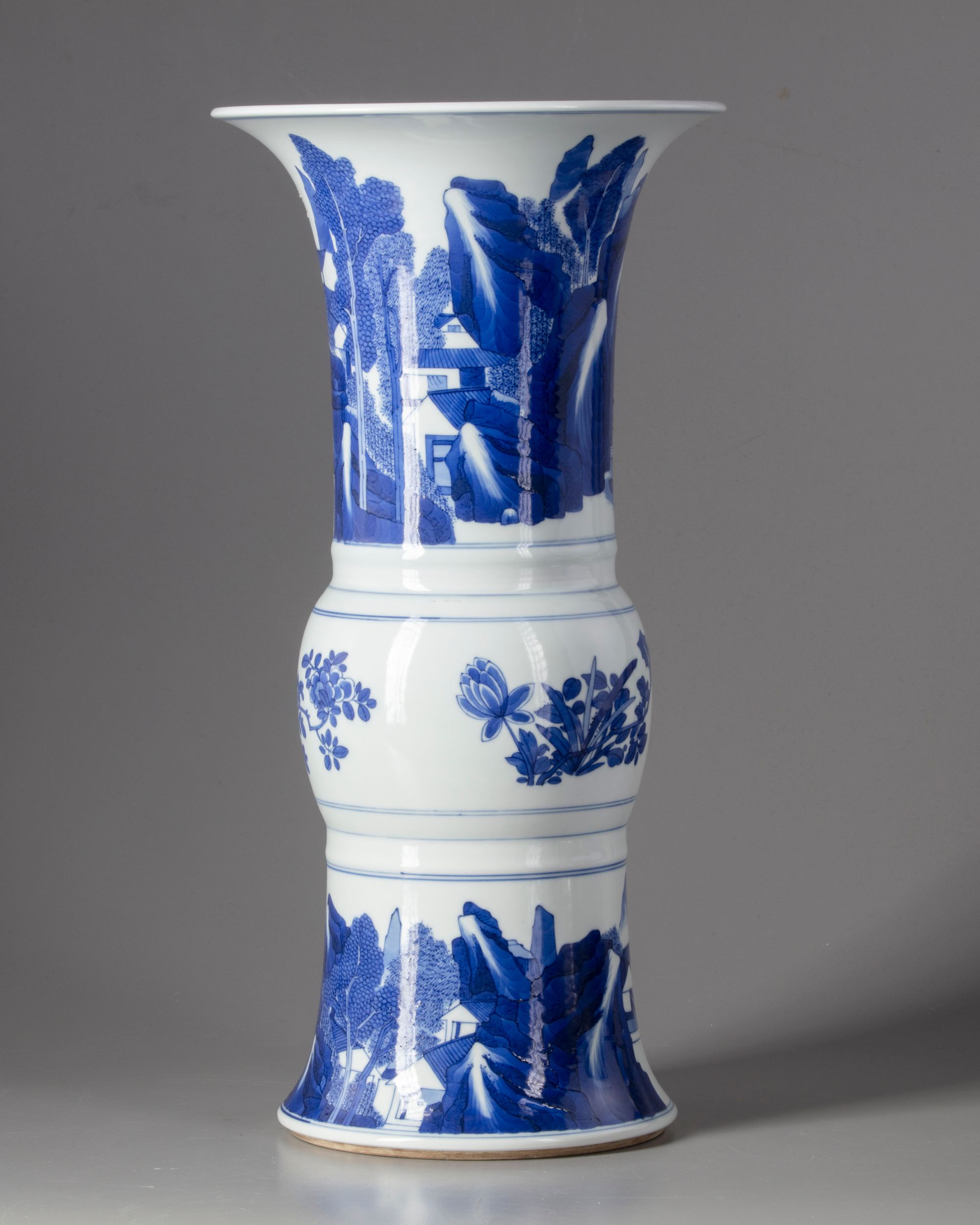 A Chinese porcelain gu vase, decorated in cobalt-blue to the flaring neck and base with figures in sampan in a mountainous landscape. The midsection with peonies and prunus sprigs, the bottom with a Chinese Kangxi six character mark within a double circle.