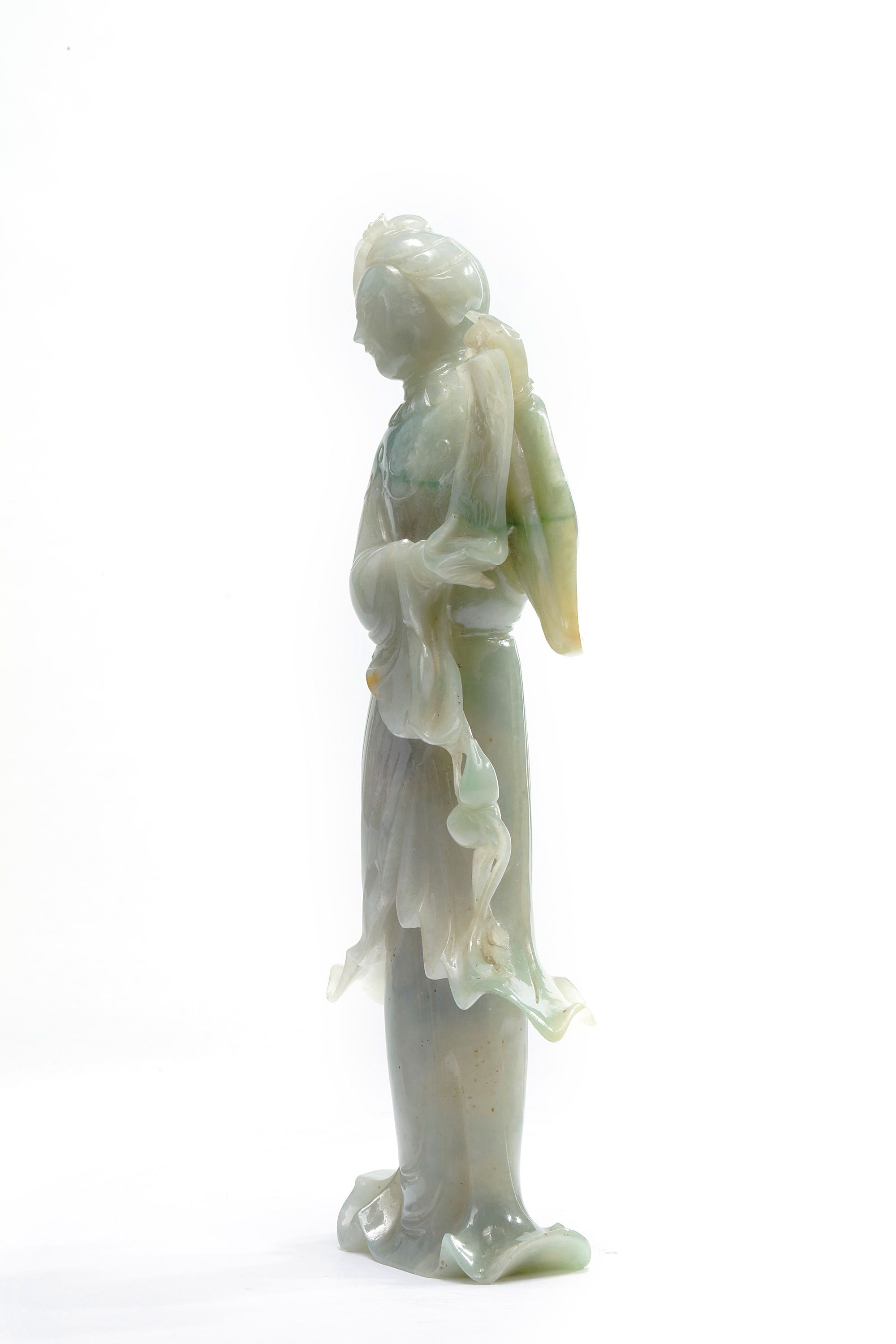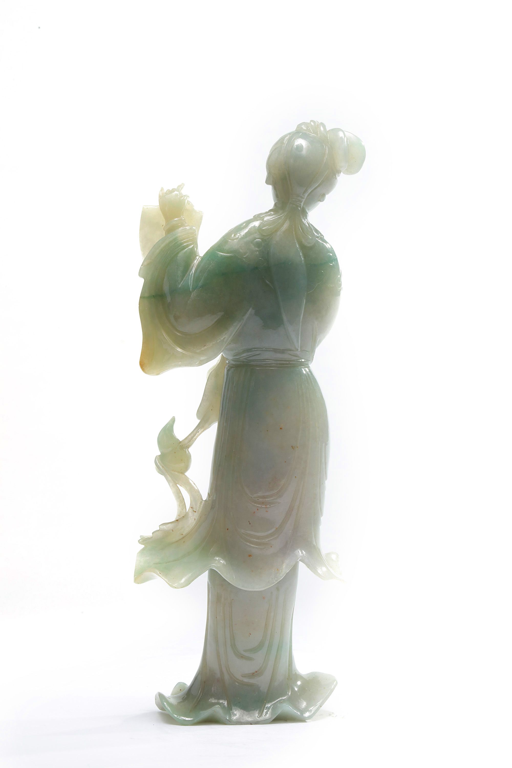 She is carved with her hair in a high chignon, she wears a long robes with a double gourd tied to her waist by a long scarf. Her hands are carved holding up a scroll painting carved with a prunus branch. The stone is of a celadon tone with apple green streaks.