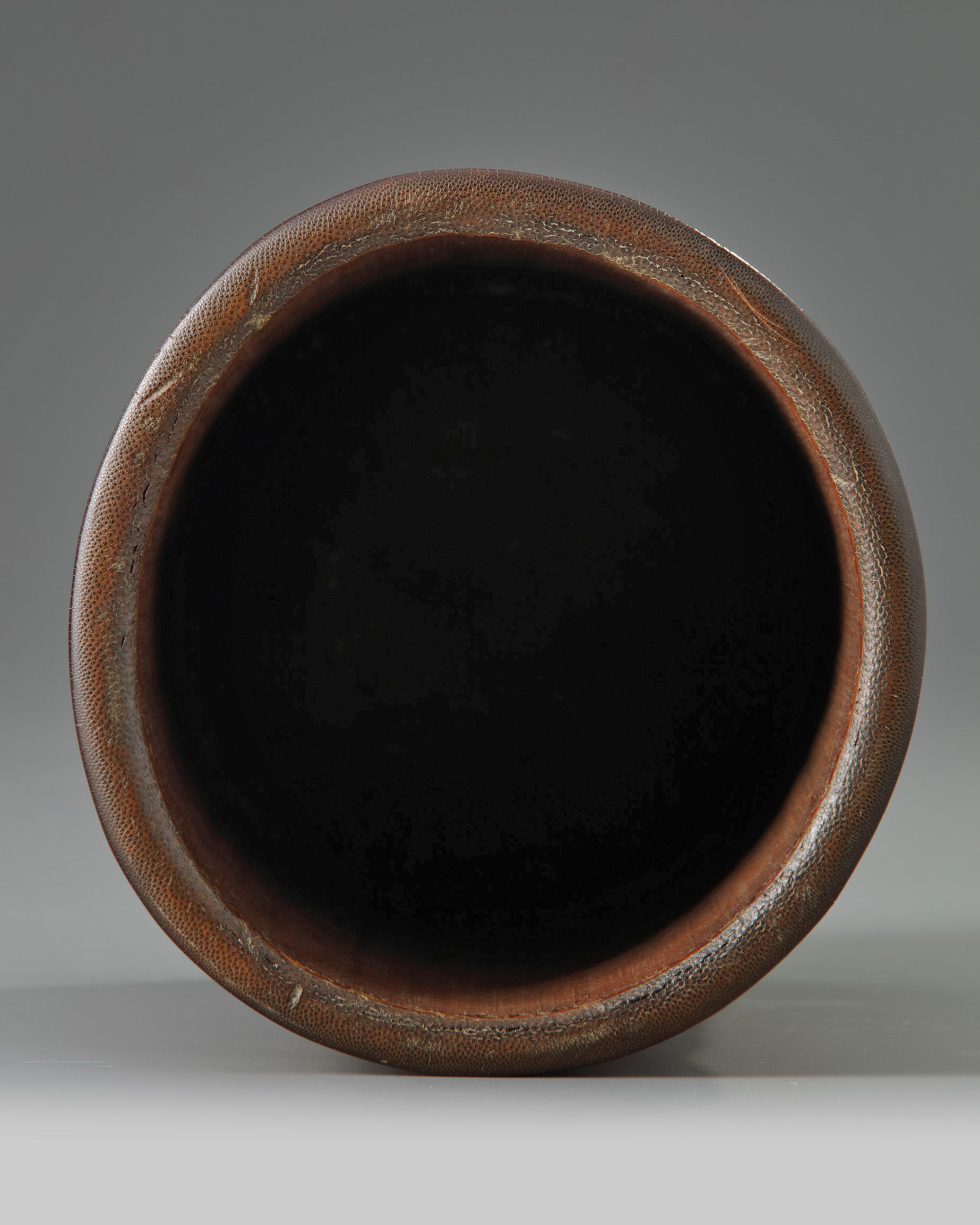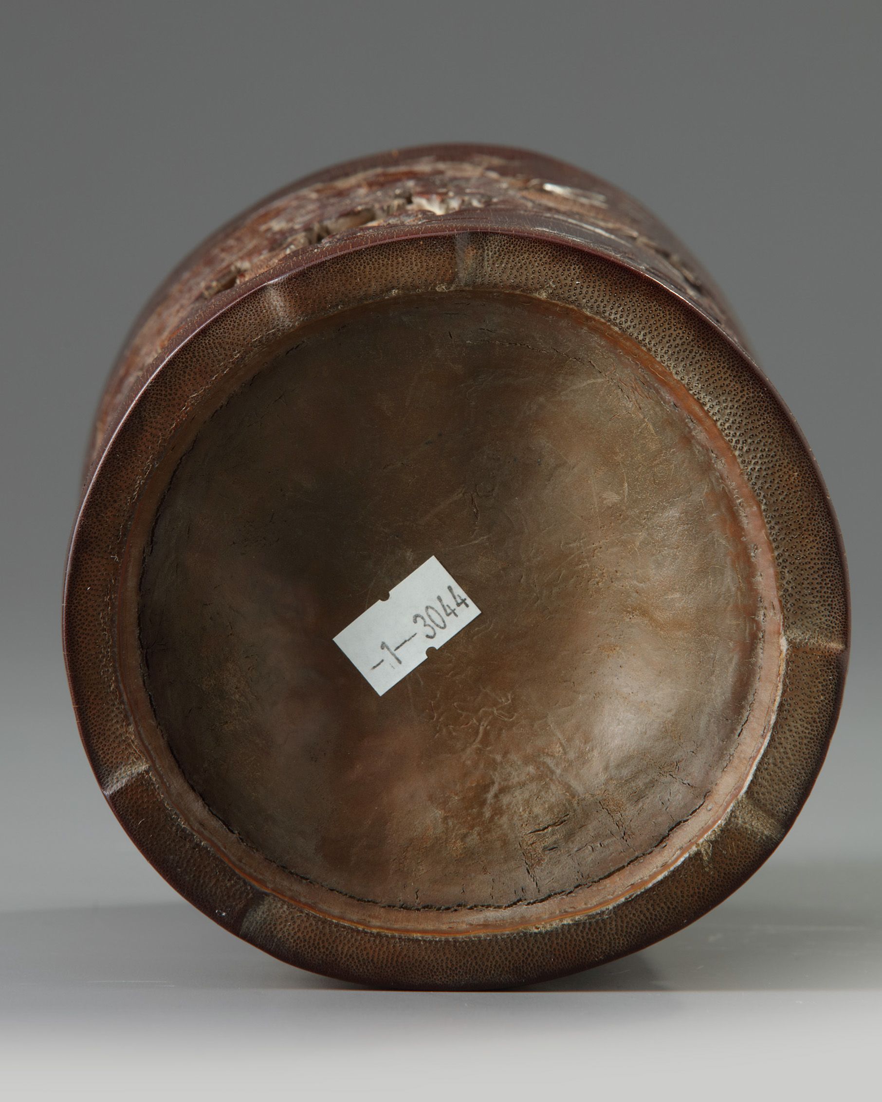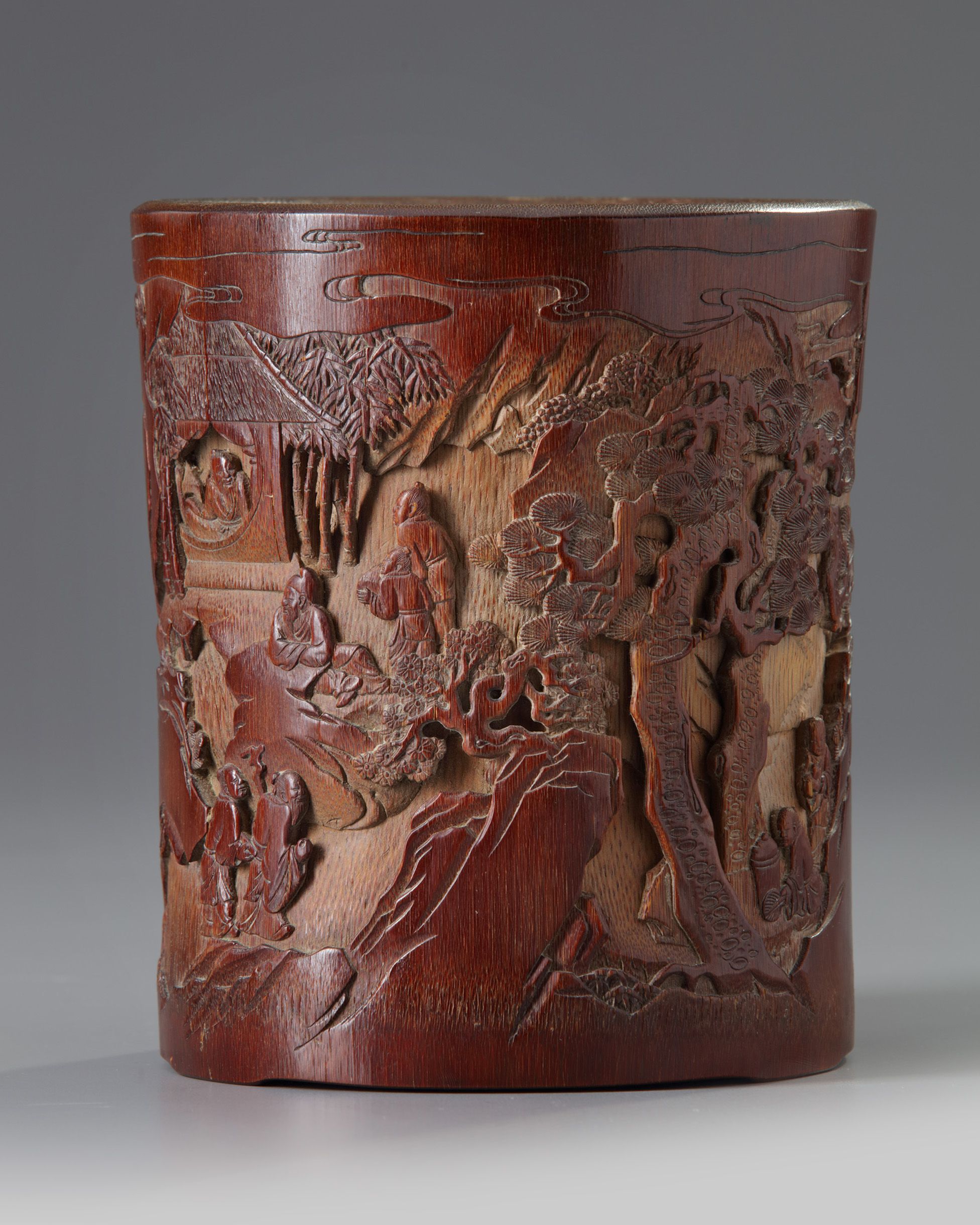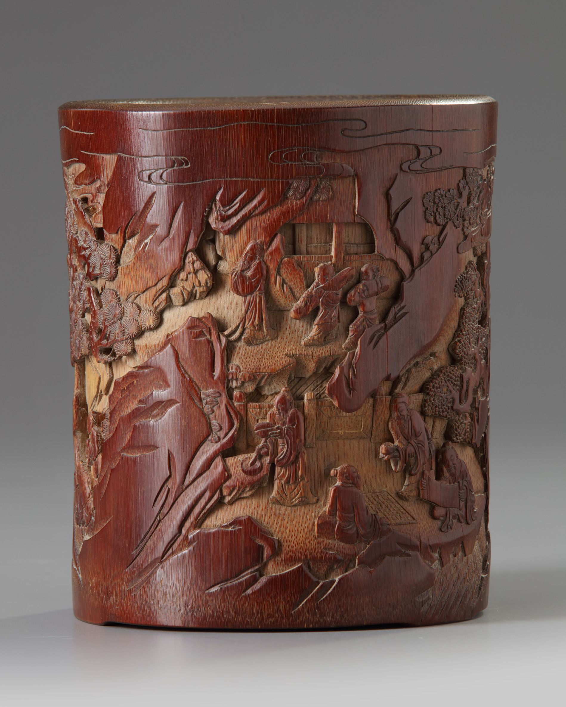 The exterior is carved in relief with a scene of eight scholars and their attendants at leisure amongst pavilions, rocks, pine, wisteria and bamboo. The reverse is incised Xiao Jiang zhi (made by Xiao Jiang).