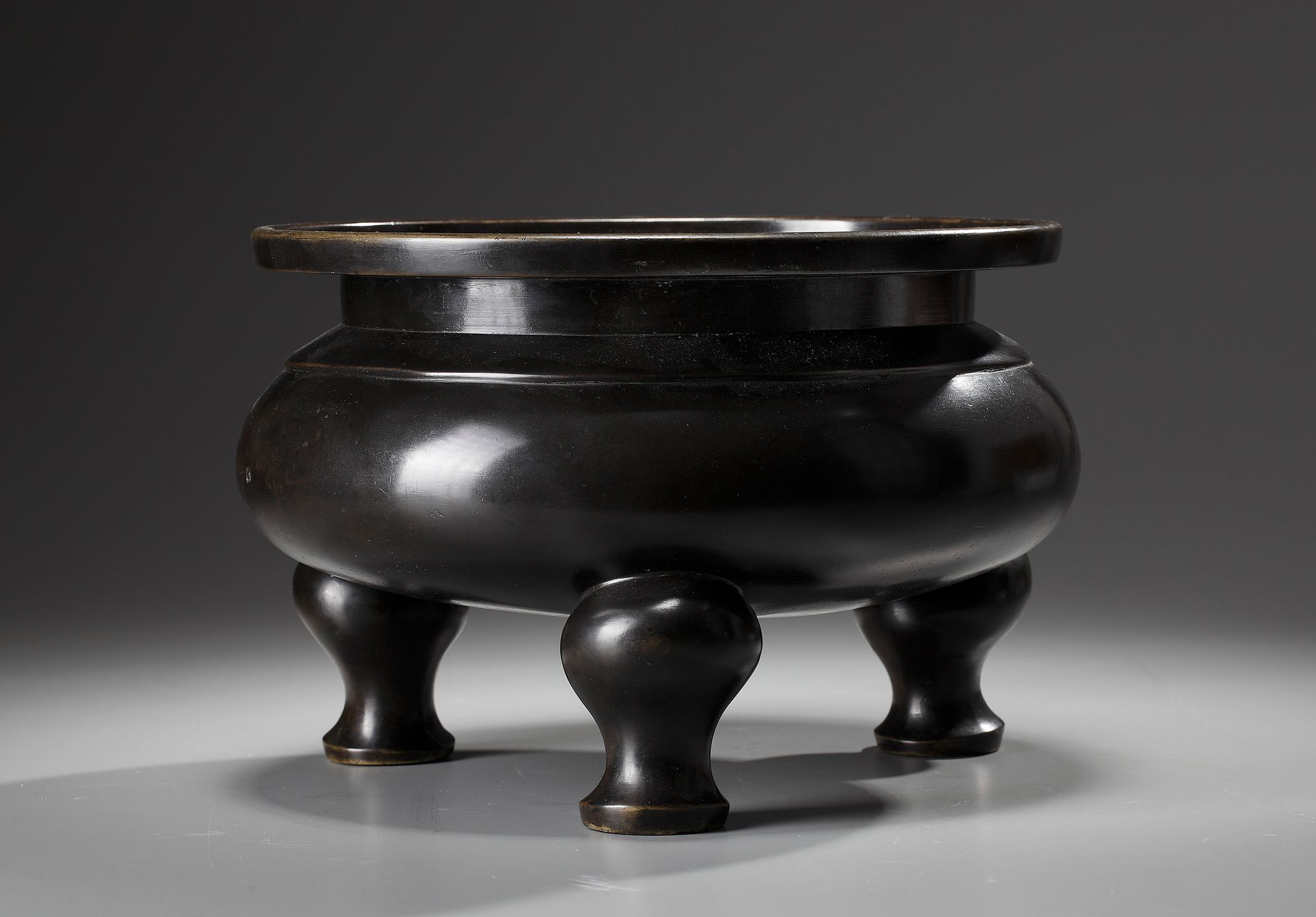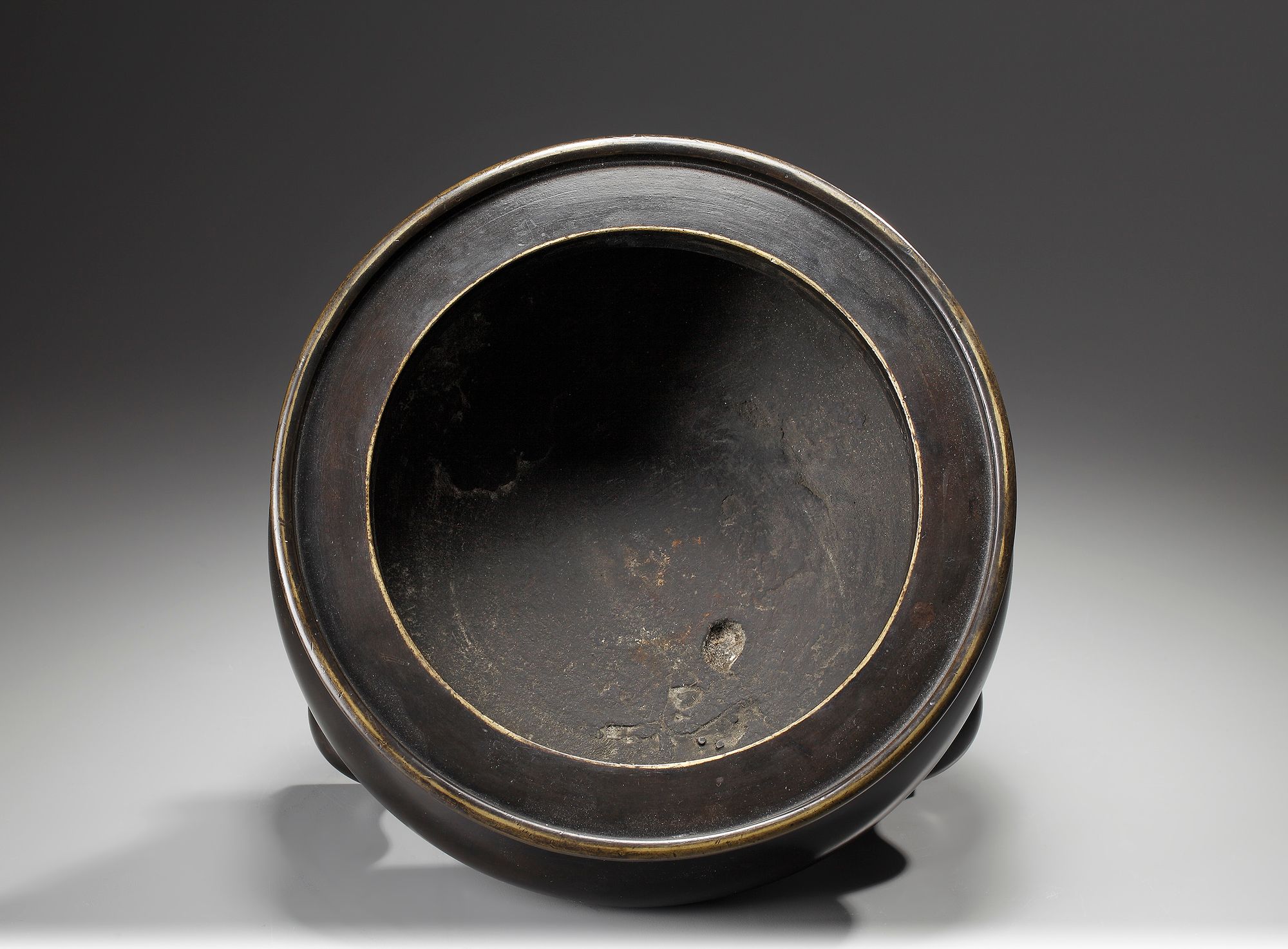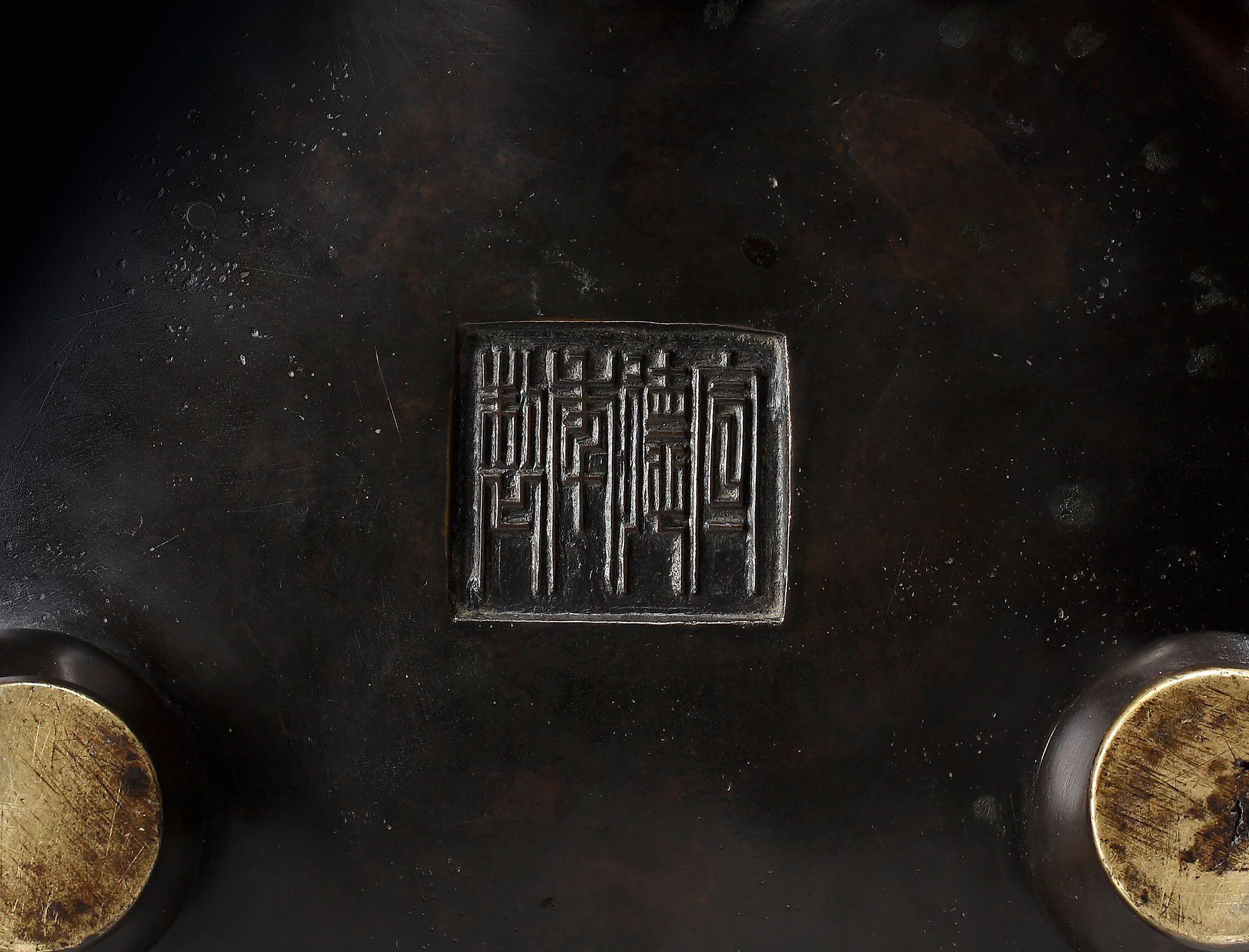 The censer is of a compressed form and a thick angular rim, it stands on three cabriole legs. The base is marked with an apocryphal Xuande seal mark.