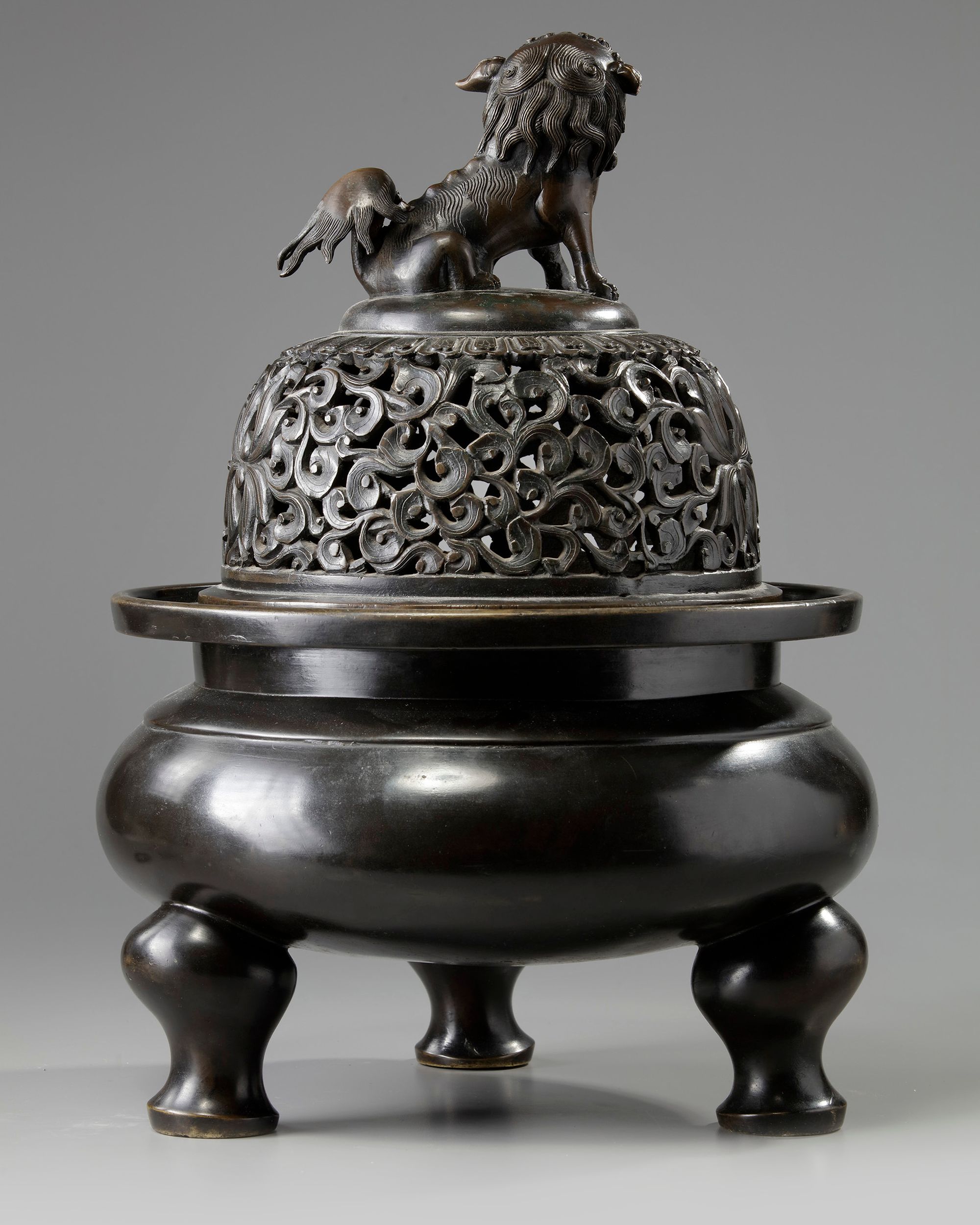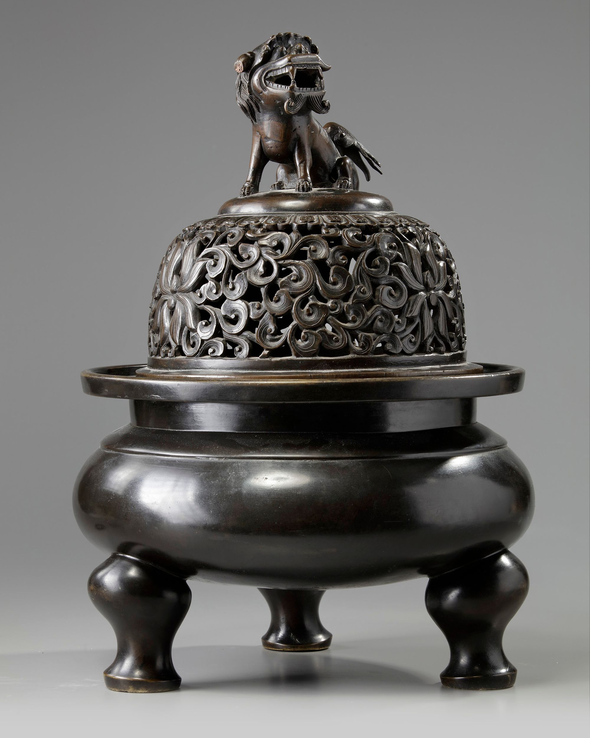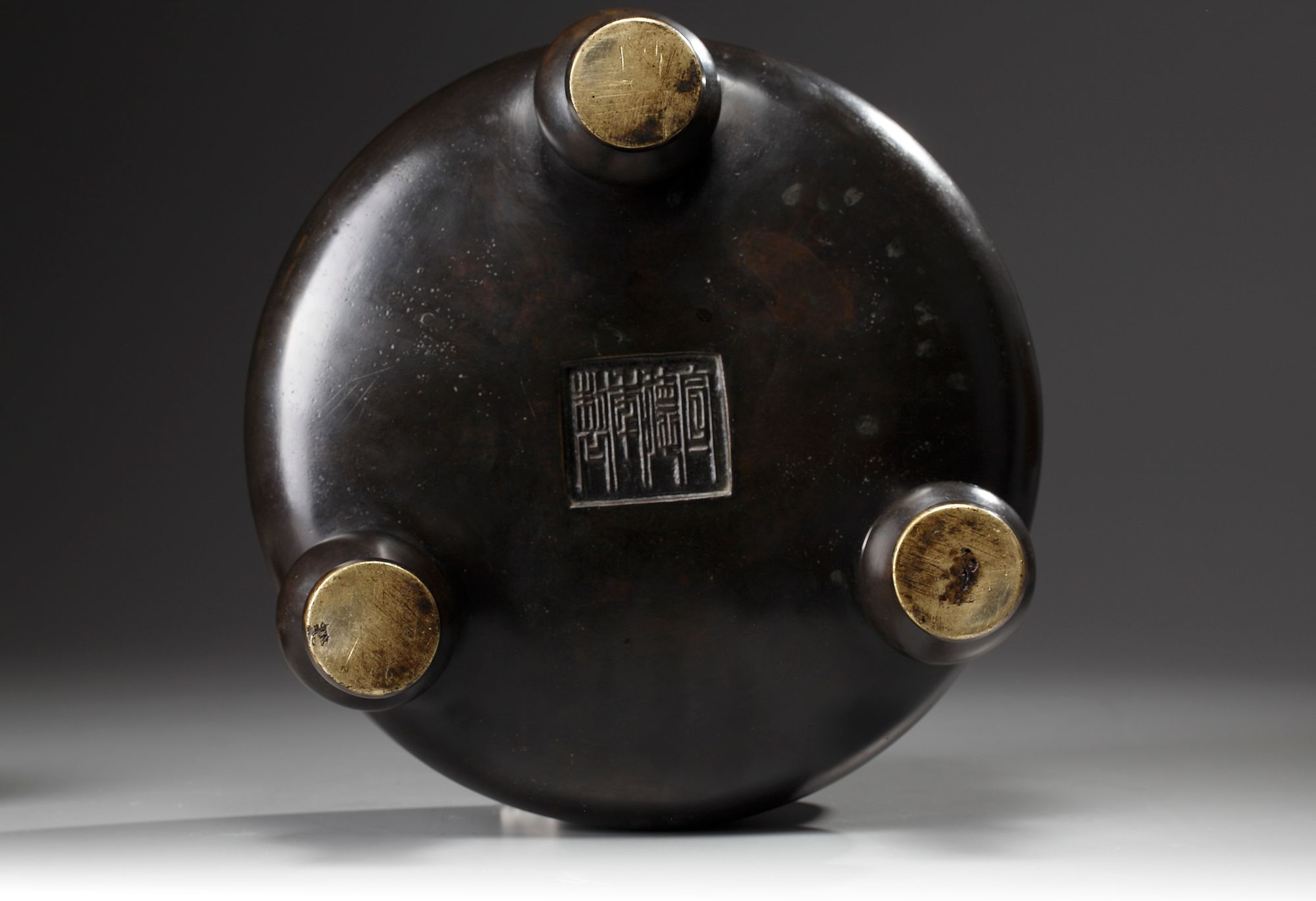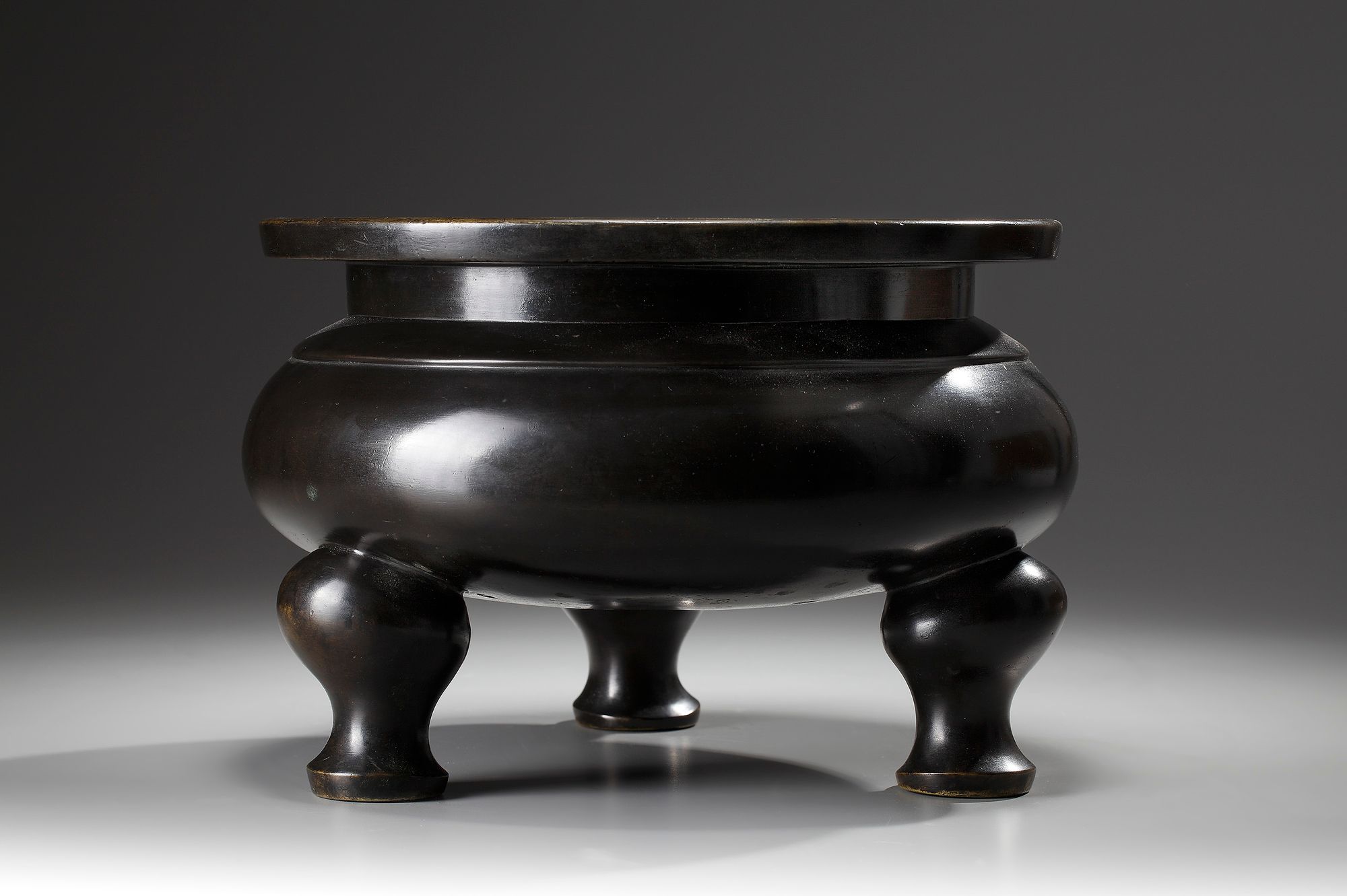 The censer is of a compressed form and a thick angular rim, it stands on three cabriole legs. The base is marked with an apocryphal Xuande seal mark.