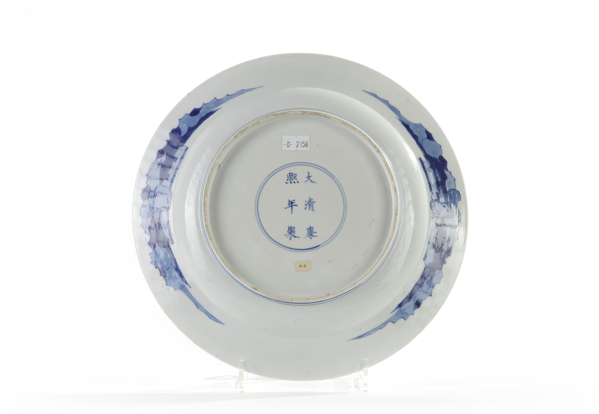 Decorated with three ladies, two holding osmanthus blossoms, amongst plantain on a terrace in a fenced garden. The rim decorated with cartouches enclosing peaches, all on a diaper ground. The reverse decorated with mountains.