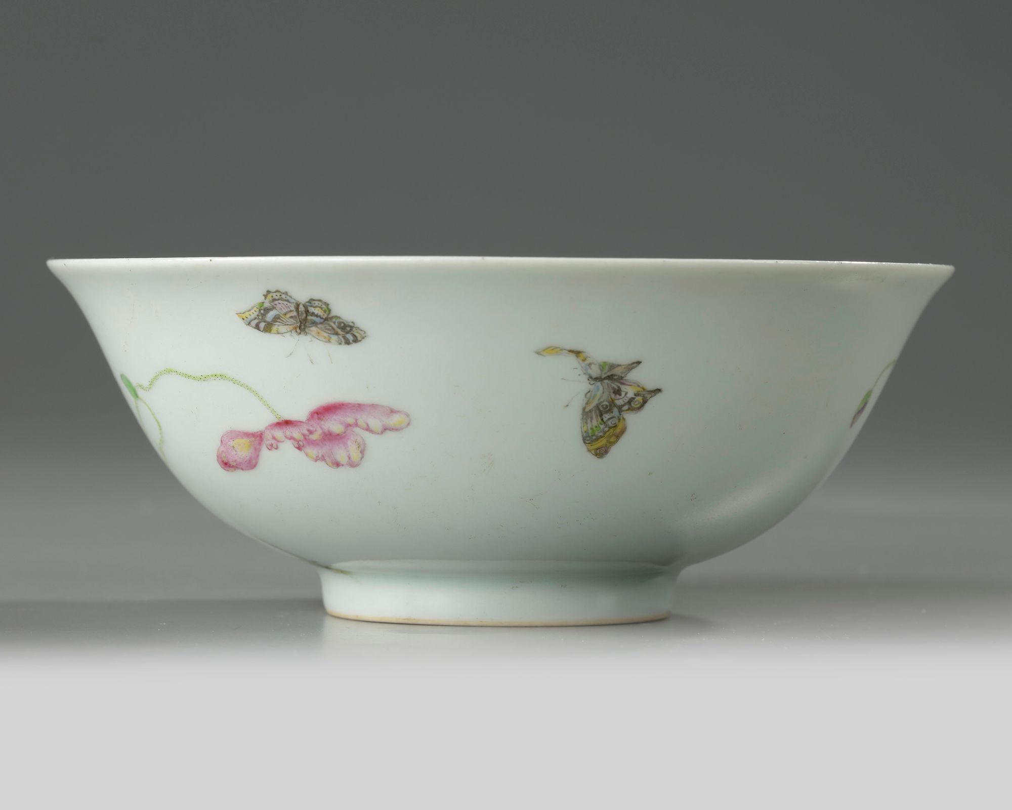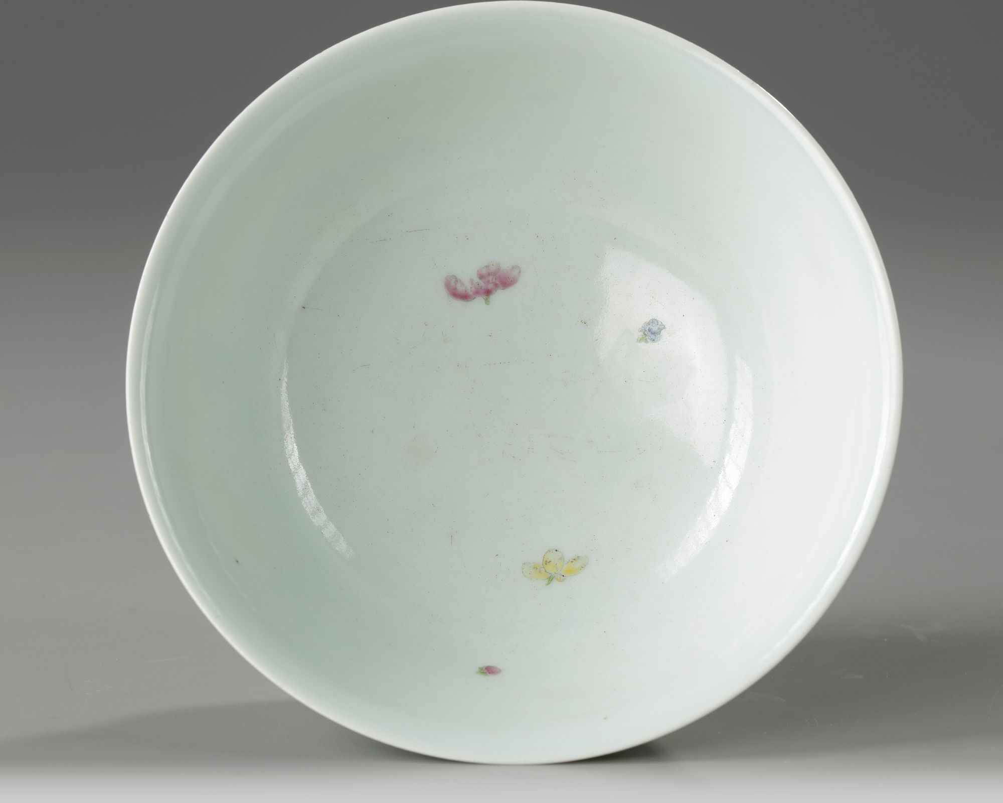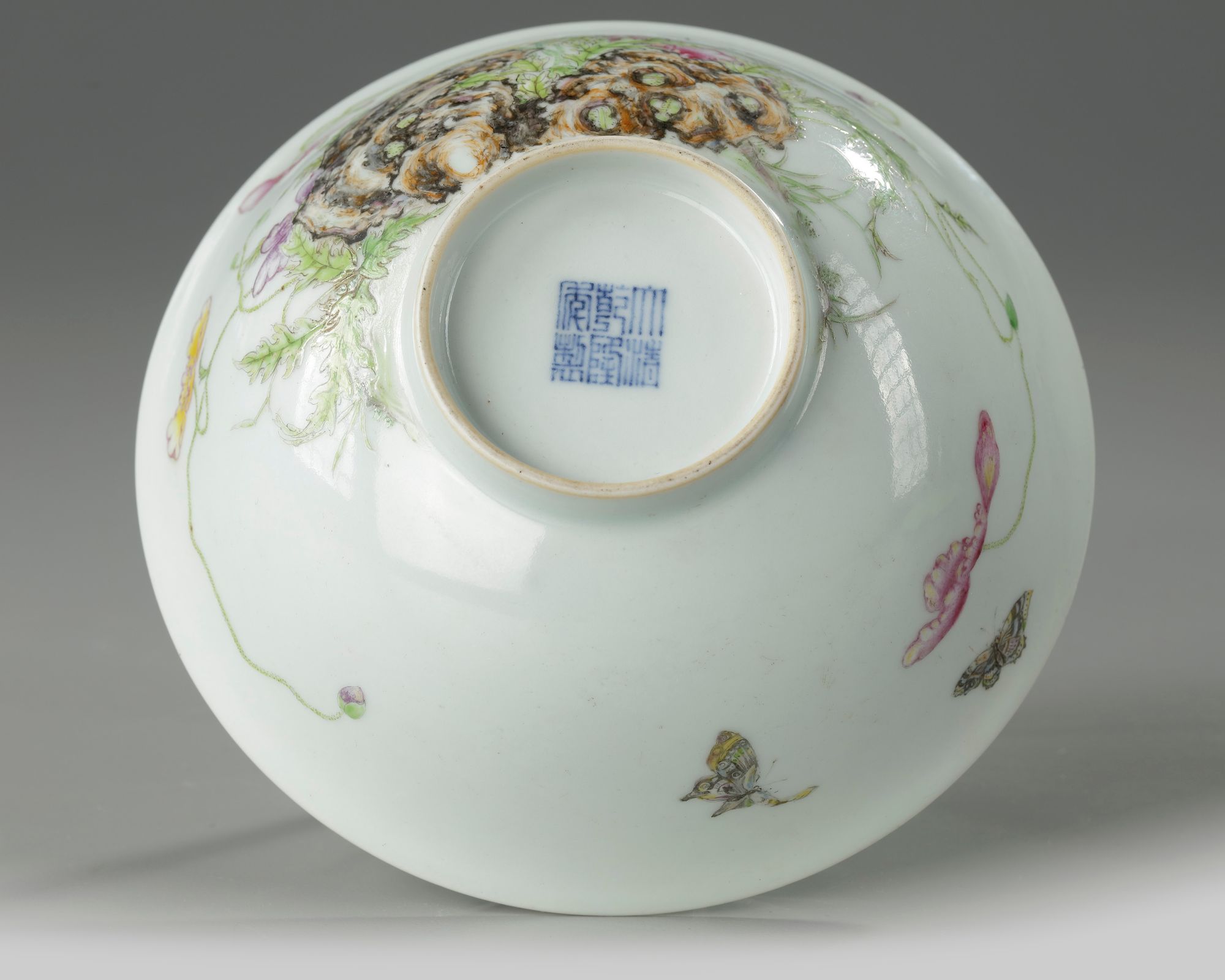 The bowl is decorated to the exterior with blossoming poppies and buds growing from gnarled rocks, all amongst butterflies in flights. The interior is decorated with a few scattered flower sprays. The base with an apocryphal Qianlong mark.