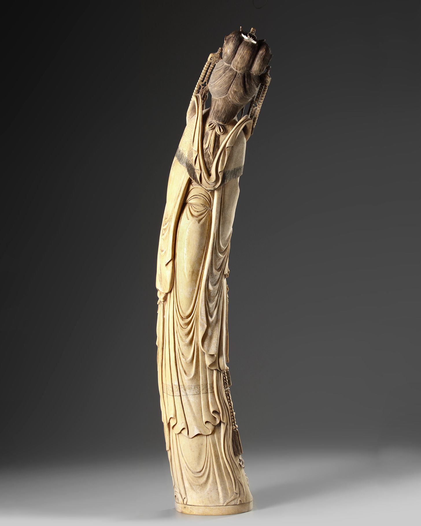 The piece carved as a figure of Guanyin wearing an elaborate headdress and long robes. She holds a staff bearing delicate flowers and she is accompanied by a boy attendant and a phoenix.