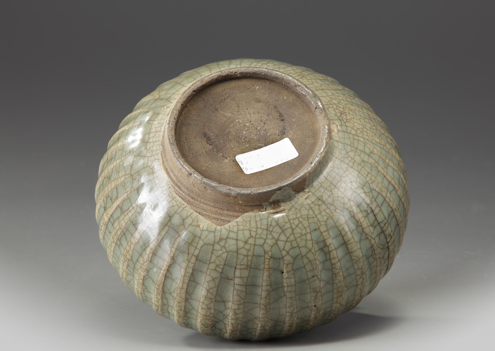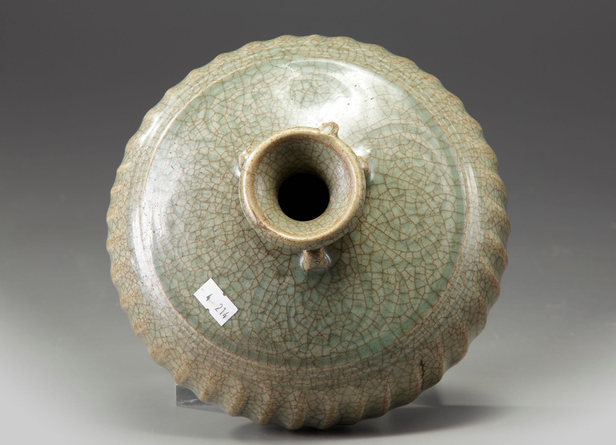 The squat jar is decorated with three slender strap handles to the neck, an incised floral band to the shoulder, and ribbed flutes to the globular body. The jar is covered overall in a crackled olive-celadon glaze stopping just above the foot.