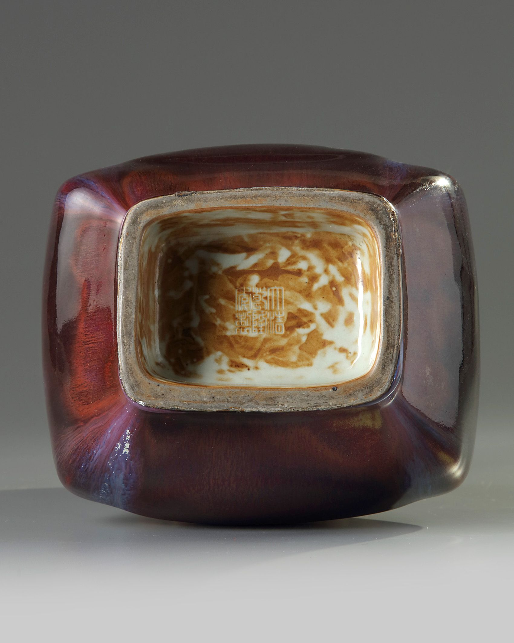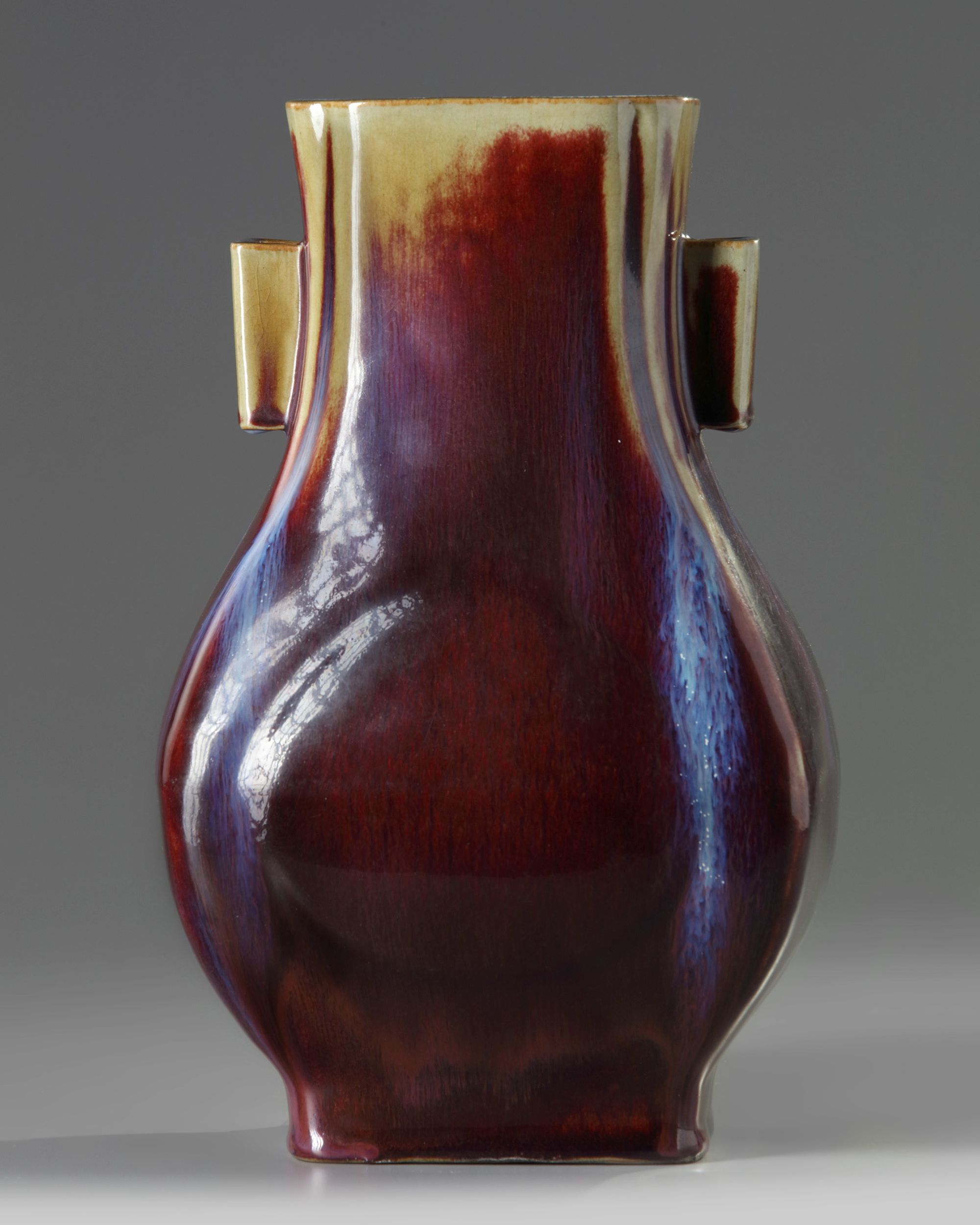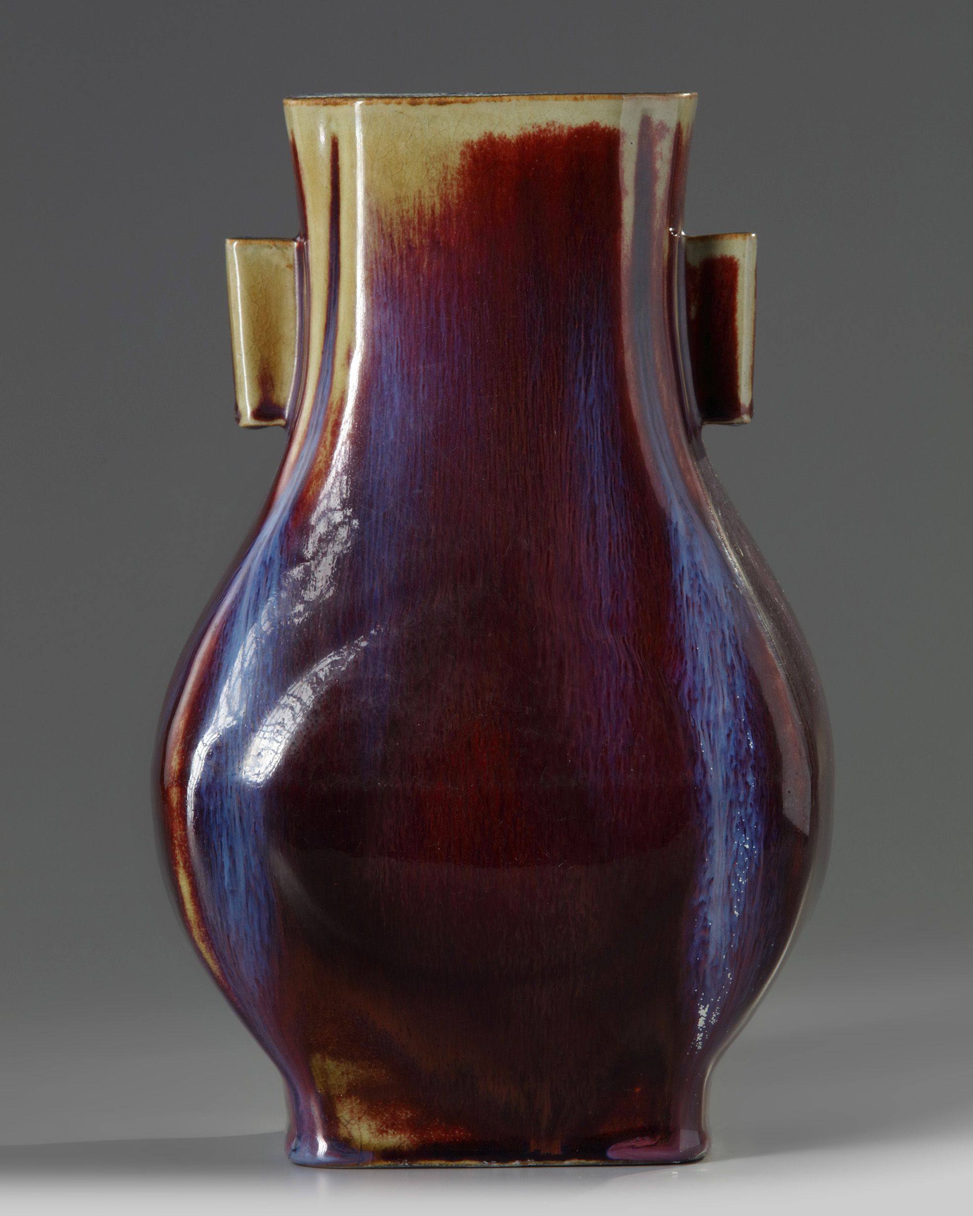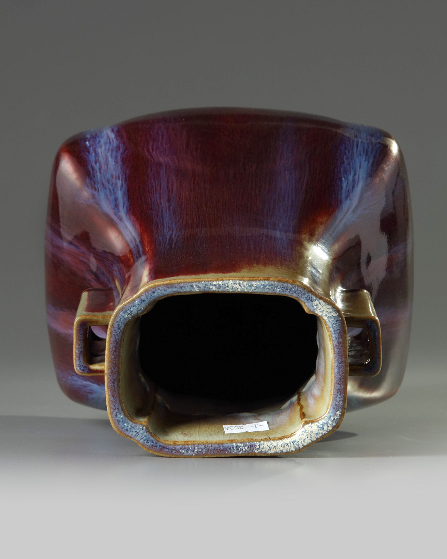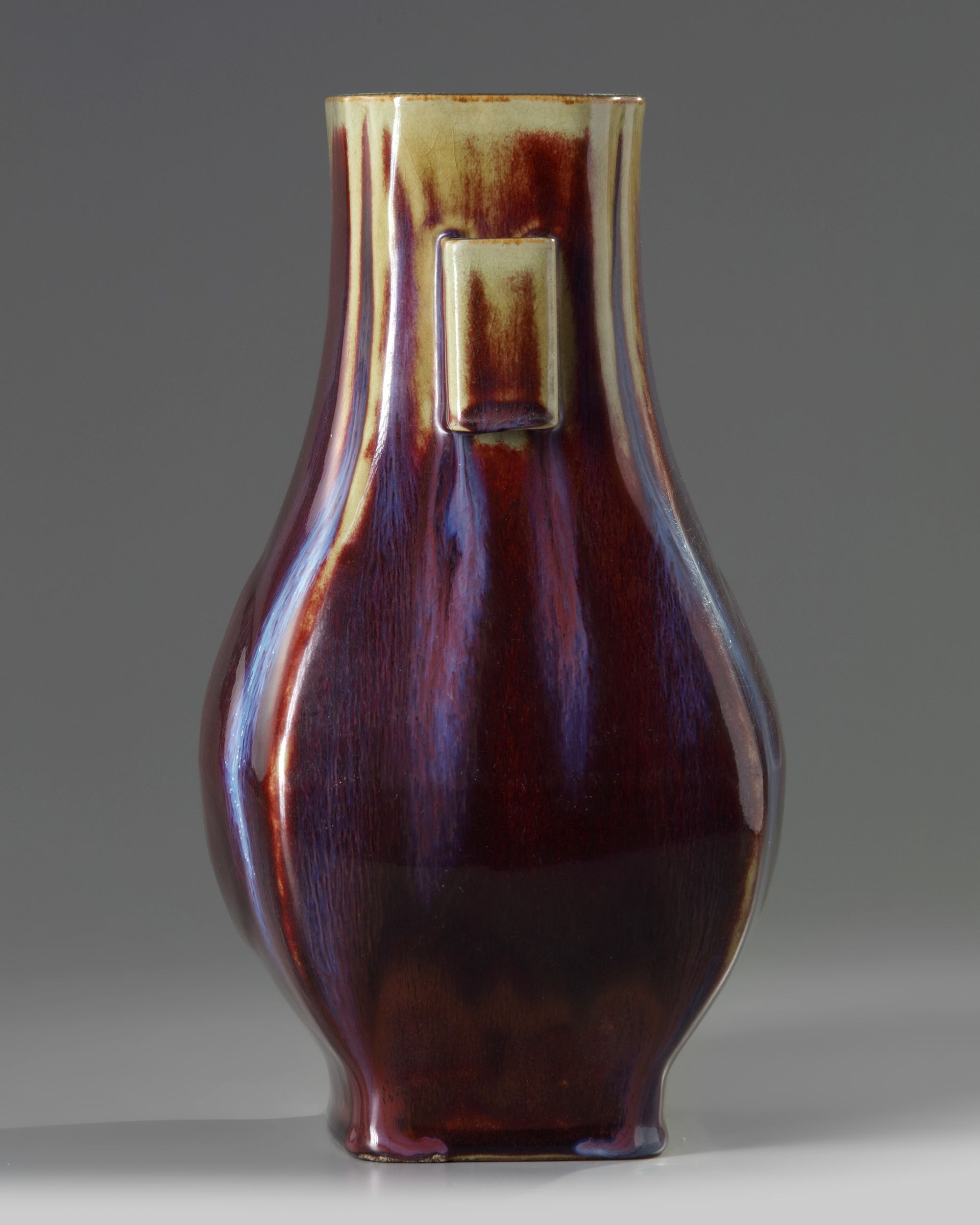 The vase is crafted with canted corners and the neck with to rectangular handles. Each side is moulded with two peach-shaped panels. The vase is covered with a finely crackled glaze of sang-de-boeuf tone splashed with purple striations which thins to a beige tone with some opaque white splashes at the edges and rim. The base with an apocryphal Qianlong mark.