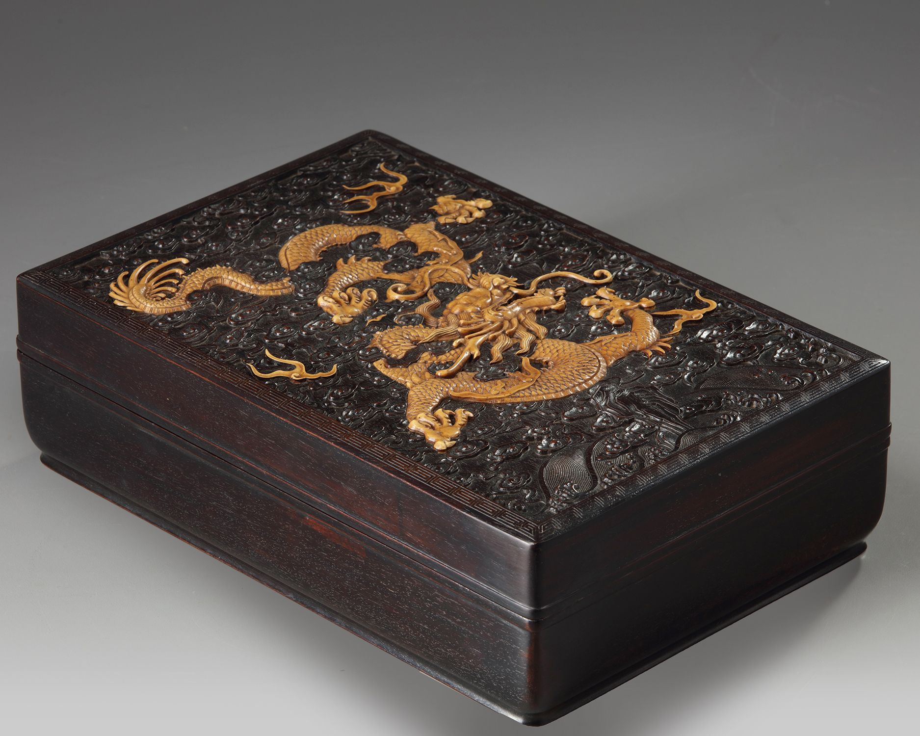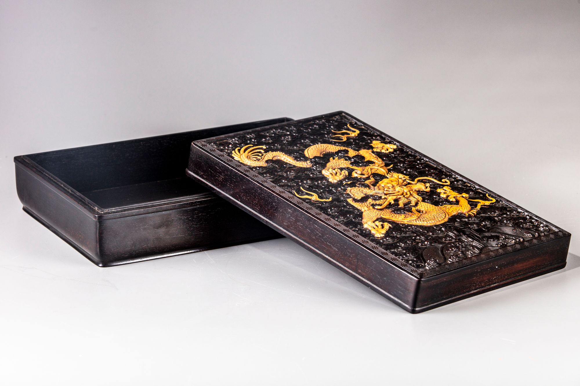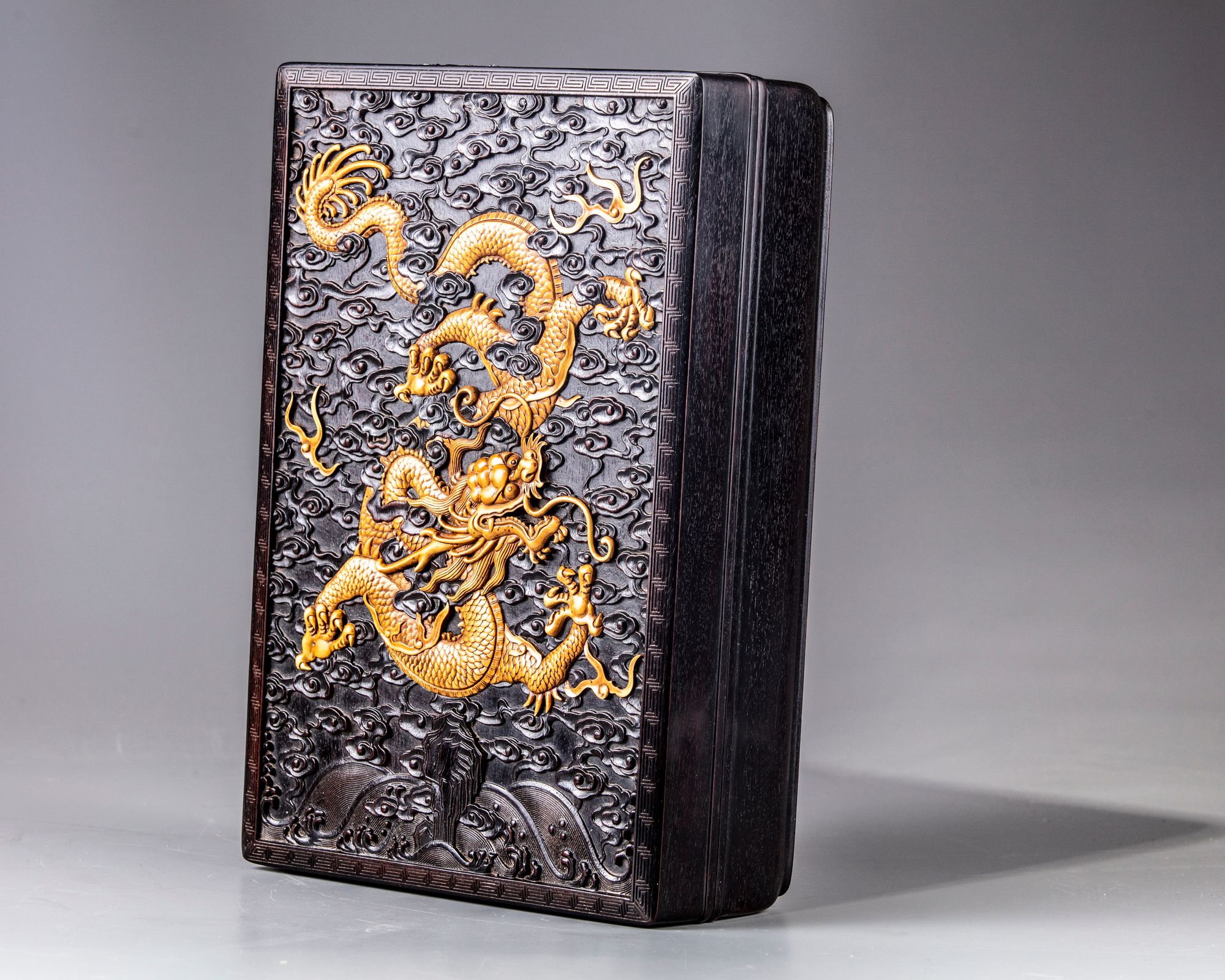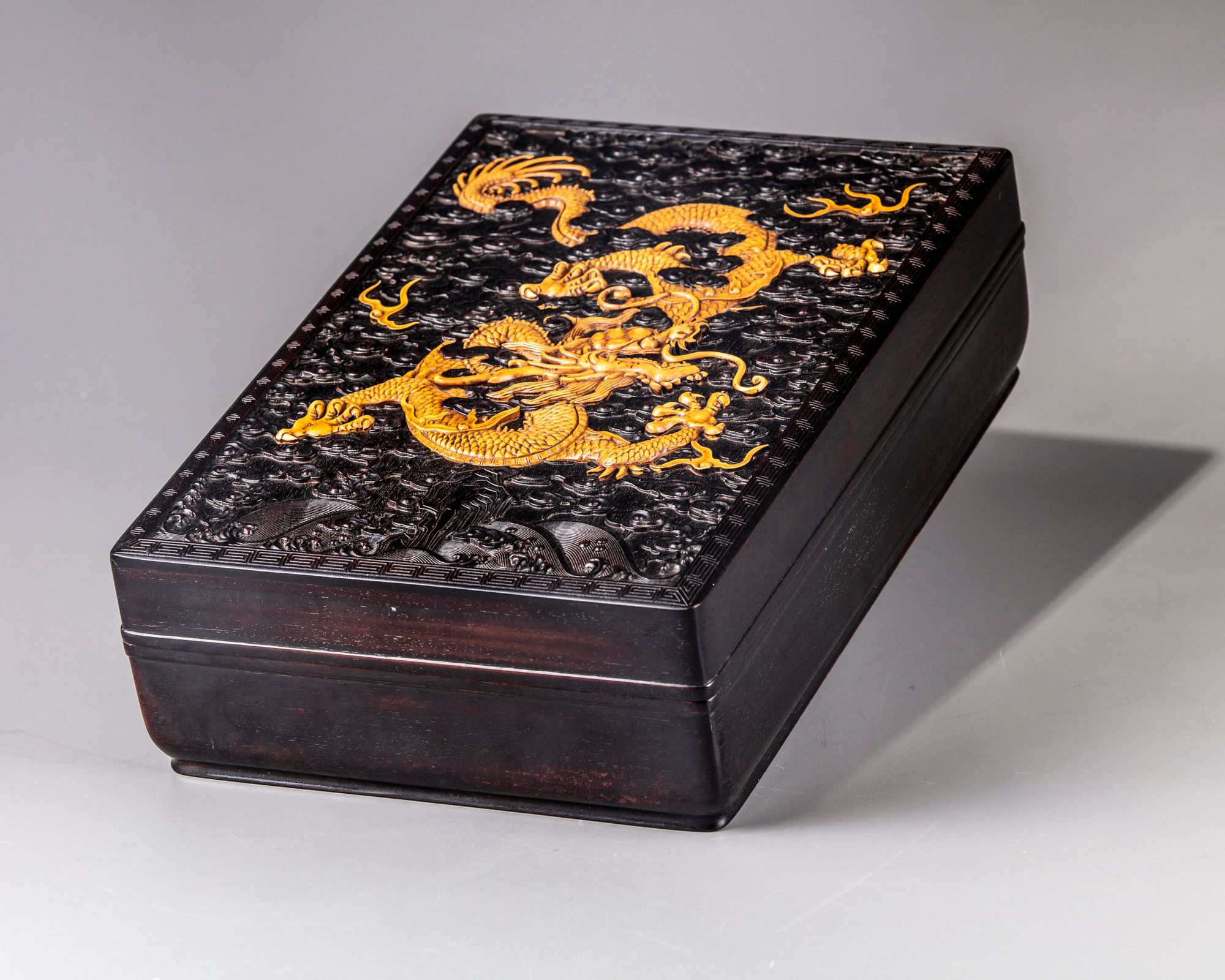 The rectangular box is well carved with a five clawed dragon highlighted in gilt and a bat amongst tumultuous waves. All on waves and surrounded by a carved key fret chain.