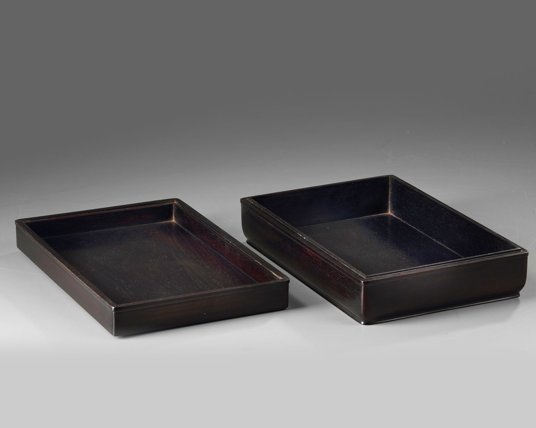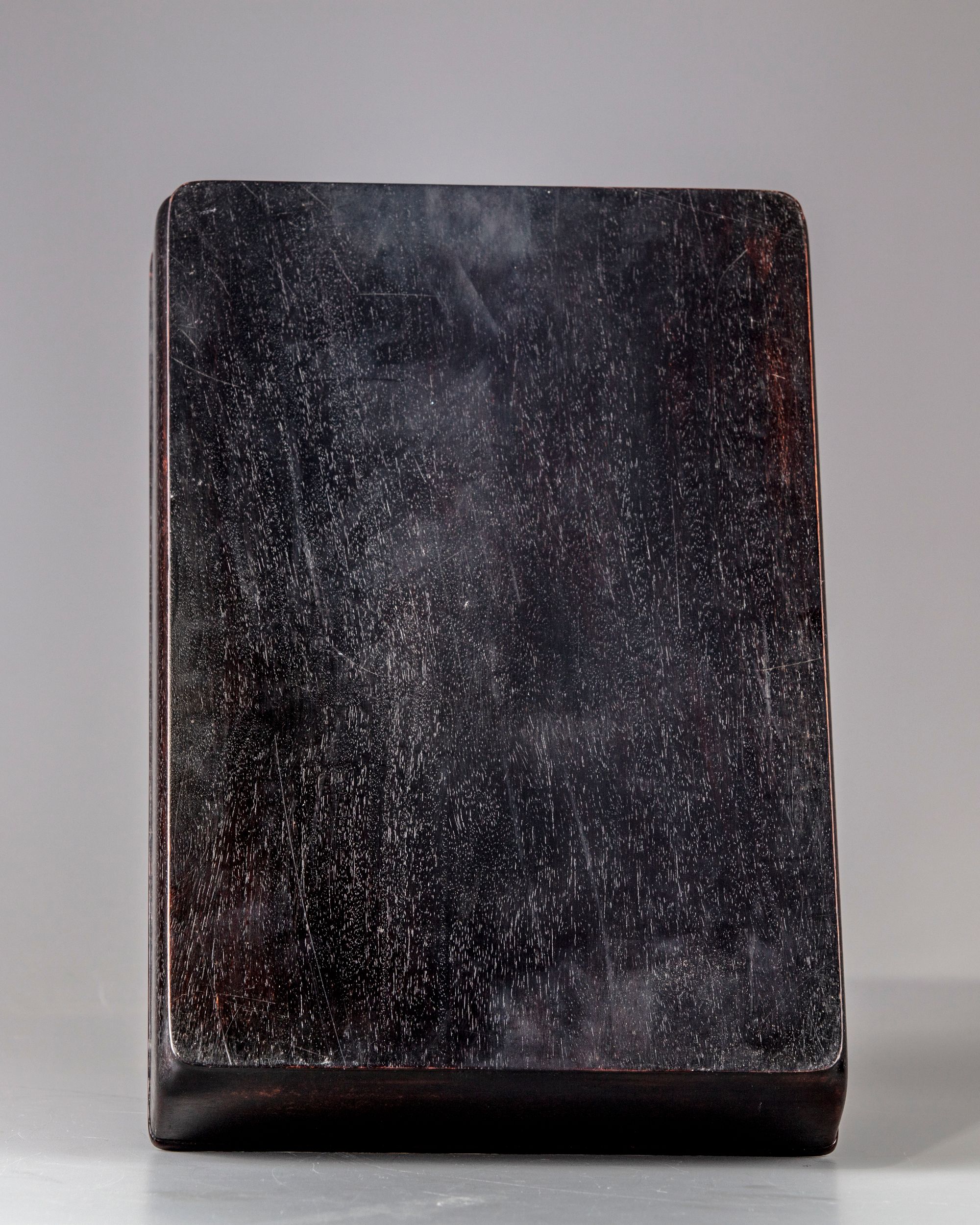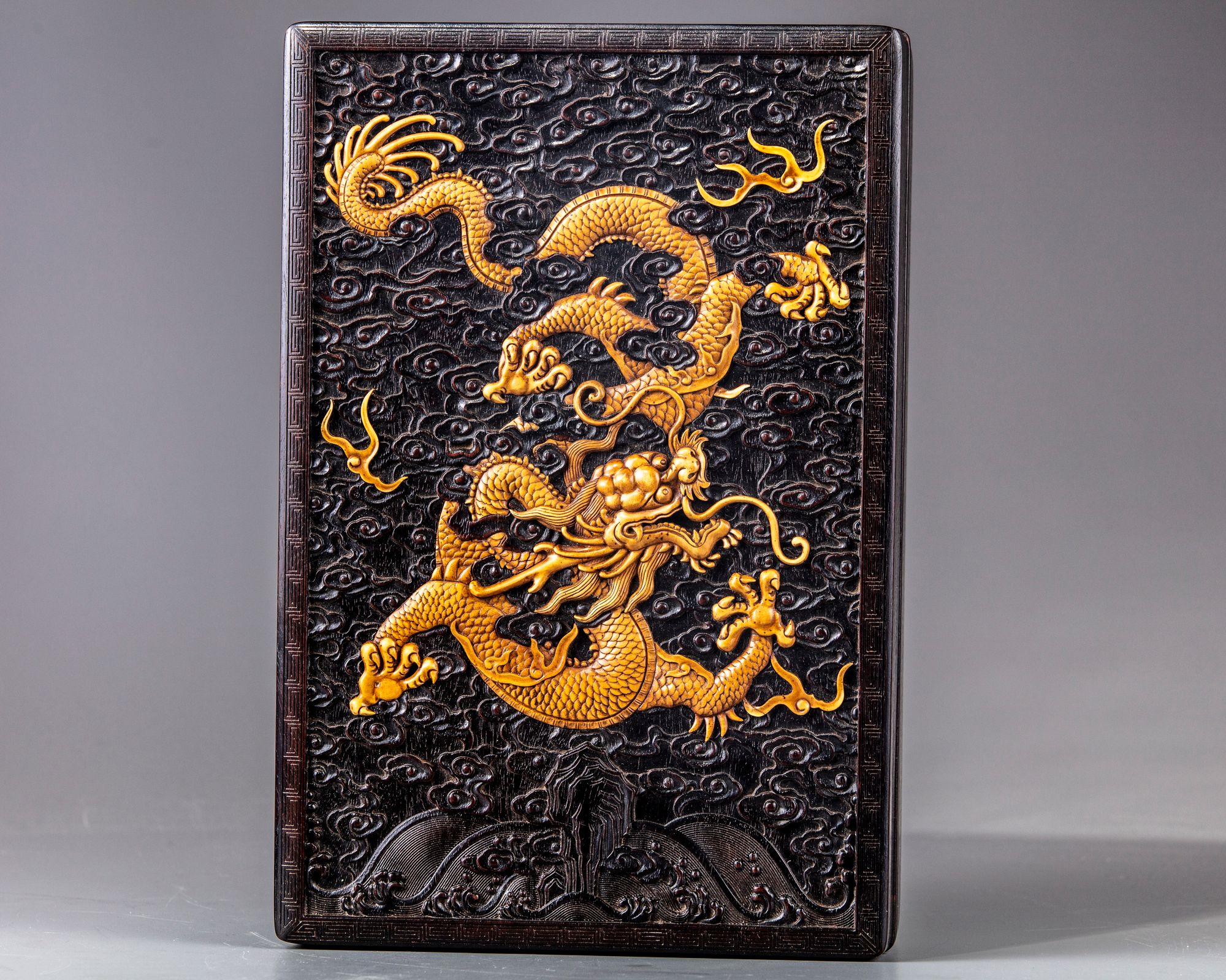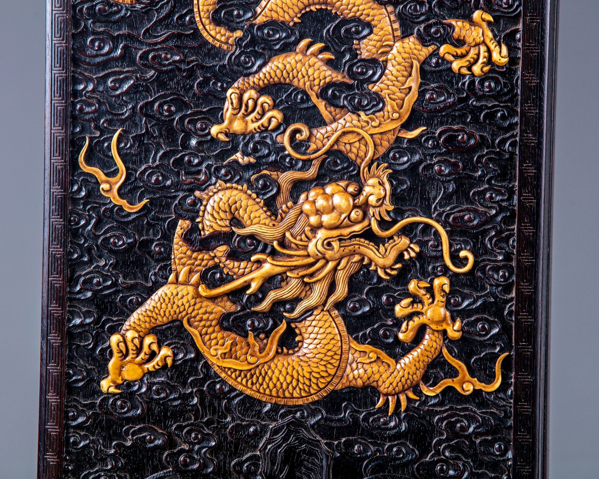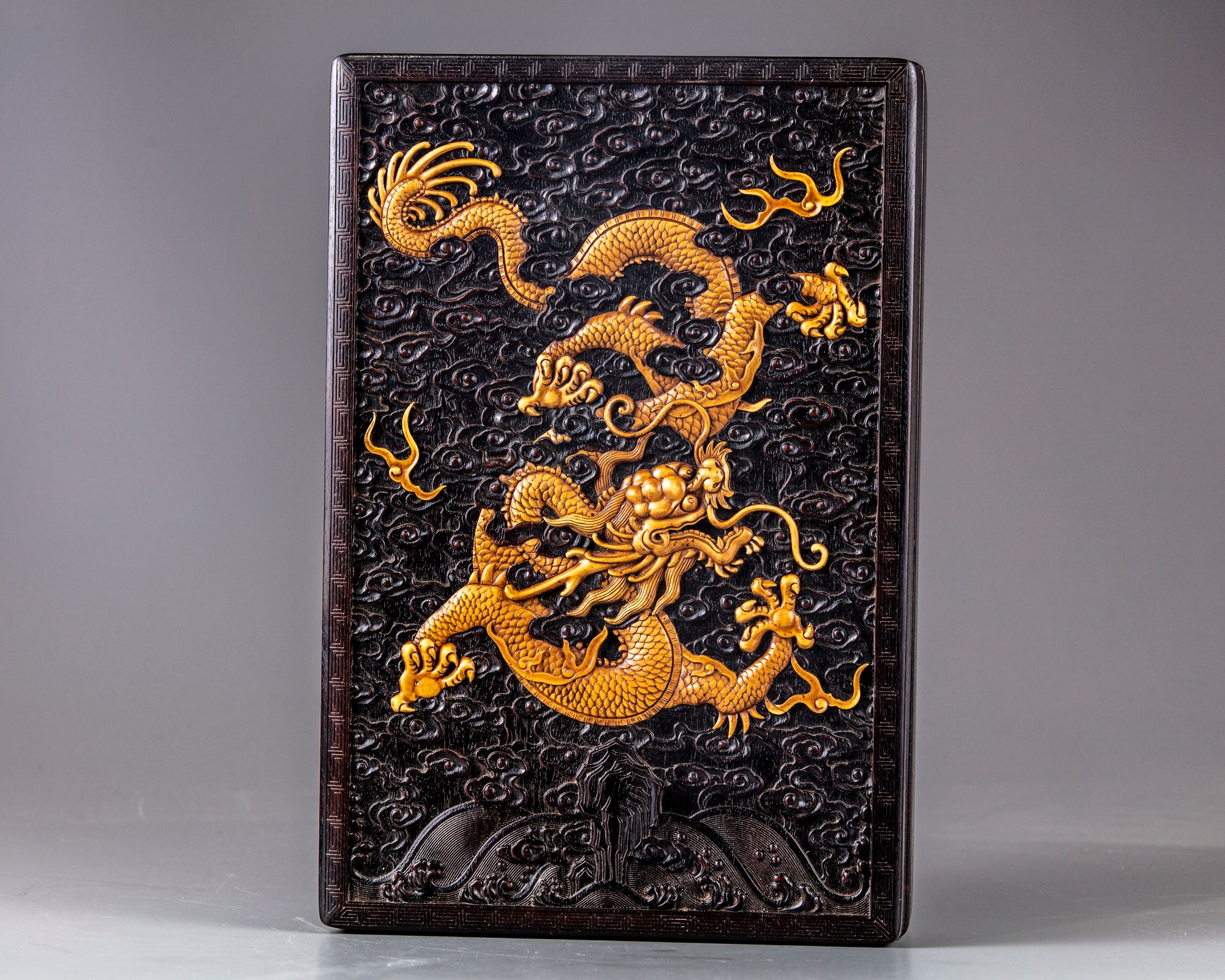 The rectangular box is well carved with a five clawed dragon highlighted in gilt and a bat amongst tumultuous waves. All on waves and surrounded by a carved key fret chain.