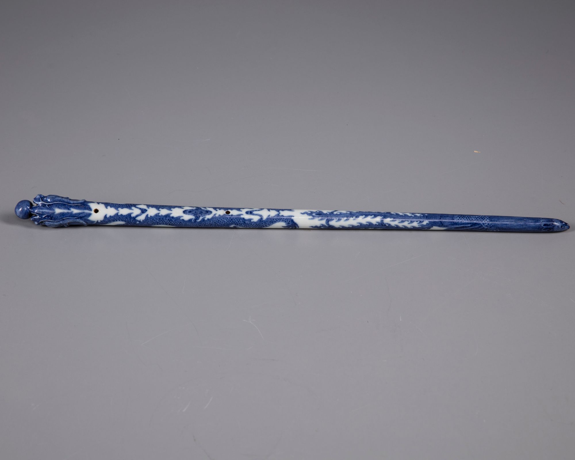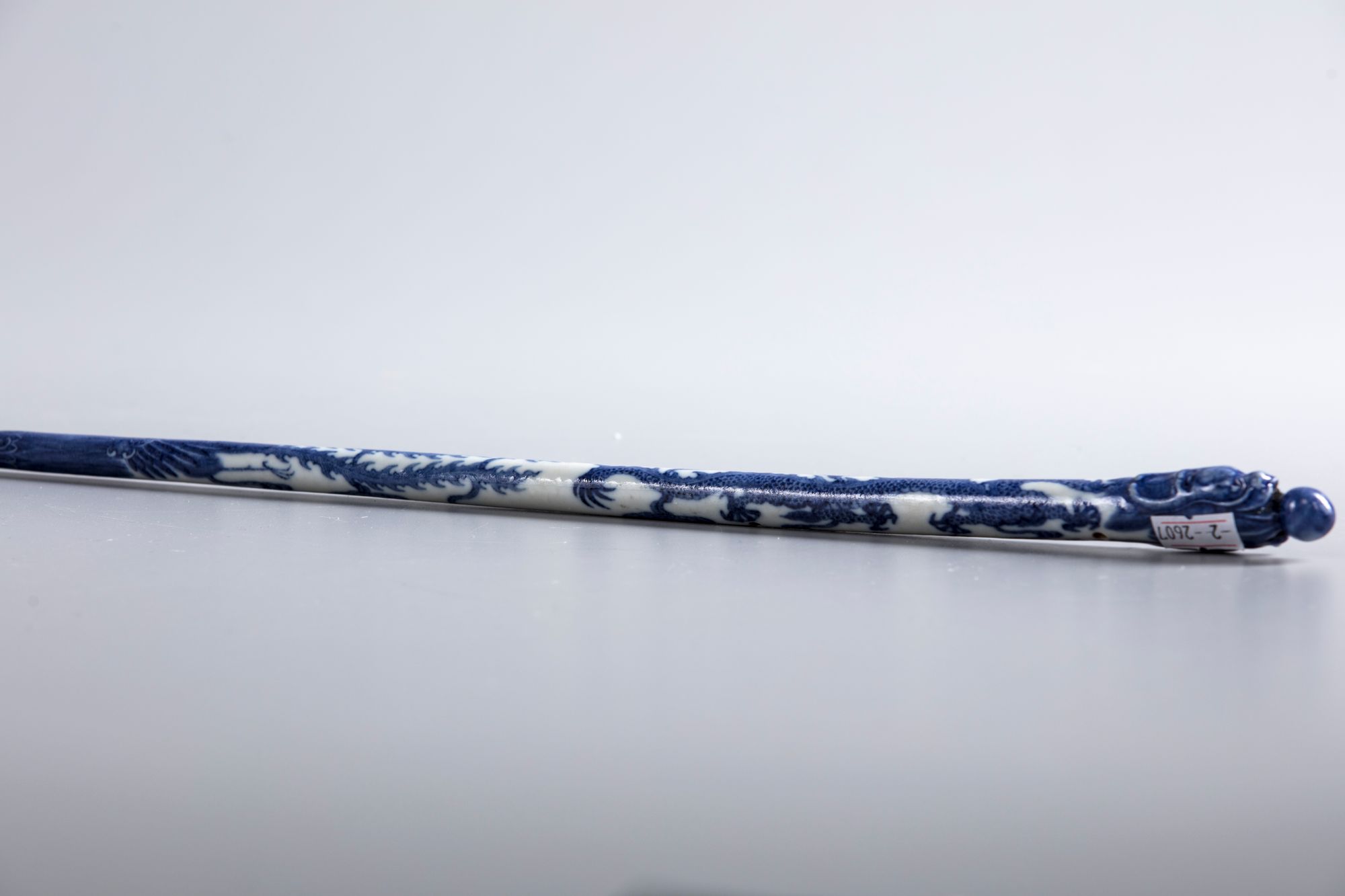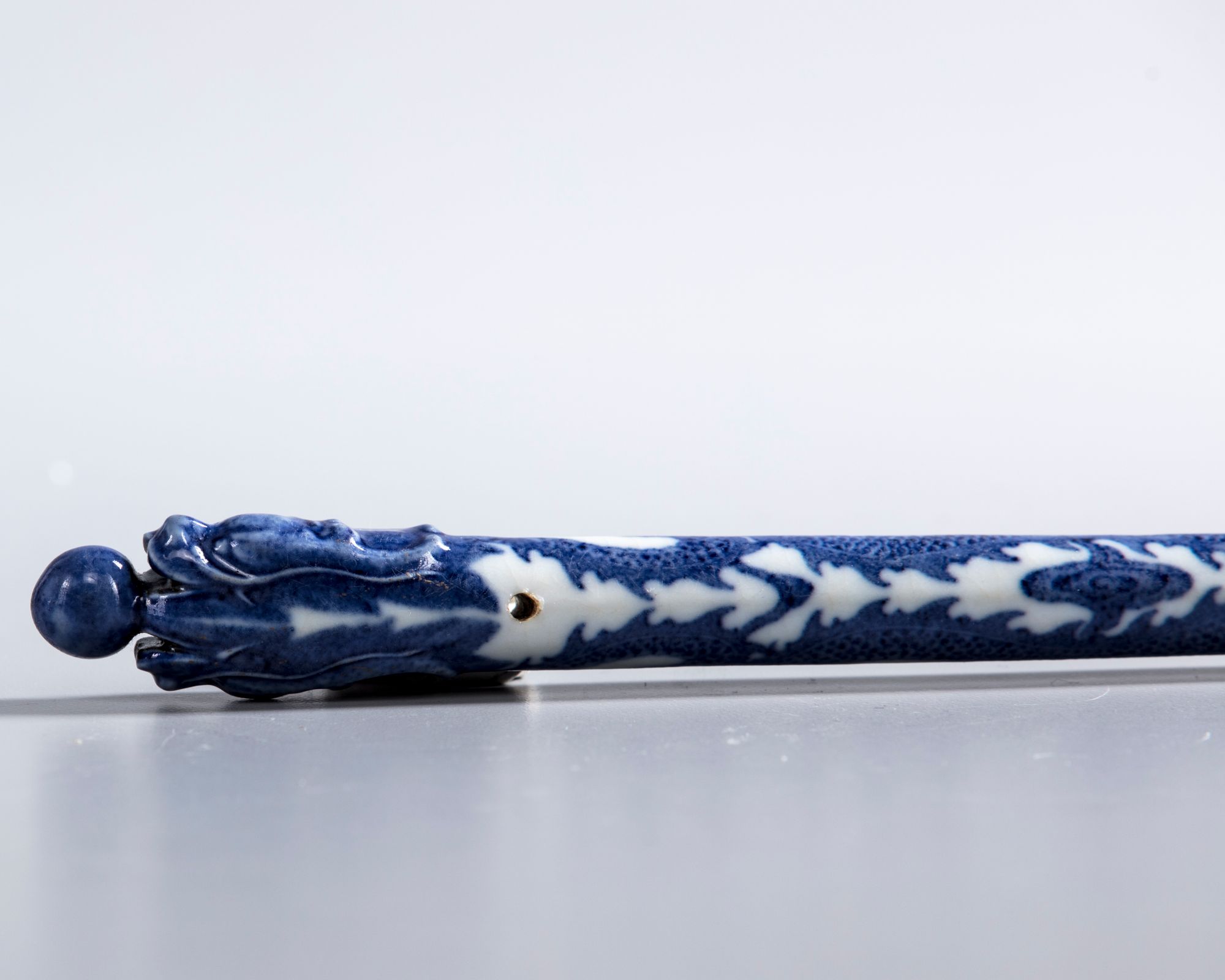 The rod is decorated to the handle with two dragons with moulded heads chasing the flaming pearl which forms the finial of the object. The tapering end is decorated with a single phoenix, with its head forming the tip, all amongst ruyi-shaped clouds. With a wood box.