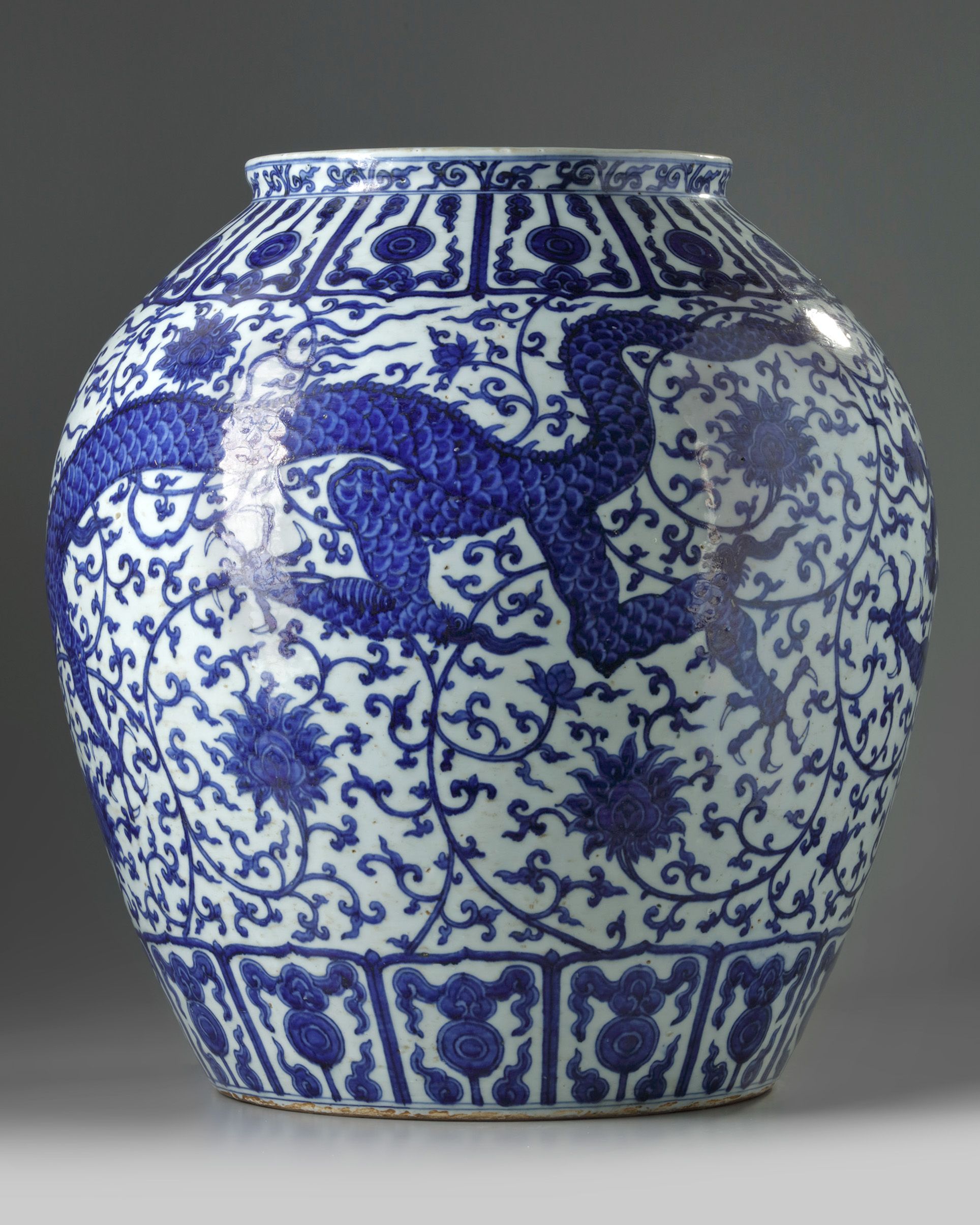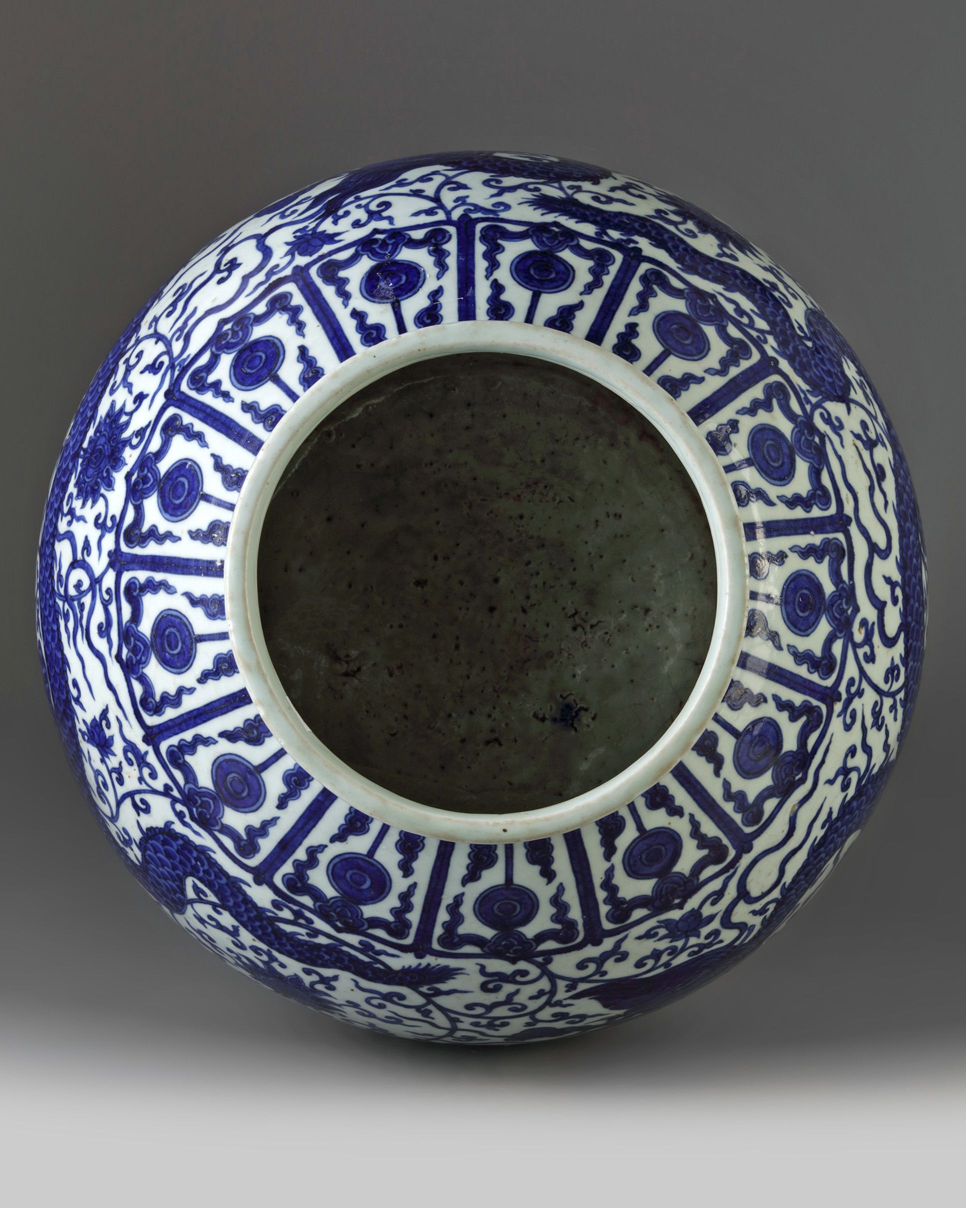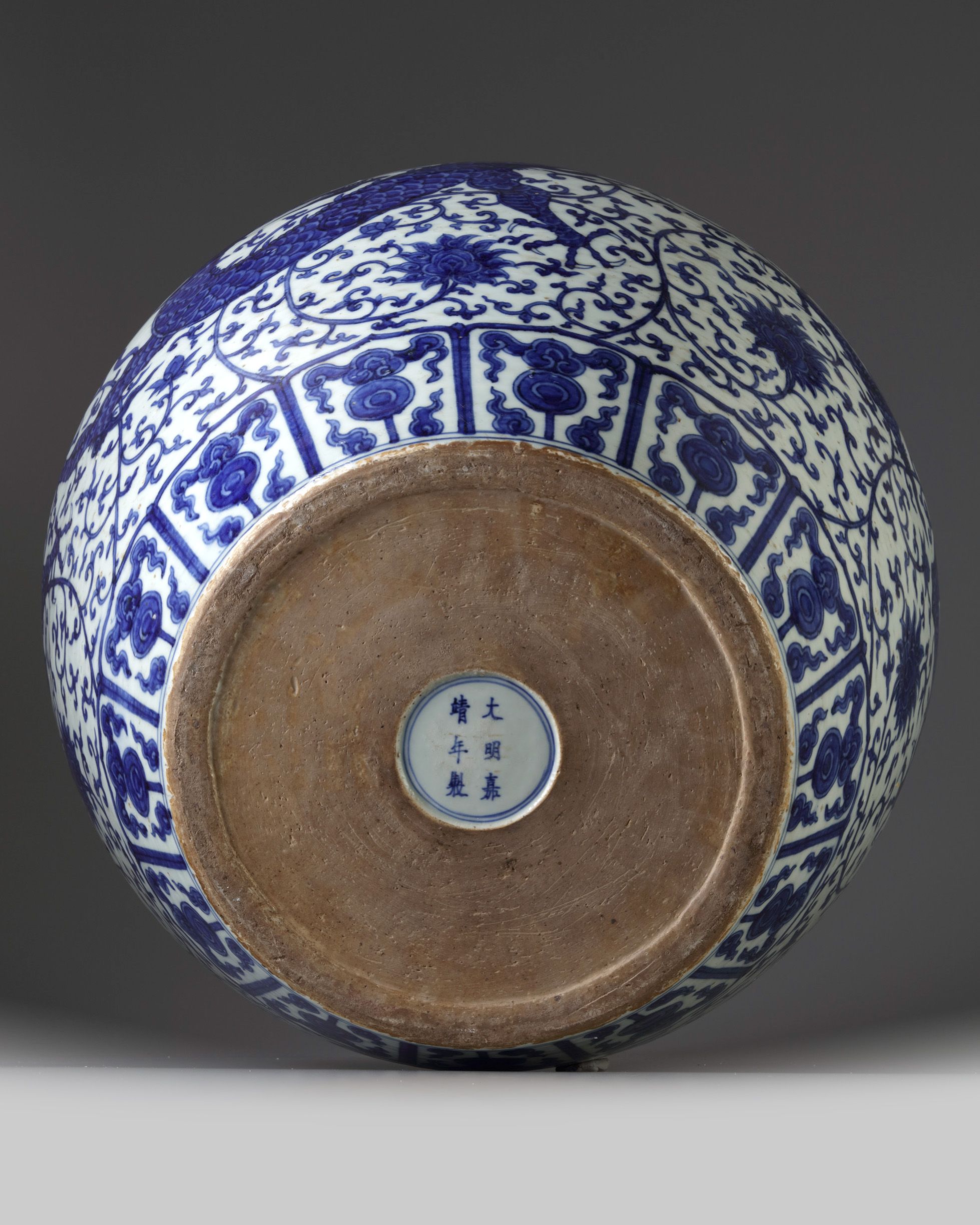 The exterior is decorated in deep cobalt blue tones with two dragons striding through lotus scrolls, between two lappet bands enclosing ruyi-heads and scrolls, all below a band of classic scroll to the rim. There is an apocryphal Jiajing mark to the base.