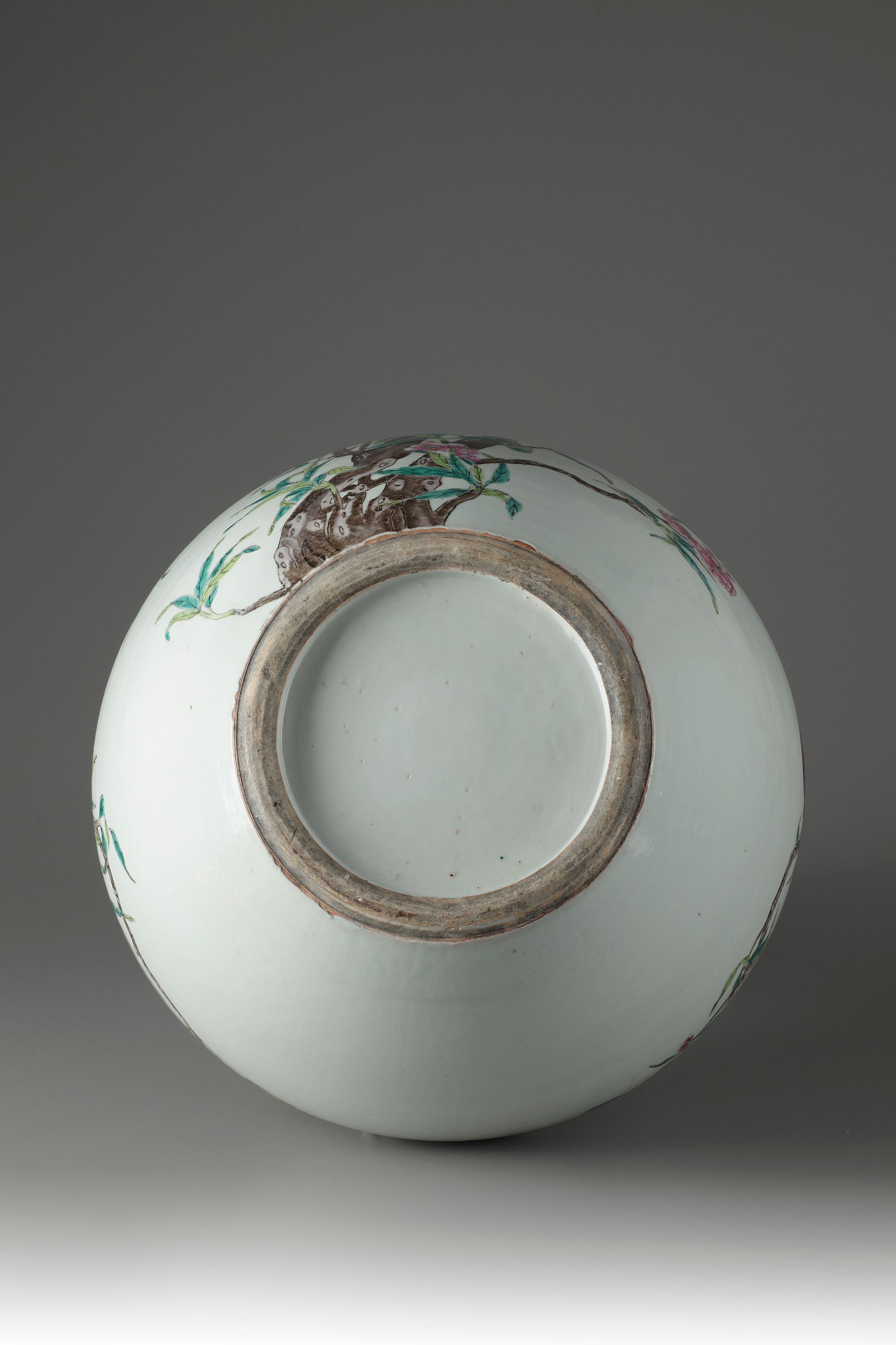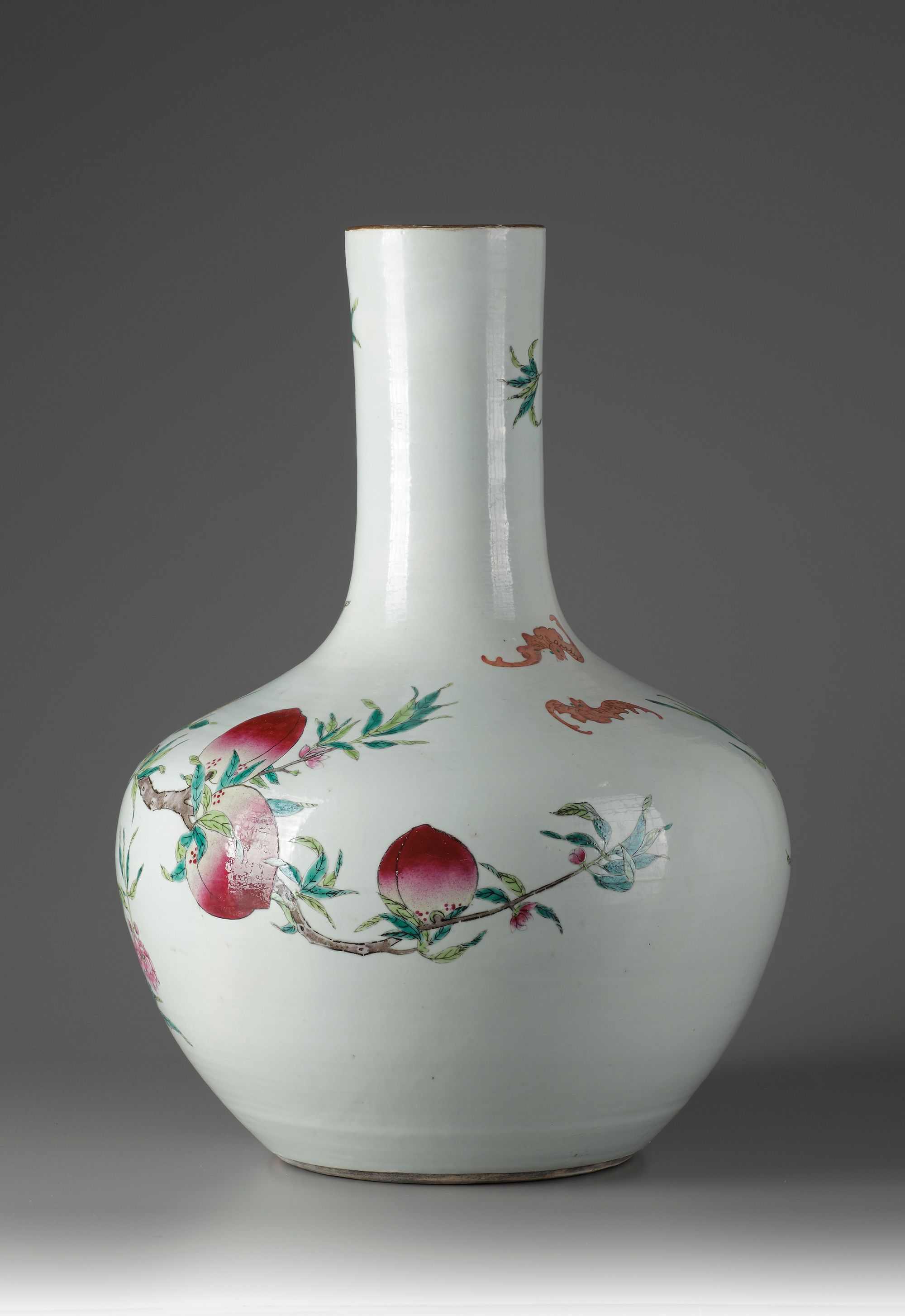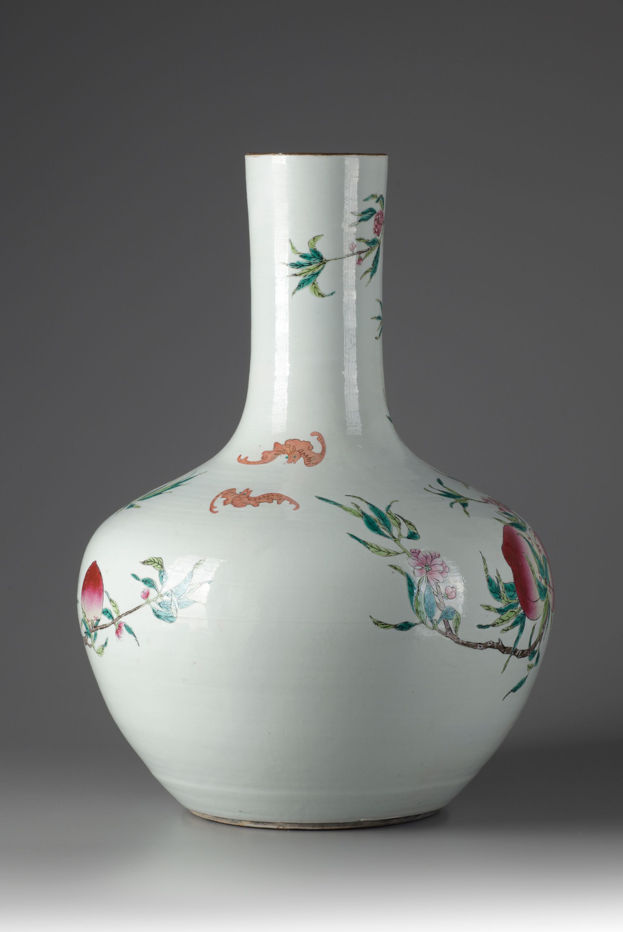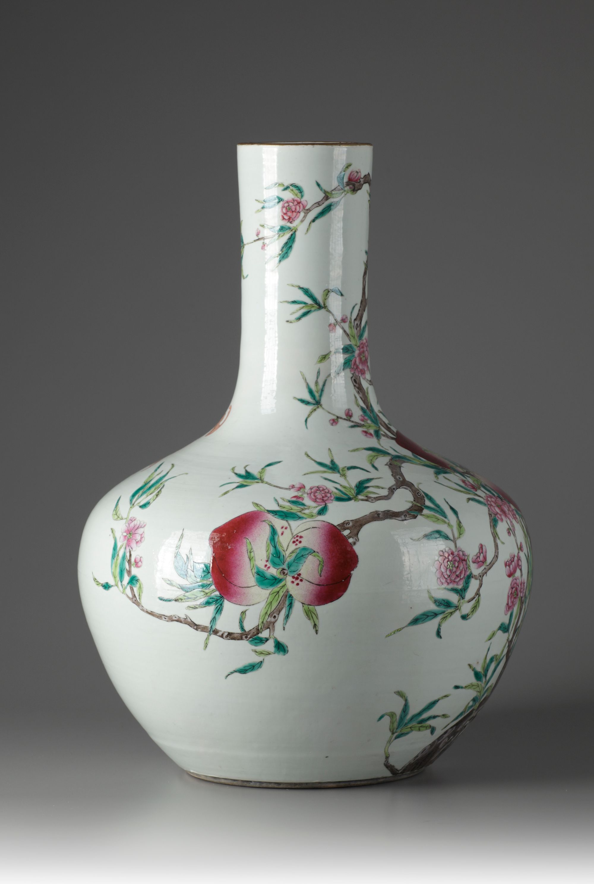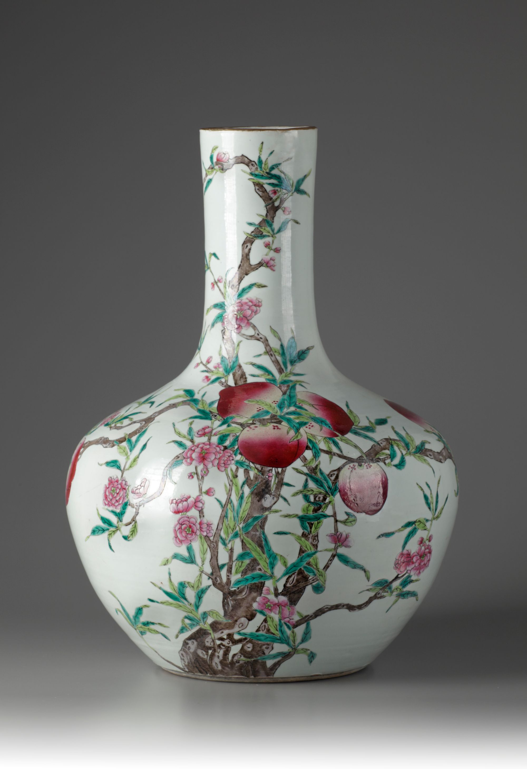 Of tianqiuping form, the globular body rising to a tall cylindrical neck flaring slightly at the rim, brightly enameled to the exterior with gnarled leafy branches issuing nine ripened peaches and flowering blossoms.
