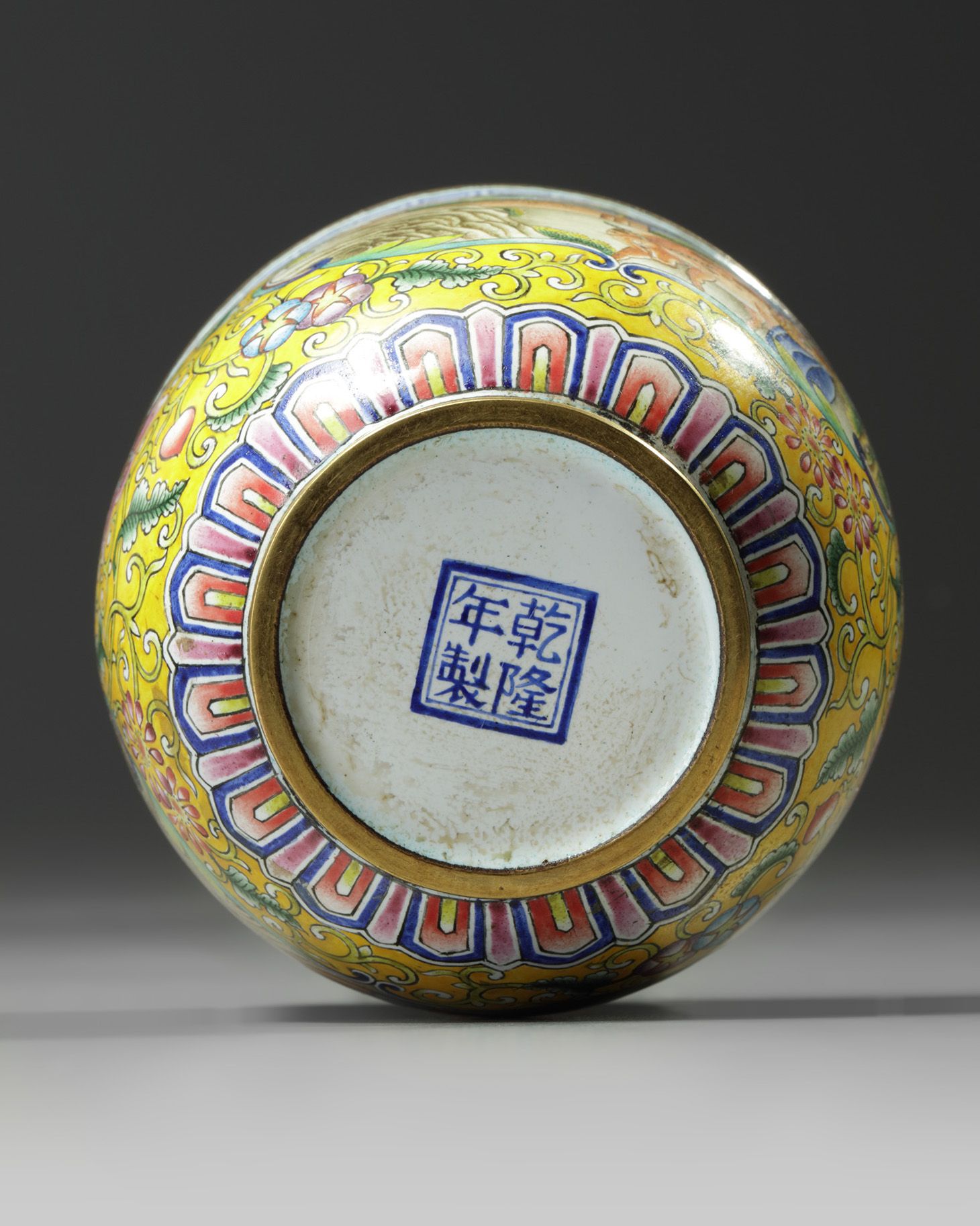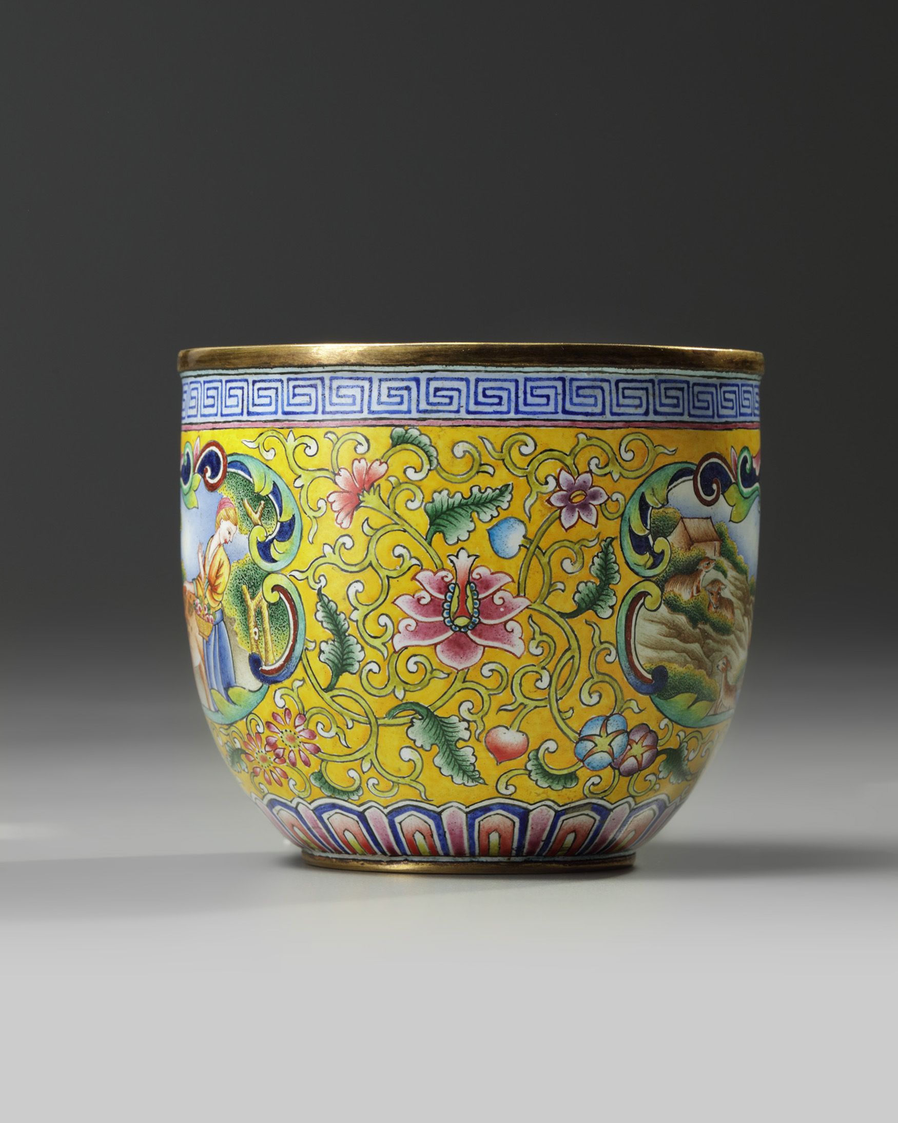 The cup is decorated with two shaped panels, one with a lady carrying a basket of apples next to a water buffalo, and the other with a gentleman reclining with a basket of flowres, all on a yellow ground with lotus scrolls. The base with an apocryphal Qianlong mark.