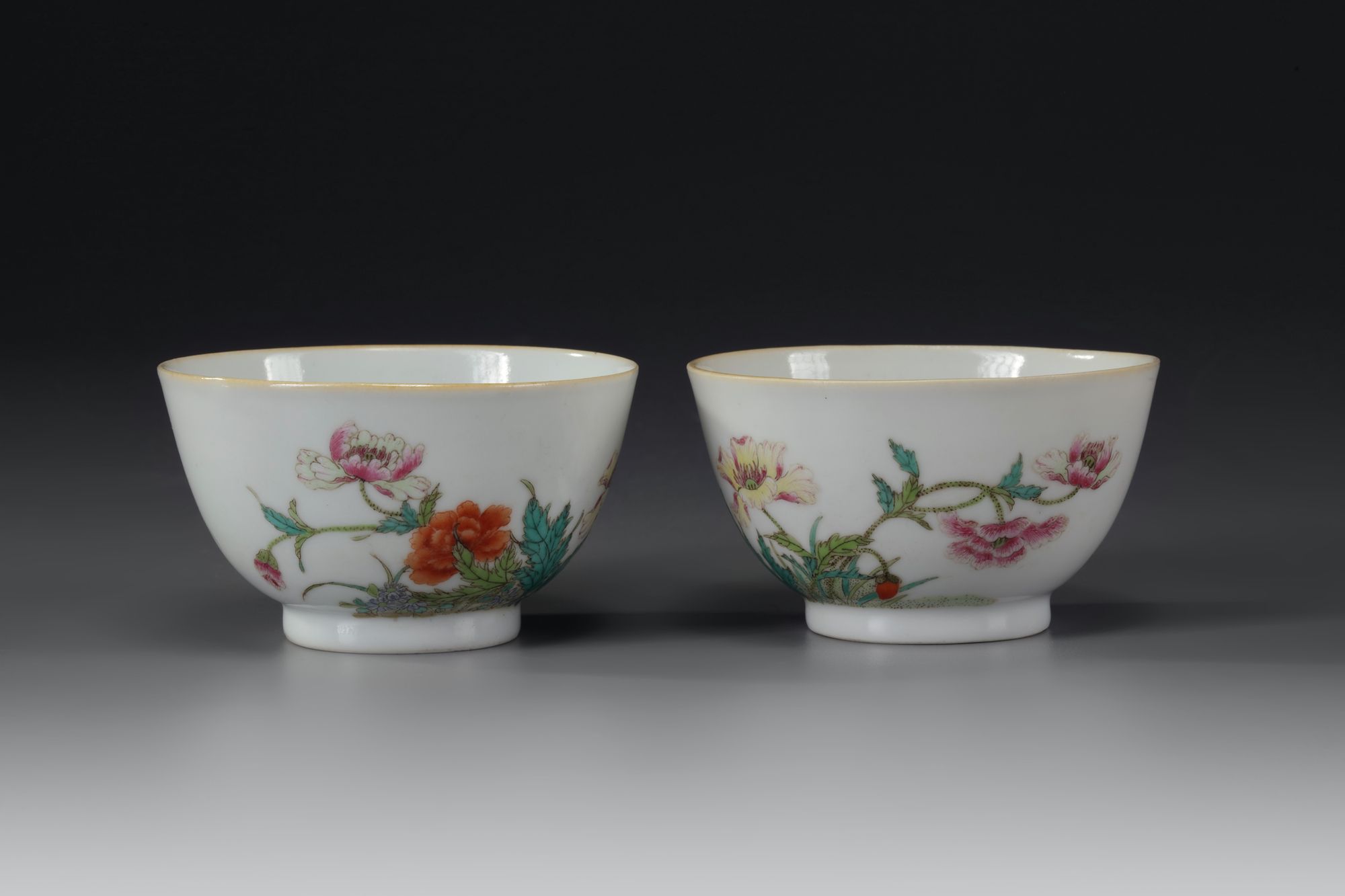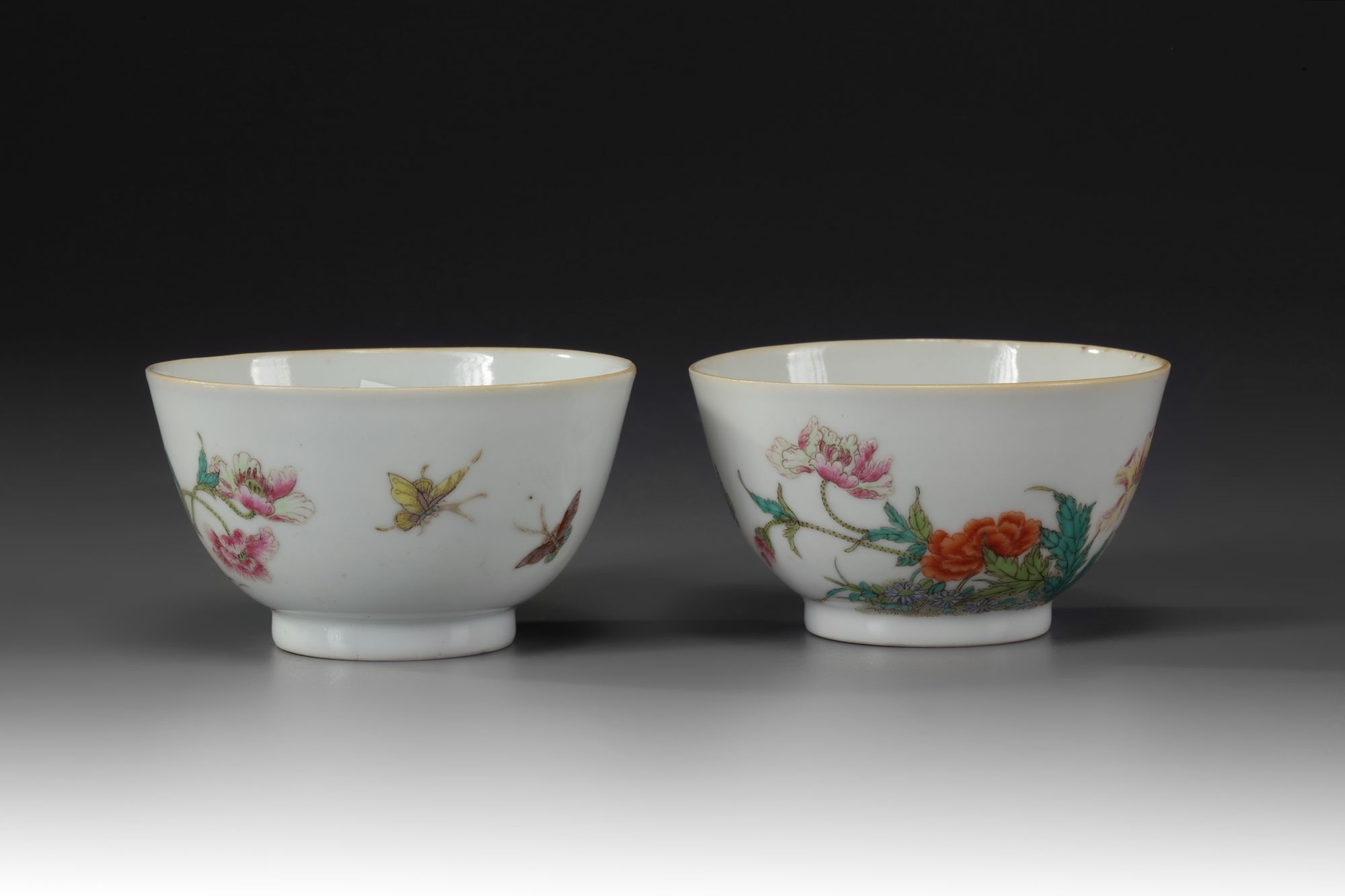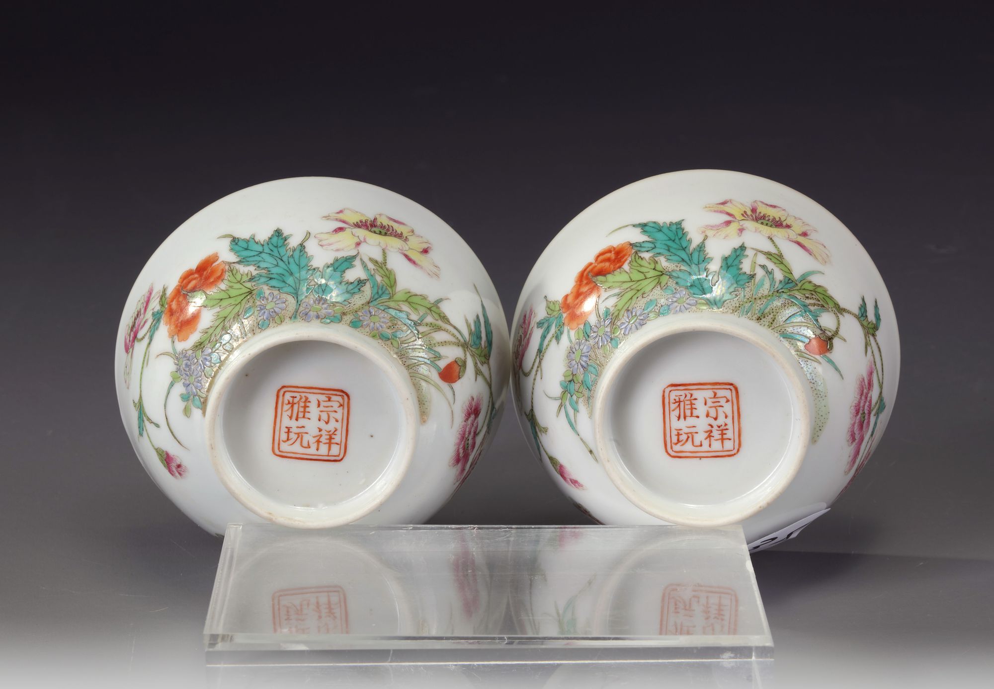 Each bowl is decorated with large blossoming poppies and asters, with two butterflies in flight to the reverse. Each base with a 'zong xiang ya wan' mark in iron red.