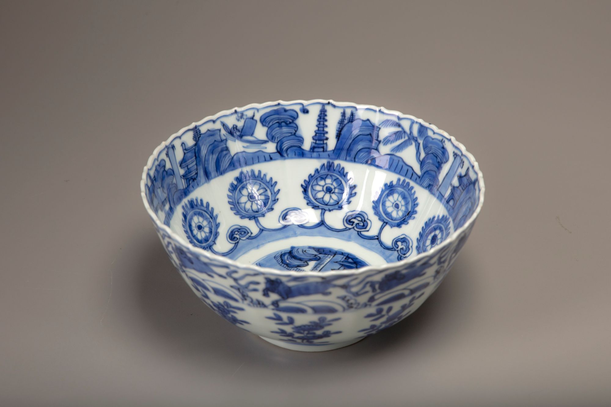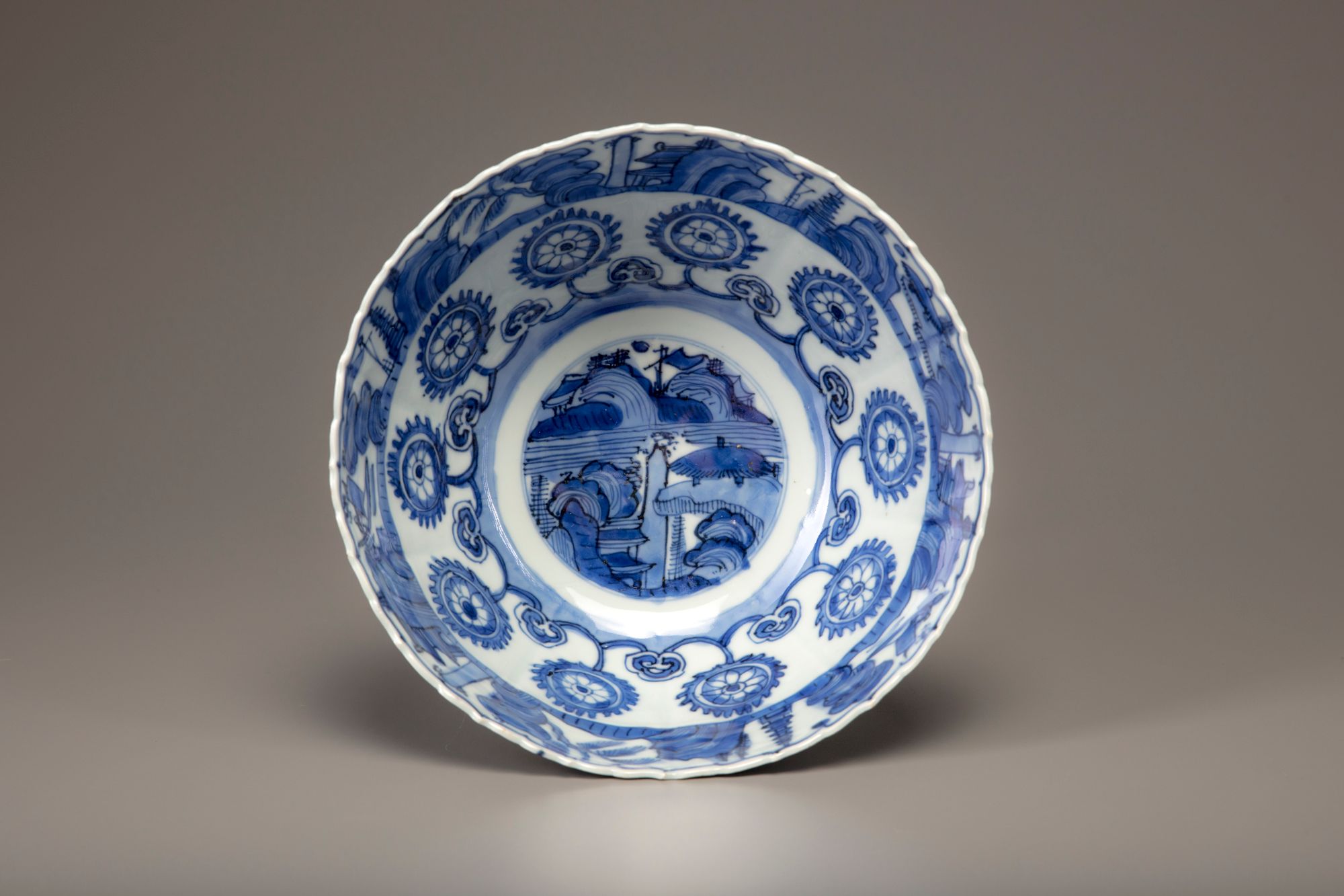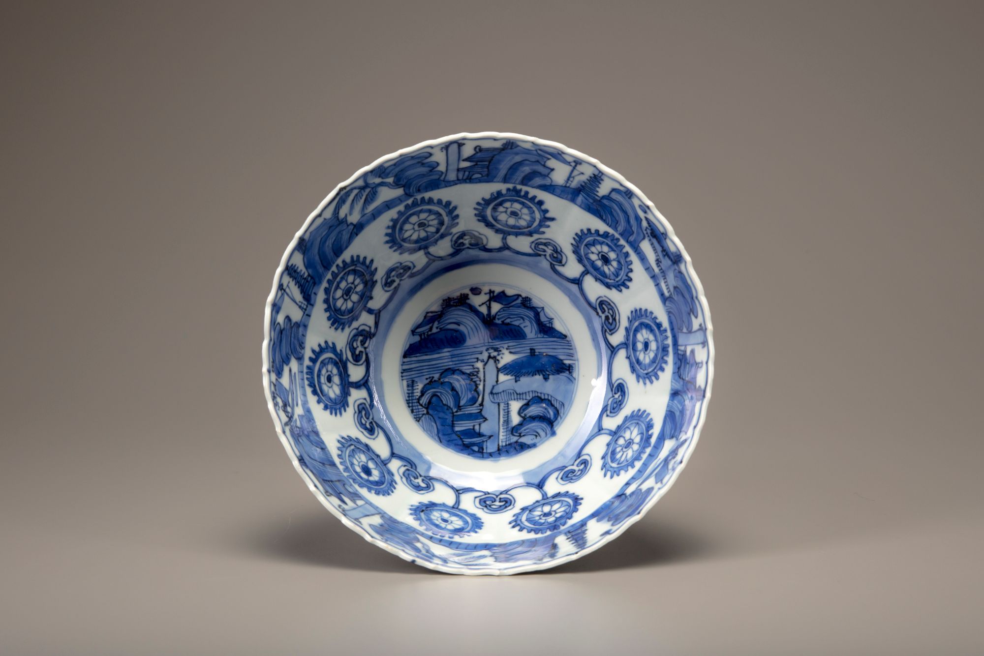 The exterior is decorated with ten panels depicting various flowering branches beneath a flying horse, the interior with a central medallion with a landscape scene and surrounded by a border with flowers and ruyi heads and a band with a continuous landscape scene with trees, rocks, pagodas and boats. The base with a 'Fu Gui Jia Qi' mark.