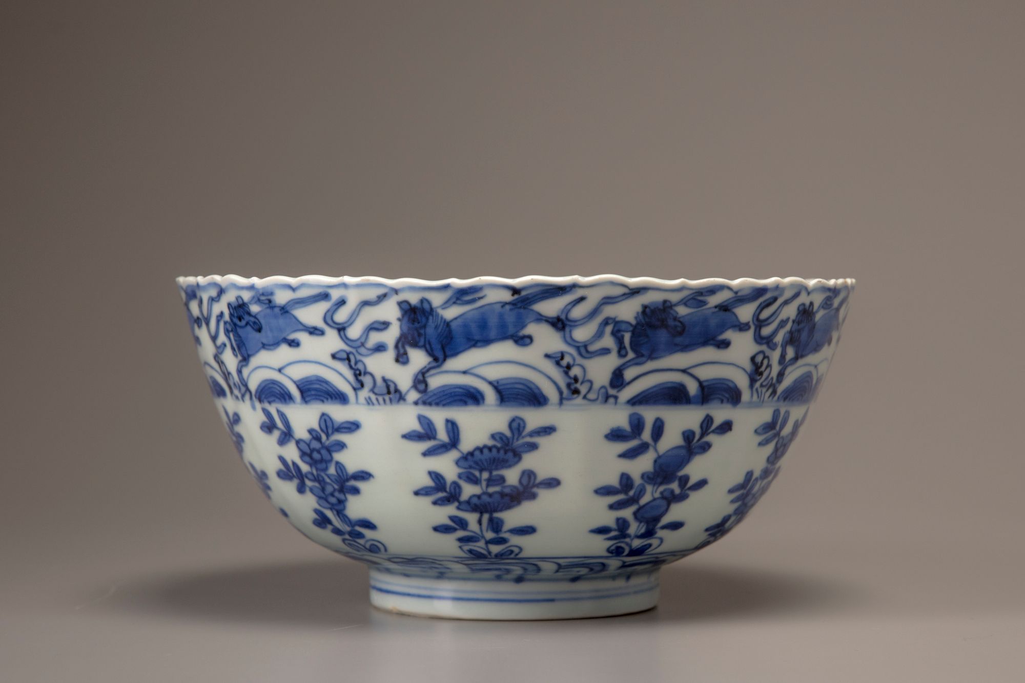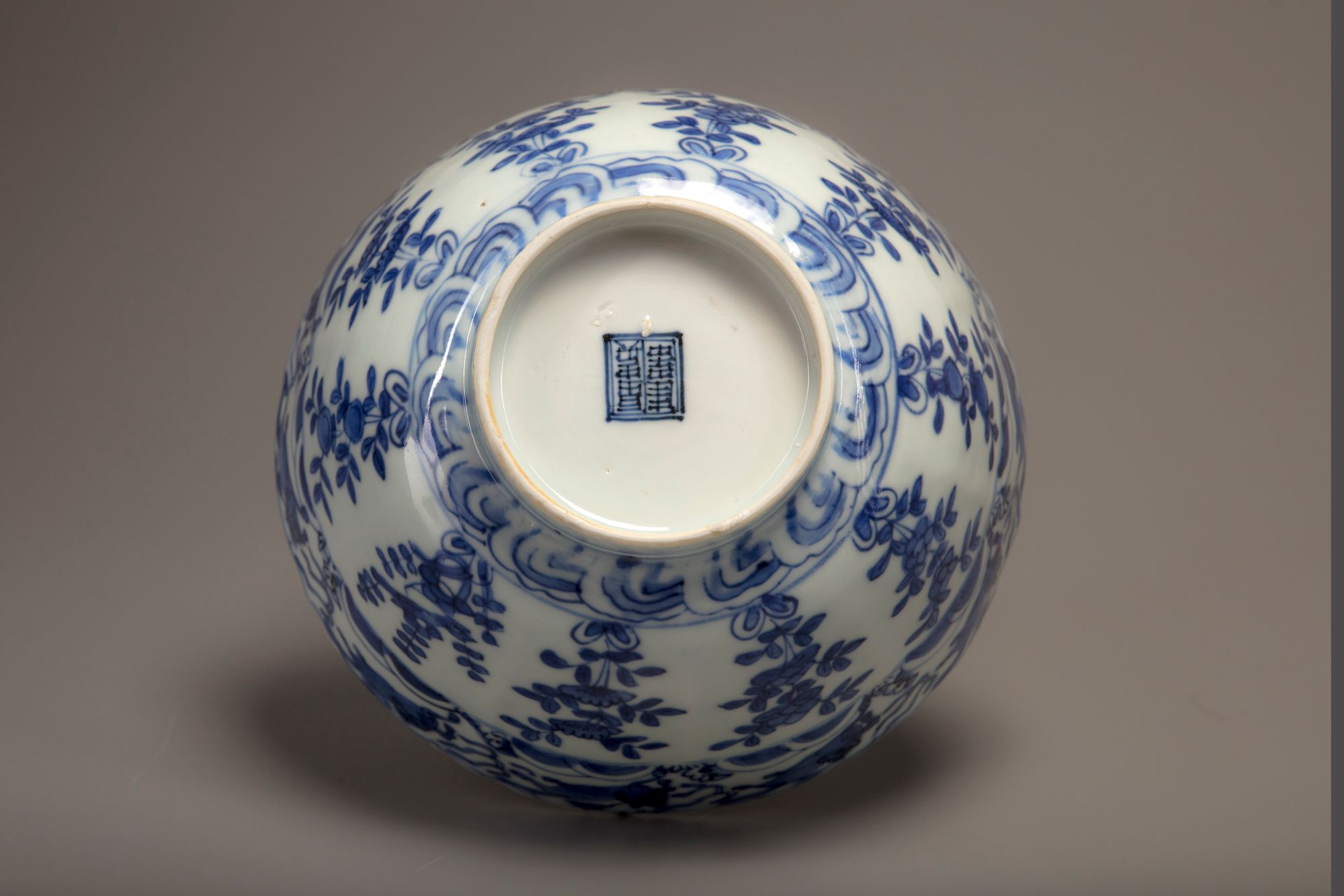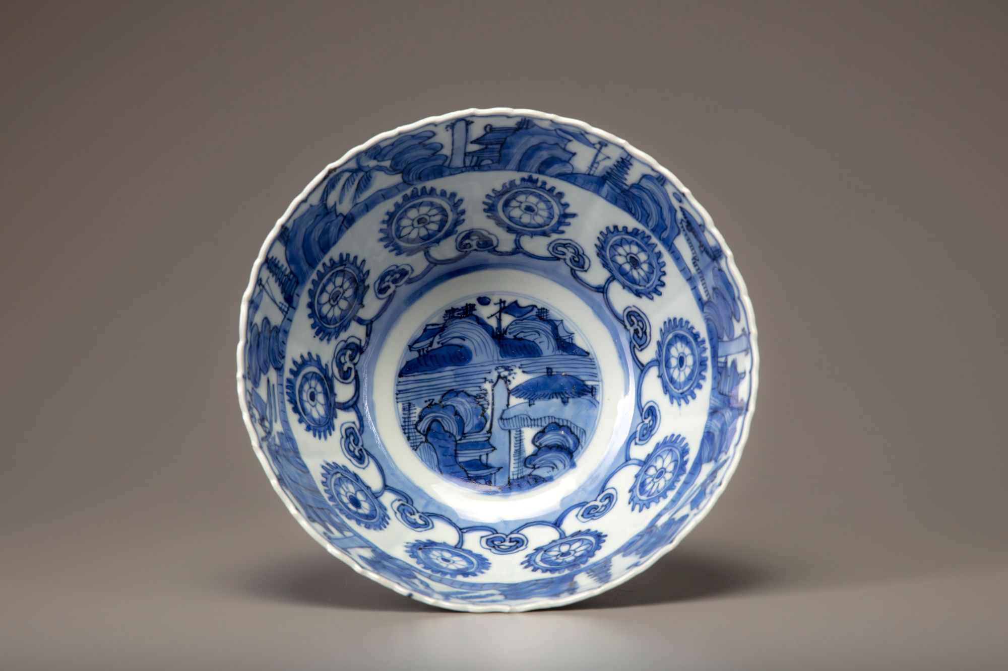 The exterior is decorated with ten panels depicting various flowering branches beneath a flying horse, the interior with a central medallion with a landscape scene and surrounded by a border with flowers and ruyi heads and a band with a continuous landscape scene with trees, rocks, pagodas and boats. The base with a 'Fu Gui Jia Qi' mark.