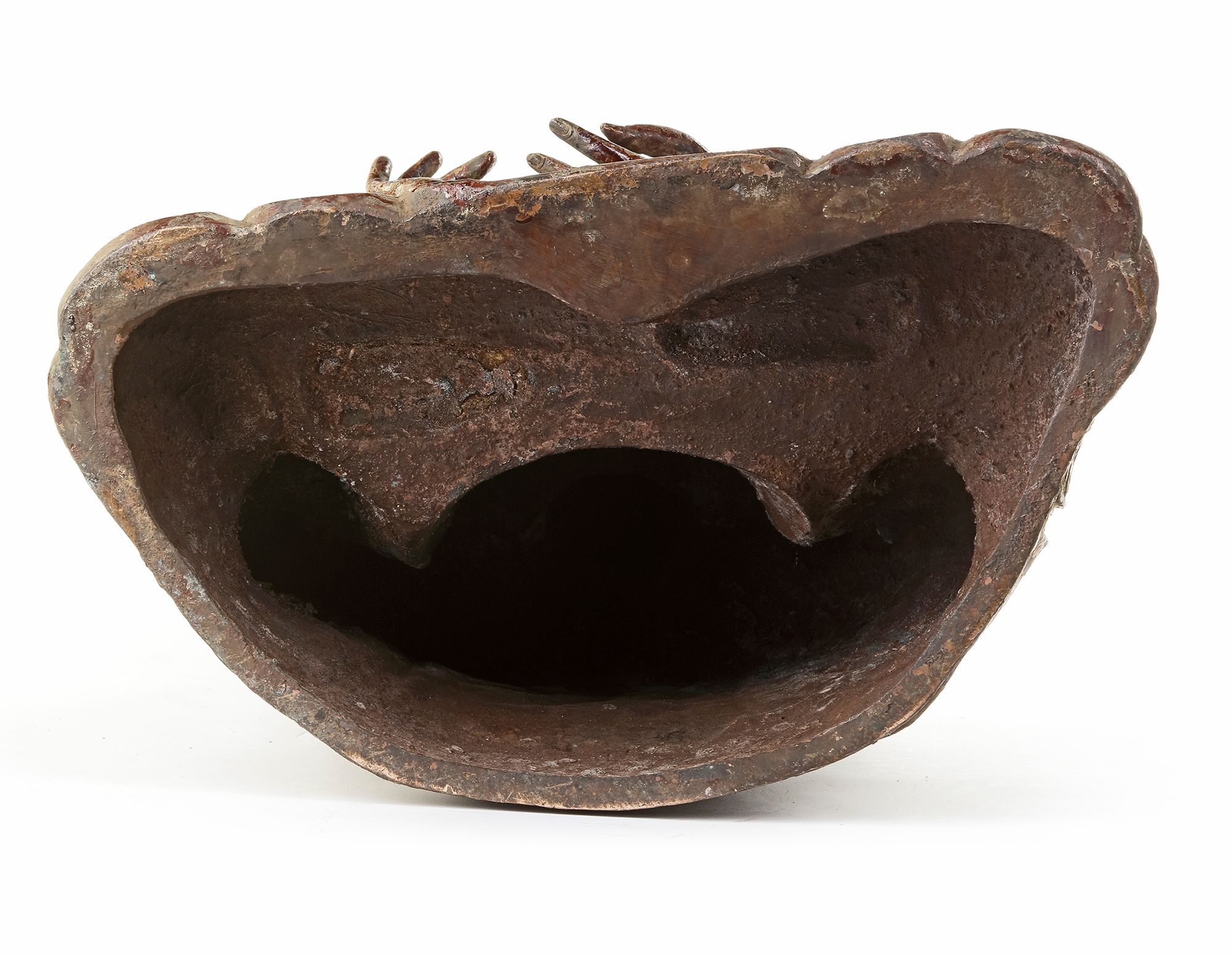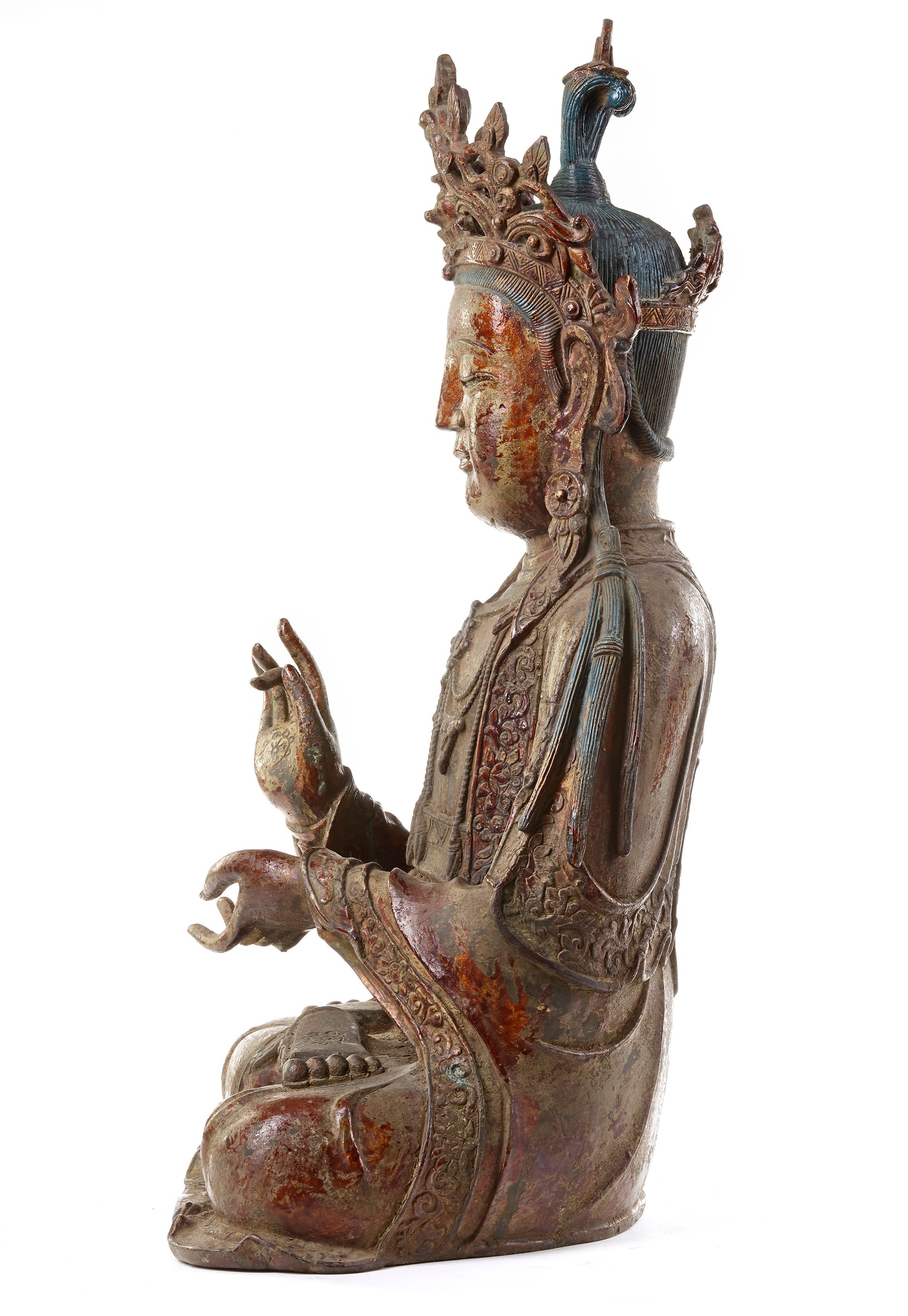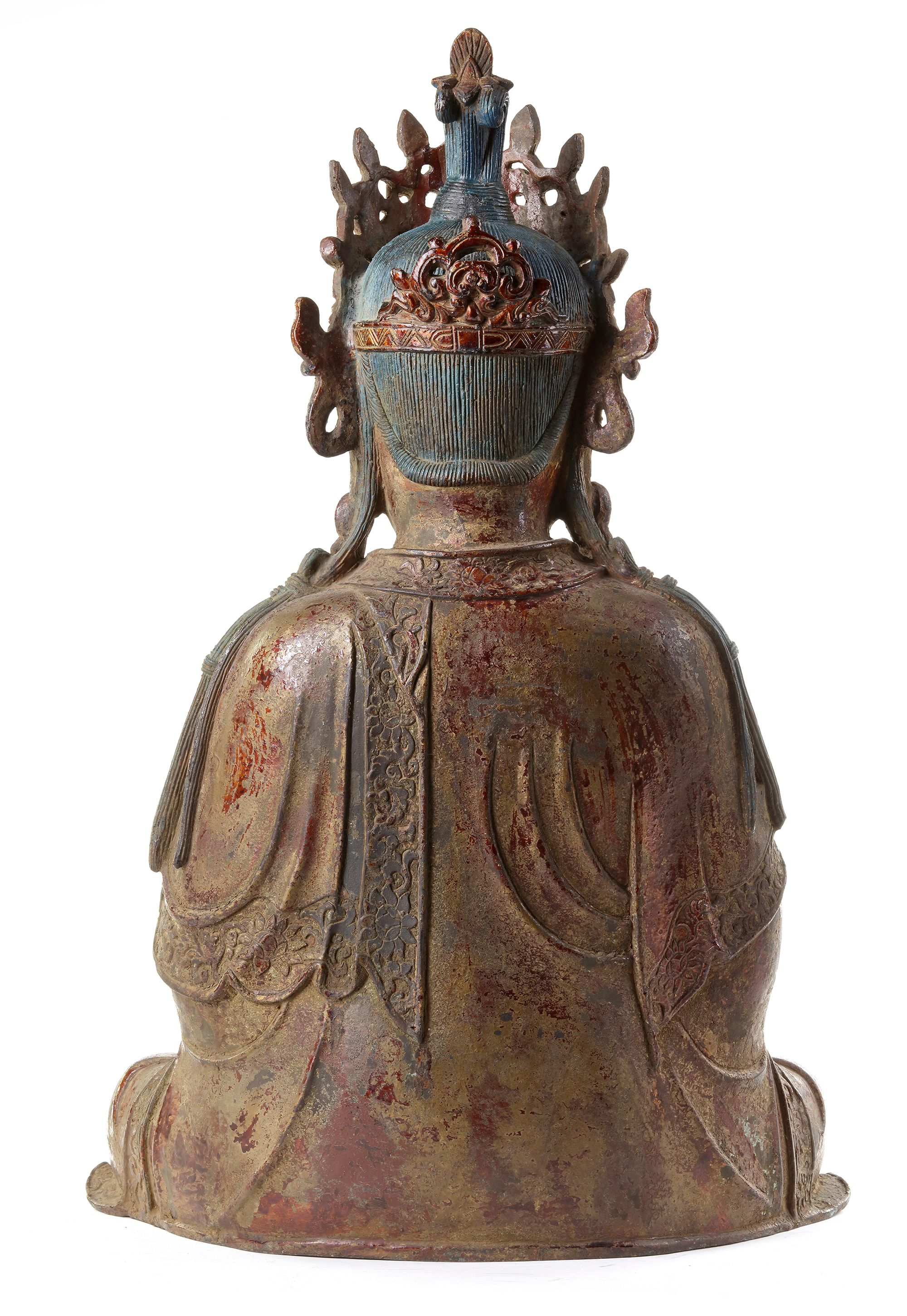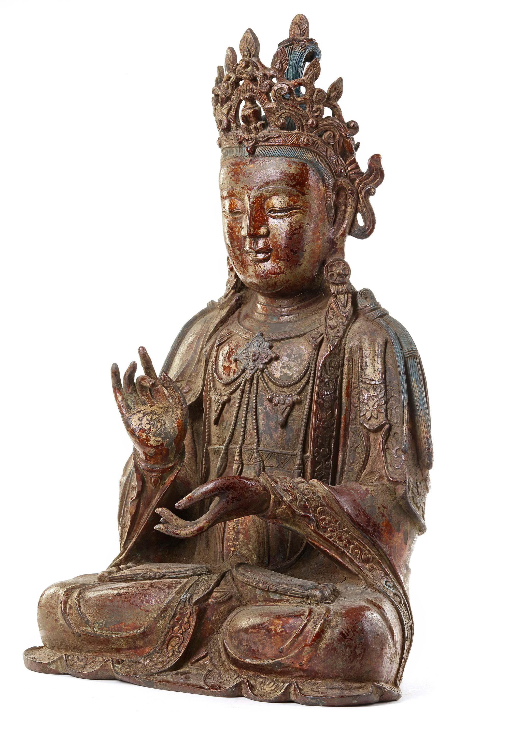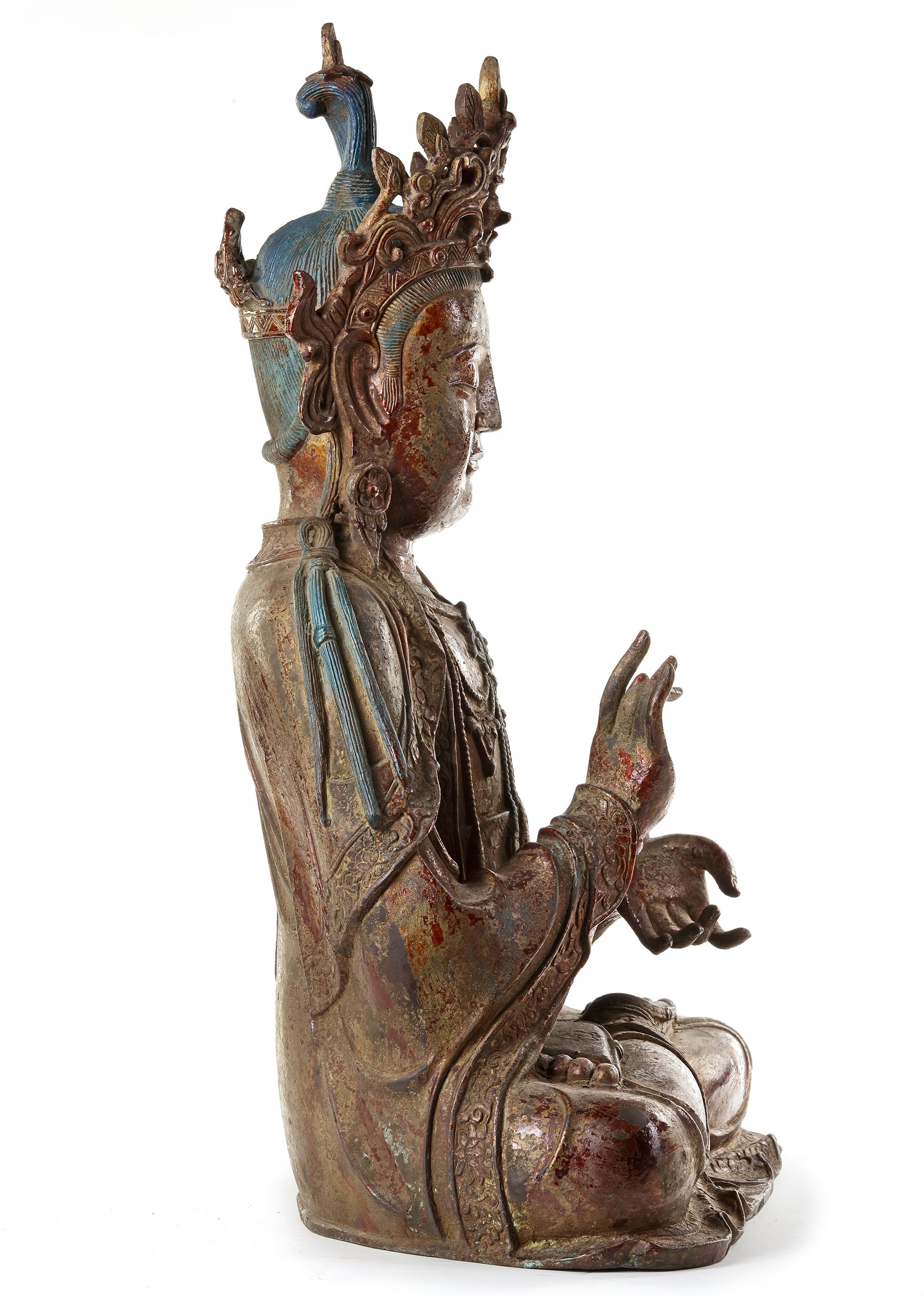 A heavily cast seated dhyanasana, wearing jewels and long robes decorated with flowers at the hem. Her hair is held behind an elaborate crown with Amitabha Buddha in the centre. with one hand held in vitarka mudra and the other one in dhyanamudra. 59 cm. 25.9 kg.