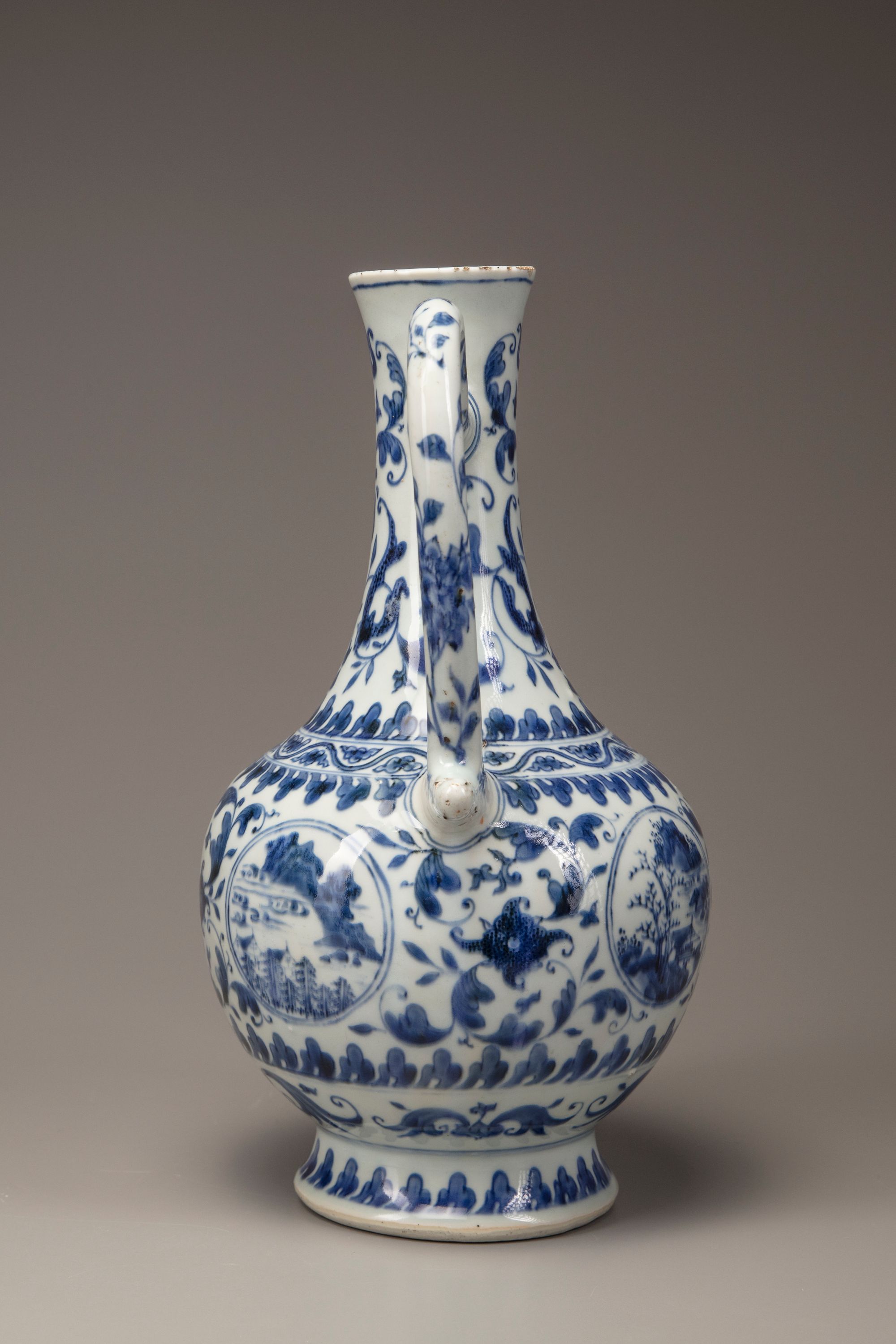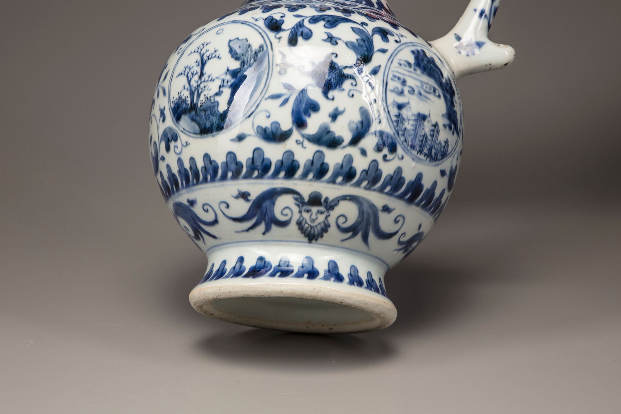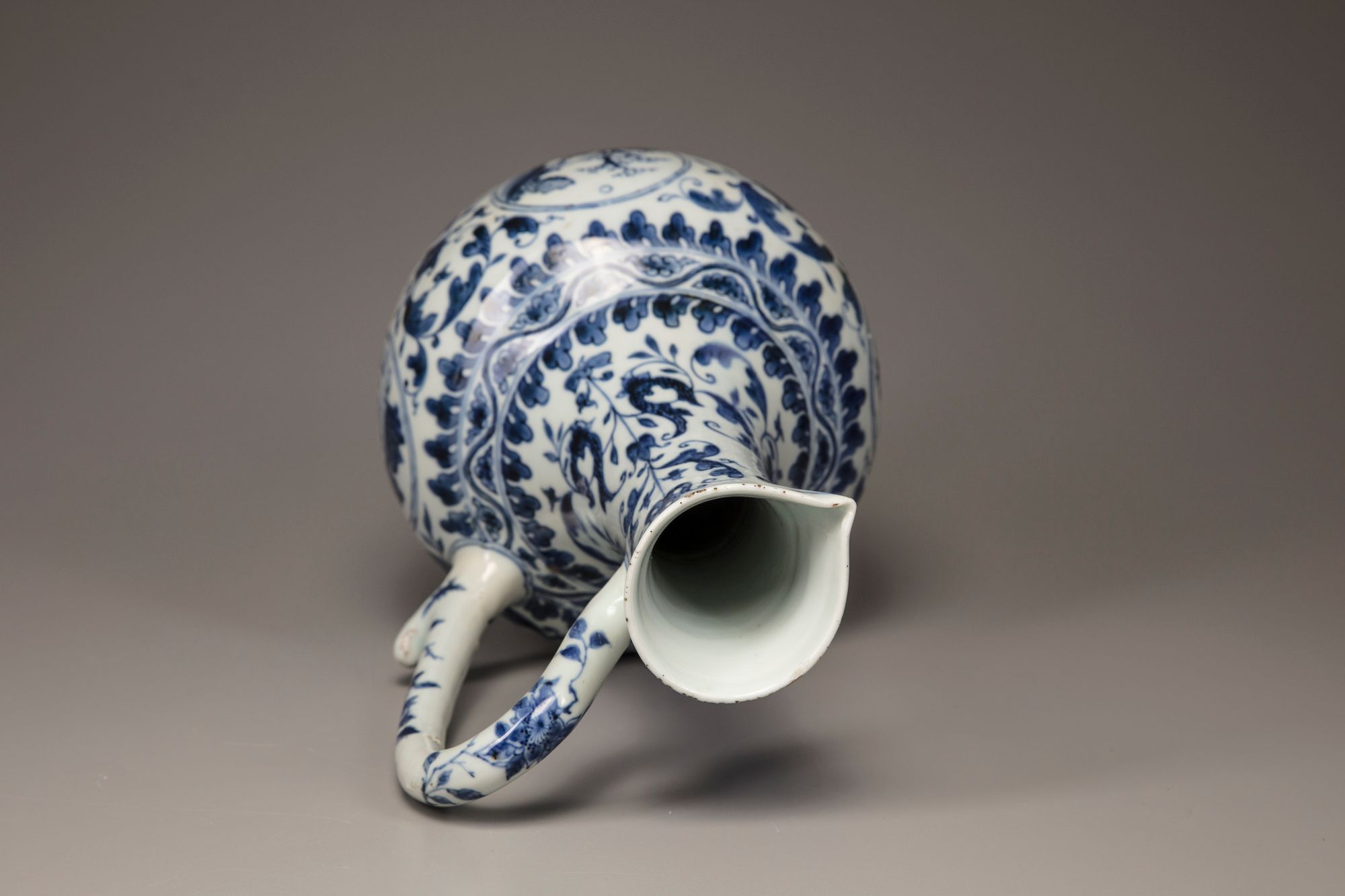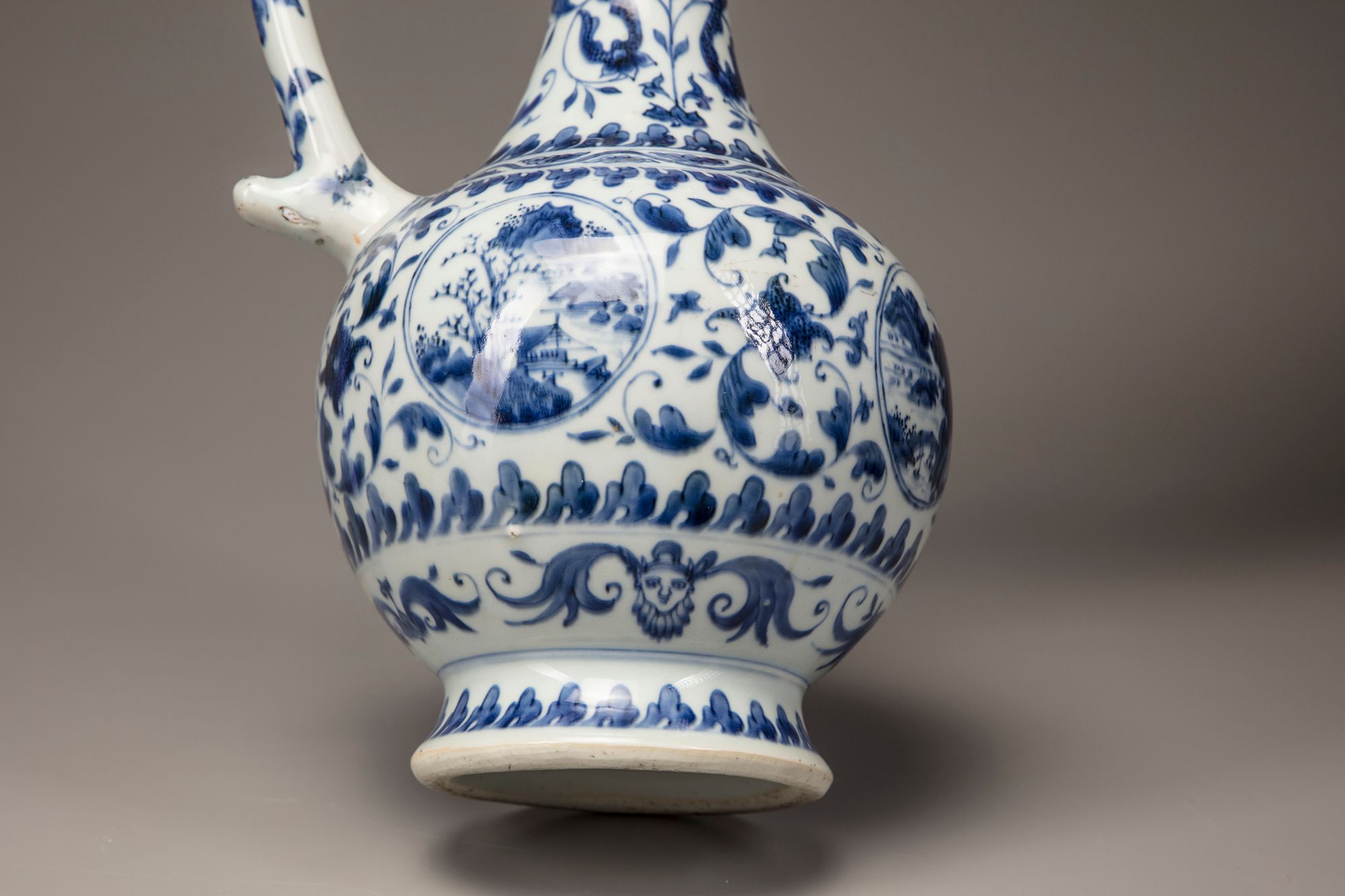 The ewer is fashioned with a slender strap handle decorated with flower sprays and bees. The neck is finely decorated with stylised upright leafy tulip sprays above a petal band. The body is decorated with circular panels enclosing mountainous landscape scenes, interspersed with further bold floral sprays, all above a further petal band and a band of European-style mask heads.
